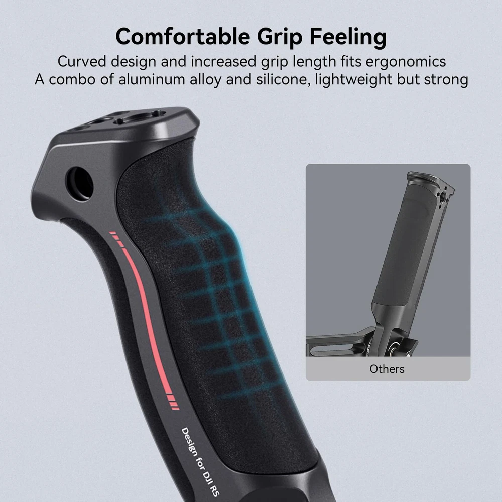 Sling Handgrip for DJI RS 2/RSC 2 3028 Key features: 1. Designed for DJI RS 2/RSC 2 Gimbal. 2. Allows for low angle shot and reduce arm fatigue. 3. Built-in 1/4”-20 threads, ARRI 3/8”-16 locating holes and cold shoe accessory mounts. 4. Tighten by ratchet knob, angle adjustable to 180°, can be used as side grip. 5. Compatible with DJI RS 2 original smartphone mount. 6. Built-in NATO rail with anti-removal spring stud. 7. Matte surface perfectly matches with the industrial design of the stabilizer. Notice: Max Payload: 6 kg Designer: Yetta White Compatibility: For DJI RS 2 For DJI RSC 2 Packing List: 1 x Handgrip Product Dimensions: 134 x 42 x 52.5mm Package Dimensions: 210 x 55 x 55mm Net Weight: 295g Package Weight: 342g Material: Material Aluminum, Silicon ONLY For DJI RS 4 / RS 4 Pro / RS 3 Mini / RS 3 / RS 3 Pro / RS 2 / RSC 2: Sling Handgrip 3028C designed for the DJI RS series reduces arm fatigue and adds stability to low-angle gimbal shots. It can support up to 8 kg / 17.6 lbs and adopts a longer arm bracket, making it more versatile for RS 3 Pro and larger camera setups. Optimized Ergonomic Design: This gimbal sling handle has been updated with a curved design that better fits ergonomics. Its grip length has been increased with finger stops, providing a more comfortable and secure grip for larger hands. Constructed with a combo of silicone and aluminum alloy, it is lightweight but strong. Its sleek design and compact structure match perfectly with the stabilizer. Quick Release Features: It securely attaches to your gimbal with a NATO clamp, with anti-removal stud for safe and quick operation. On this version we integrate a NATO rail on the side, allows for mounting 3026B to provides a good spot for your monitor. Additionally, a QD socket mount is added, providing the option to mount a QD neck (not included) or shoulder strap for additional support. 180 Degree Adjustment: gimbal handgrip offers 180° adjustment through its built-in rosette joint, giving you the flexibility to shoot from various angles and reducing the strain on your arm. The rosette joint can be detached, allowing you to use the handgrip on its own as a rosette handgrip. Abundant Mounting Points: It features multiple 1/4"-20 and 3/8"-16 threads for ARRI, enabling you to mount magic arms 3874 or monitor mounts 2903B. Besides, two cold shoe mounts are situated on top and side, allowing you to attach a wireless mic or video transmitter. Please Note: this handle can ONLY mounts on the left side of the gimbal.
