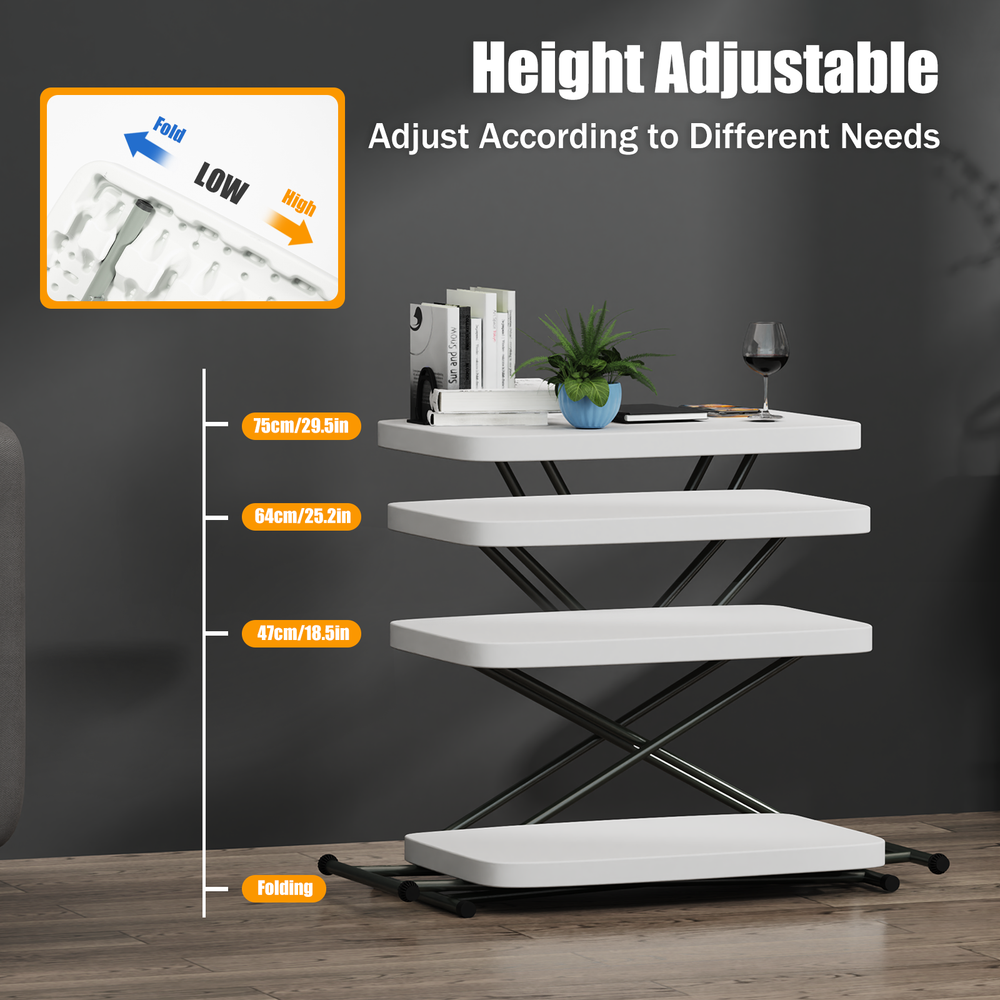 Specifications Material: HDPE, Steel, Plastic Color: White Shape: Rectangular Style: Modern Surface Treatment: Spray Coating Installation Type: Free Standing Special Features: Foldable Assembly Required: Yes Load Capacity: 50kg/110 pounds Gross Weight: 4.7kg/10.36lbs Net Weight: 3.9kg/8.6lbs Product Height: 75cm/29.5in; 64cm/25.2in; 47cm/18.5in Folded Size (L*H): 97*6cm/38.2*2.36in Table Size: 77*50cm/30.3*19.68in Package Size: 89*51.5*6cm/35*20.27*2.36in Package Included 1*Adjustable Folding Table Notes Please allow the slight color difference caused by the shooting light and 1-3cm error due to manual measurement, and make sure you do not mind before you order. Square Folding Laptop Table Small Computer Desk Dining Laptop Tray Adjustable Description Is there a missing table next to your sofa? Is your old coffee table too small to fit your things? Or do you urgently need a side desk where you can work temporarily? I believe this is the table you are looking for! Our adjustable folding table design provides a more personalized experience and convenience. Not only does it have enough space to store your items, but its unique design also allows for easy folding and opening. When you're not in the mood to sit at the dining table and want to relax and eat in front of the TV, it's your ideal choice! Key Features Minimalist Appearance: Its smooth lines and classic white bring charming decoration, creating a unique and exquisite charm that shines in your home. Large Capacity: Its large desktop (30.3*19.68in) allows you to place more items, providing enough space to store coffee, snacks, vases, etc. It is ideal for enjoying with family and friends, creating a happy leisure time! High Stability: The sturdy steel pipes, combined with the X-shaped structure, enable it to bear a weight of up to 110 pounds, ensuring stability without shaking, and allowing you to use it with confidence. Height Adjustable: 8 grooves are specially designed for height adjustment, making it convenient for you to adjust according to different needs, ensuring that you can always find a comfortable posture and suitable height. Easy Folding: The lightweight (8.6lbs) and foldable design allows you to easily fold it into a thinner body(2.36in) and store it under the sofa or in other concealed places. Of course, casually leaning it against the wall is also very space-saving and convenient. Selected Materials: The sturdy and lightweight HDPE board and spraying steel pipes make it strong, especially suitable for daily use, maintaining good function and condition for a long time. Easy Assembly: Simple structure and clear components can help you achieve fast and easy assembly. Come and enjoy the sense of achievement from components to finished products by yourself! Easy to Clean: The smooth surface and simple and intuitive structure allow you to simply wipe the table with a damp cloth to make it look brand new. Details Foot Pads: They can further maintain the stability of the product while protecting the floor from scratches. Practical Crossbars: The two bottom crossbars allow you to place your feet in a more comfortable place. Application It is an excellent companion for camping, picnicking, barbecuing, traveling, backyard gatherings, fishing, beaches, valleys, lakes, and various other outdoor camping sites. It can also be used as an indoor dining table, TV tray, small table, coffee table tray, game table, picnic table, etc. in daily life. Specifications Material: HDPE, Steel, Plastic Color: White Shape: Rectangular Style: Modern Surface Treatment: Spray Coating Installation Type: Free Standing Special Features: Foldable Assembly Required: Yes Load Capacity: 50kg/110 pounds Gross Weight: 4.7kg/10.36lbs Net Weight: 3.9kg/8.6lbs Product Height: 75cm/29.5in; 64cm/25.2in; 47cm/18.5in Folded Size (L*H): 97*6cm/38.2*2.36in Table Size: 77*50cm/30.3*19.68in Package Size: 89*51.5*6cm/35*20.27*2.36in Package Included 1*Adjustable Folding Table Notes Please allow the slight color difference caused by the shooting light and 1-3cm error due to manual measurement, and make sure you do not mind before you order. Payment Delivery details Terms of sales About us Contact us Payment We accept ebay payment 。 Fees such as import duties, taxes are not included in the item price or shipping costs. These charges are the buyer's responsibility. Delivery details Shipping: 2-9 working days to: USA Terms of sales We maintain high standards of excellence and strive for hundred percent customer satisfaction. Feedback is very important to us. We hope that you contact us immediately before you give neutral or negative feedback, so that we can address your concerns. It is impossible to address issues if we do not know about them! About us Your satis faction is our ultimate goal. We work hard to earn your trust and future business. Our certified technicians have tested each item before shipping. The unit comes with 1 year limited warranty on all manufacturing defects. a) If you receive a defective item, you may return it or ask for a discount. Please contact us within 14 days after you receive the package. b) What you returned must be intact and in its original packaging as re? u. Customer is responsible for shipping costs of the returned item. c) We will cover the cost of shipping back t with the shipping rate indicated in the registration page. We will send you a new unit or refund the full payment you paid. Thank you. Contact us Business Hour Business Hour: Monday To Friday: 8:30 AM to 5:00 PM (Beijing China time) Due to time zones, our reply to your questions may not be immediately. But within above working time, we will reply your email within 24 hours. If it's non-workdays, please kindly be patient and wait till Monday. Please contact us with ebay message. Please feel free to contact us if you have any questions. Monday To Friday: 8:30 AM to 5:00 PM (Beijing China time) Due to time zones, our reply to your questions may not be immediately. But within above w