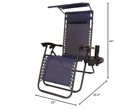 Shape: Rectangular Number of Cup Holders: 1 Finish Type: Glossy Pattern: Solid Form Factor: Foldable Item Length: 1 Type: Does Not Apply Room Type: Patio Garden Arm Style: Arm rest Item Weight: 30 pounds Brand: Does Not Apply Item Height: 1 Model Name: Does Not Apply Tilting: No UPC: 070513250469 Product Care Instructions: Wipe Clean Furniture Finish: Plastic Is Foldable: Yes Leg Style: Straight Leg Global Trade Identification Number: 00070513250469 Is Customizable: No Back Style: Solid Back Size: Two Piece Style: Modern Fill Material: Foam Age Range Description: Adult Recommended Uses For Product: Beach,Lounge,Outdoor Seat Depth: 13 inches Item Width: 1 Manufacturer: Does Not Apply Unit Count: 2.0 Count MPN: Does Not Apply EAN: Does Not Apply Surface Recommendation: Hard Floor Theme: Outdoor Activities & Relaxation Country of Origin: China Included Components: Gravity Chair and Cup Holder Cushion Style: Plain gtin13: Does Not Apply Color: Blue With Canopy Indoor Outdoor Usage: Outdoor Product Dimensions: 32.5"D x 25"W x 44"H Maximum Weight Recommendation: 350 Pounds Special Feature: Adjustable, Foldable, Lightweight, Portable, Removable, Sturdy, A