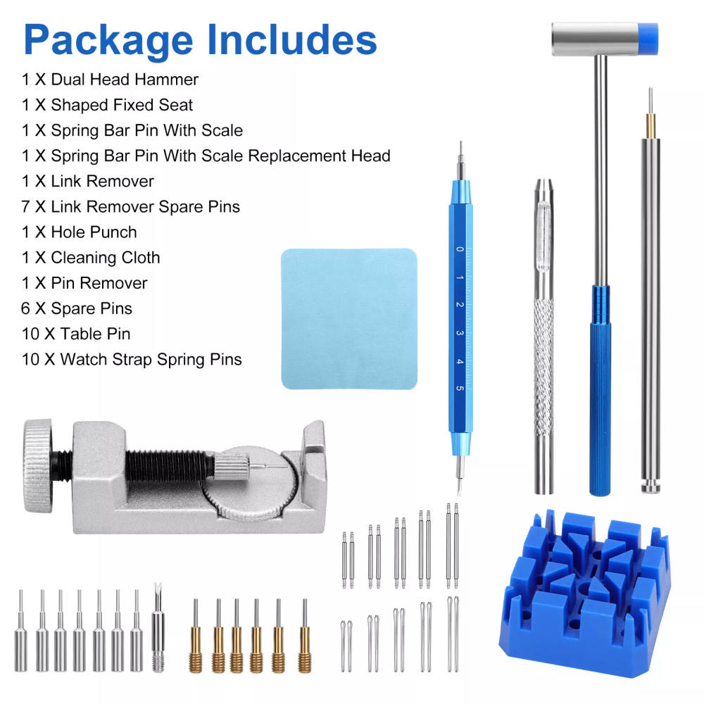 To our esteemed customers Hello! If you buy the package in our store any after-sales problems please do not worry, we will certainly solve the problem for you, please feel free to contact us by mail, we will communicate with you within 24 hours to confirm the program you provide, 100% satisfaction to solve your problem! Thank you for every purchase in our store, wish you a happy ~! Adjustment Watch Band Strap Link Pin Remover Spring Bar Repair Resizing Tool Kit Product Feature π Watch Repair Tool Kit: Our watch tool kit includes everything you need for watch link removal, watch resizing, watch repair, and watch band strap pins replacement, ensuring it fits your wrist just right. π Two Strap Remover with Use: The metal strap remover is more suitable for taking out the strap pin directly; watch bracket and double-headed hammer is convenient to insert the strap pin, two tools with use more convenient. π Watch Strap Removal Tool: In addition to removing and replacing watch bands, the watch spring bar tool is easy to use and allows you to directly measure the length of the spring bar without having to find an additional ruler. π Easy-Peasy Watch Repair for Everyone: You don't need to be a watch pro to use our watch band tool kit. It's user-friendly and perfect for both newbies and watch enthusiasts. Best gift for husband, man, or father. Package Included π 1 X Dual Head Hammer π 1 X Shaped Fixed Seat π 1 X Spring Bar Pin With Scale π 1 X Spring Bar Pin With Scale Replacement Head π 1 X Link Remover π 7 X Link Remover Spare Pins π 1 X Hole Punch π 1 X Cleaning Cloth π 1 X Pin Remover π 6 X Spare Pins π 10 X Table Pin π 10 X Watch Strap Spring Pins" Feedback 1. We try to get 5 stars positive feedback. We try our best to provide the best service to our buyers. 2. Please leave us a message through eBay before leaving negative feedback so that we can solve the problem together! 3. Please give us a chance to solve the problem before posting feedback. 4. If you have any questions or concerns, please contact us, please do not rush to open a dispute or return, we will give you a satisfactory solution, please rest assured!π