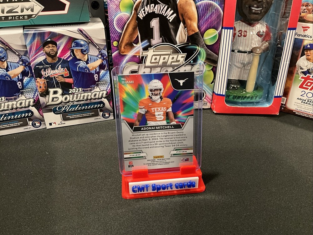 This is a 2024 Panini Prizm Draft Picks trading card featuring rookie player Adonai Mitchell in the Instant Impact Red parallel. The card is an insert and does not come autographed or graded. It is part of the National Football League (NFL) and includes teams Texas Longhorns and Indianapolis Colts. The card number is II-AMI.