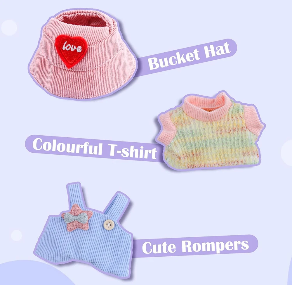 Product Description Stylish Doll Clothes for 17cm Plush Dolls Dress up your 17cm dolls with these charming and trendy outfits. Mix and match the pieces to create endless cute looks. Soft fabrics ensure a comfy fit for creative play or display.