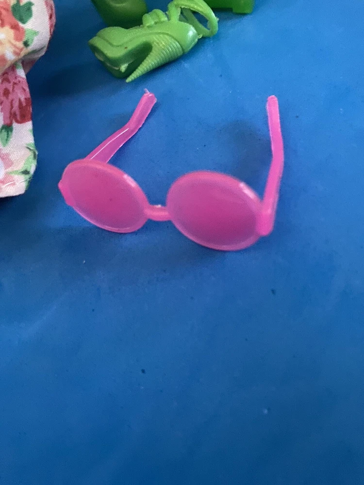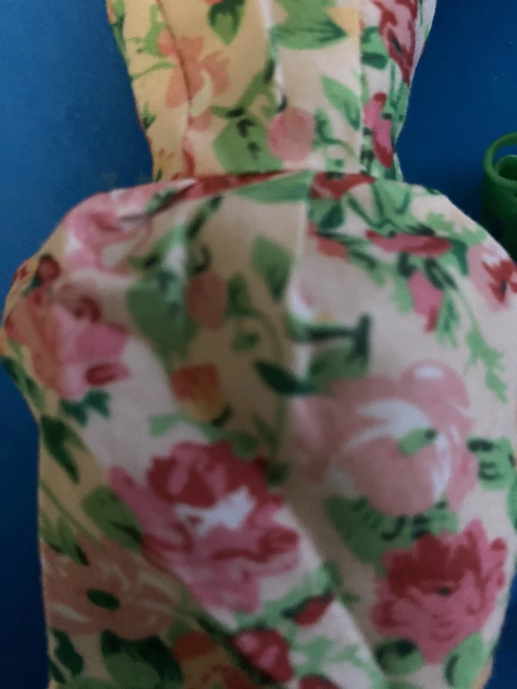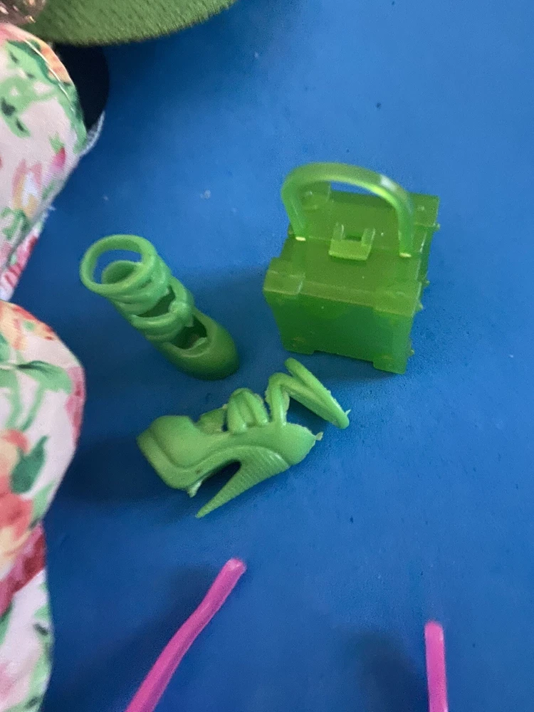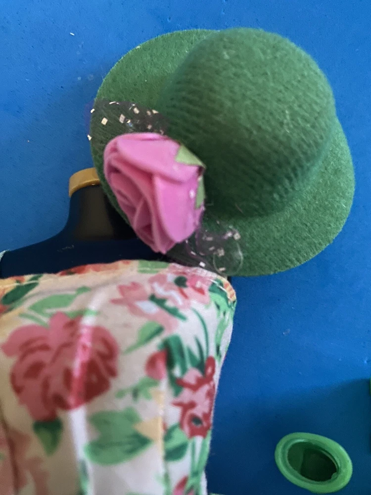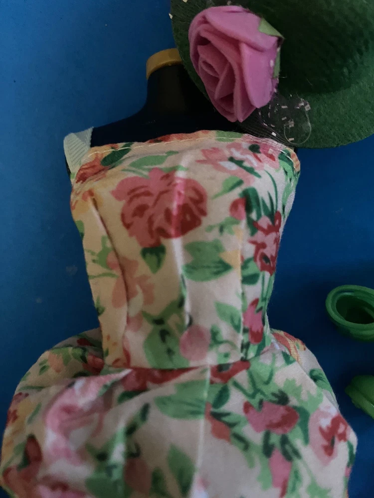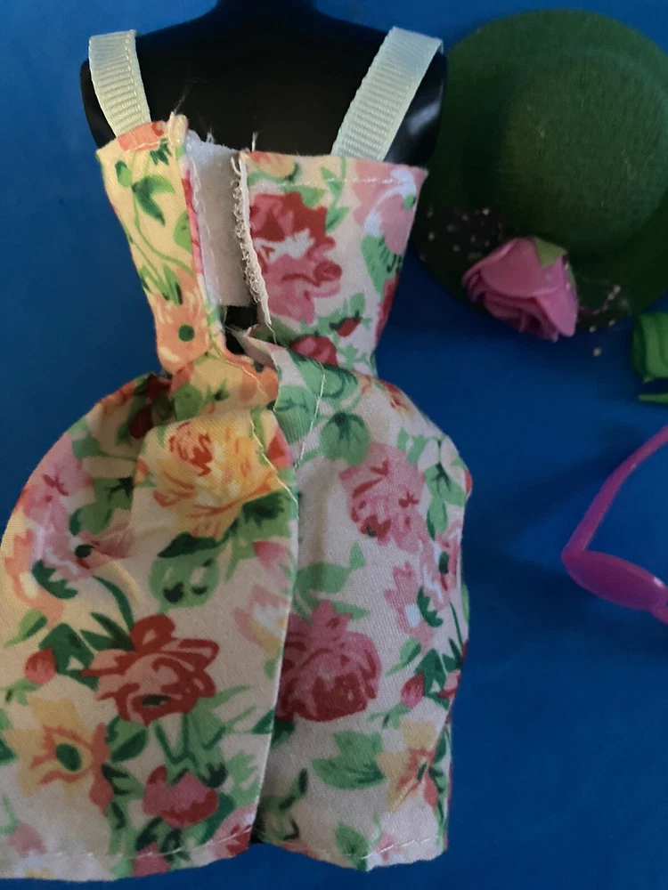 This product is an adorable multicolored sundress for Barbie dolls. It comes with a Kelly green bag, hat,shoes. The dress is made of cloth and is not vintage.