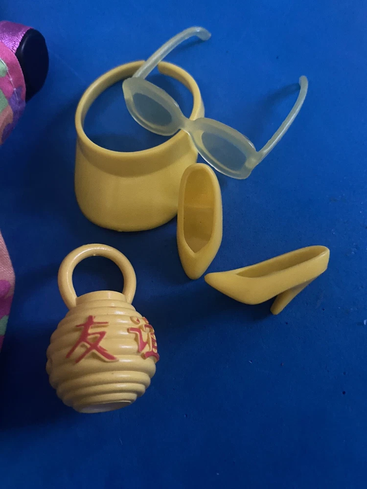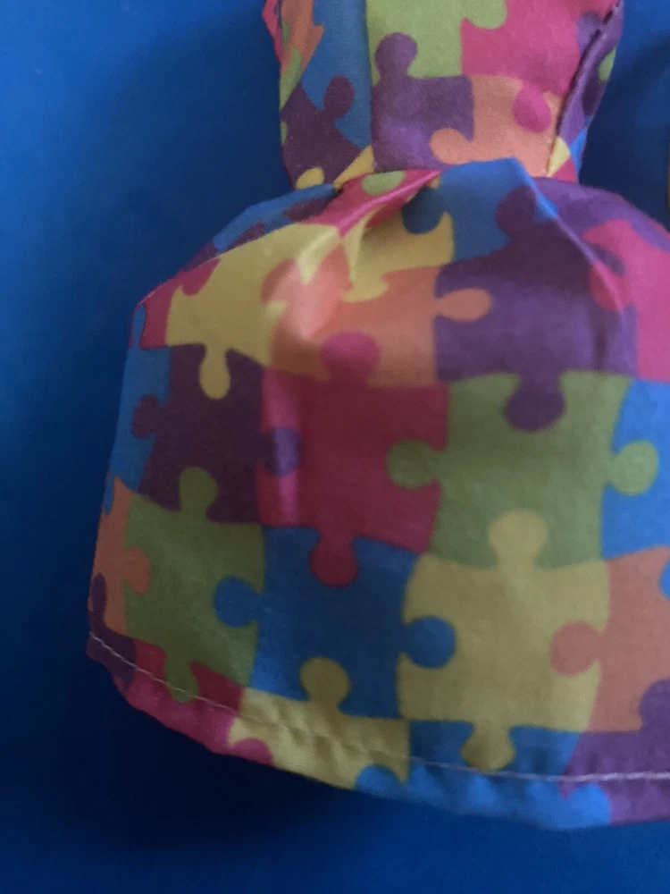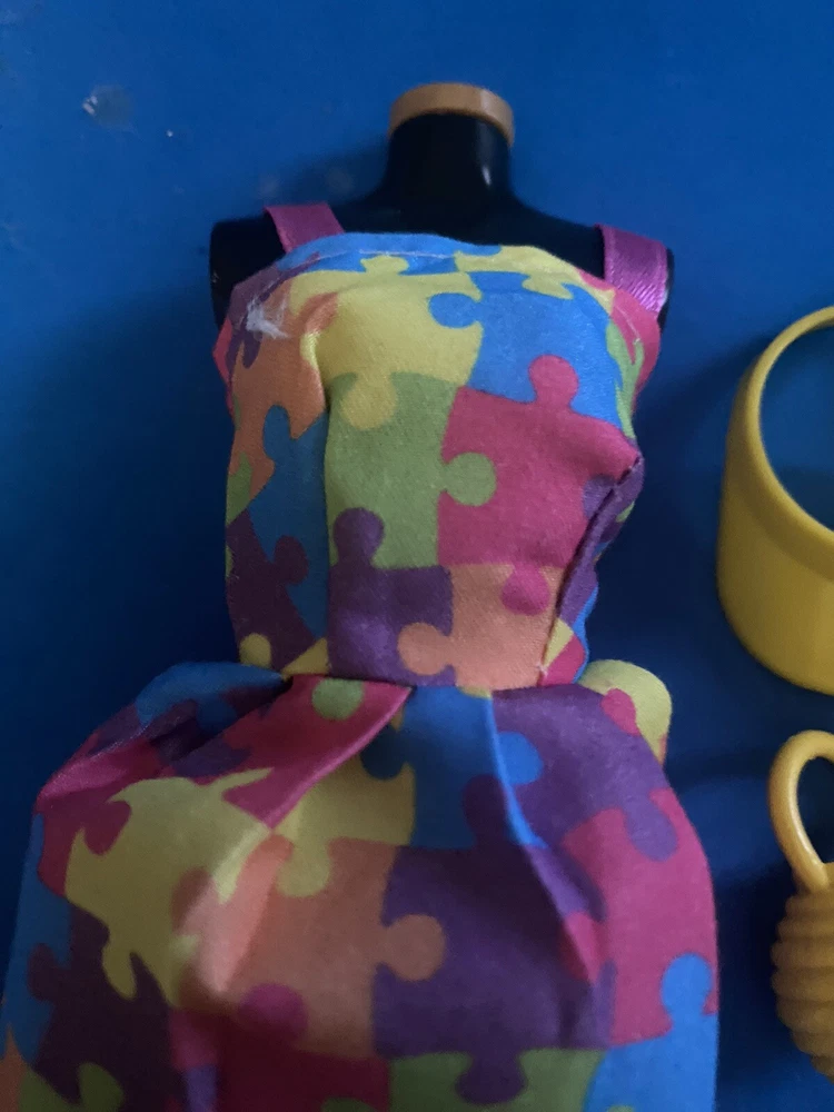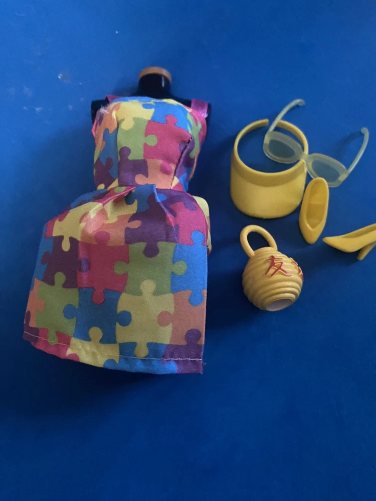This product is an adorable multicolored dress set for Barbie dolls. It includes a puzzle-piece sundress, bag, hat, and sunglasses. Made of cloth material, this set is perfect for dressing up your Barbie doll in style.