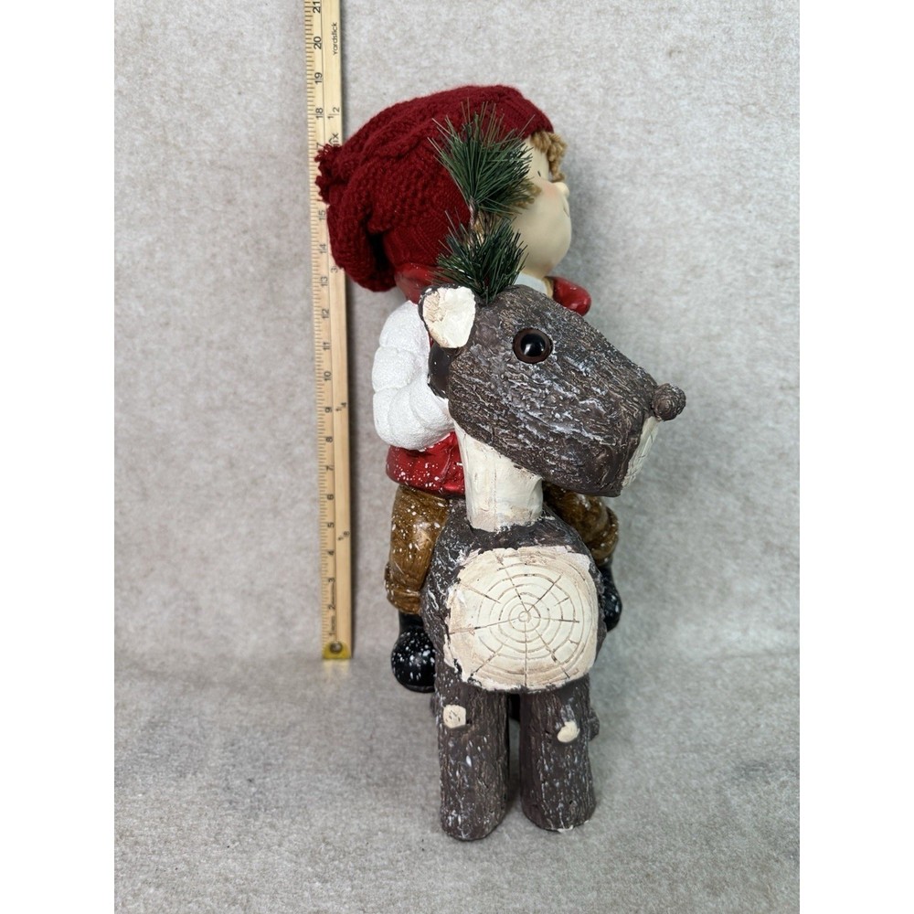 Capture the heartwarming magic of the holidays with this charming Christmas figurine. A joyful child, bundled in a cozy red hat and puffer vest, rides atop a rustic reindeer crafted from wood-like textures. The reindeer's unique log-slice design on its hindquarters and the subtle evergreen sprigs peeking from its head add a touch of natural whimsy. Perfect for adorning your mantelpiece during winter gatherings or as a delightful centerpiece for a festive table. Measurements: • Height: 11 in Type: Figurine Occasion: Christmas Material: Plaster Room: Any Room Item Length: 17.25 in Theme: Seasonal, Animals & Dinosaurs, Fantasy Department: Kids Item Height: 23 in Item Width: 11 in Style: Vintage/Retro Mounting: Free Standing Care Instructions: Clean with Damp Cloth Unit Type: Unit Keywords: Christmas decor, holiday figurine, child figurine, reindeer decoration, rustic christmas, winter decor, table centerpiece, mantel decor, festive ornament, cabin decor, country christmas, seasonal collectible Thank you for your interest-discountduet