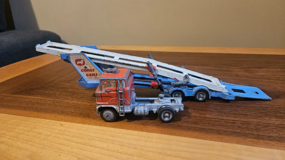 Corgi Major car Transporter with four cars. Ford Carrimore with car Transporter. Two Aston Martin DB4, Volkswagen van, and Ford Thunderbird. Great condition models, good to display or play with.