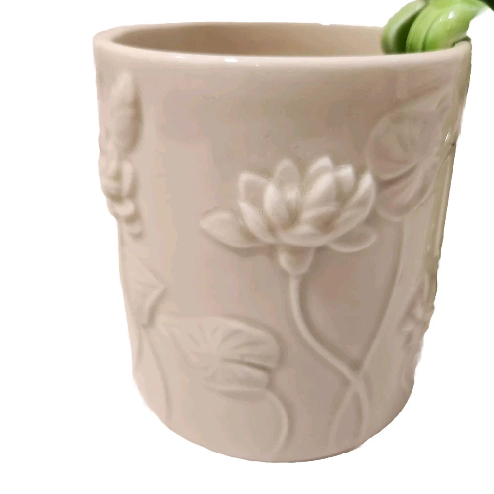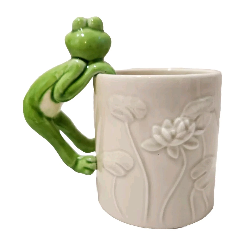 This is an adorable white ceramic mug featuring a frog as the handle. Perfect for enjoying coffee, tea, or other drinks. The mug is designed with a cute frog motif, adding a whimsical touch to your collection.