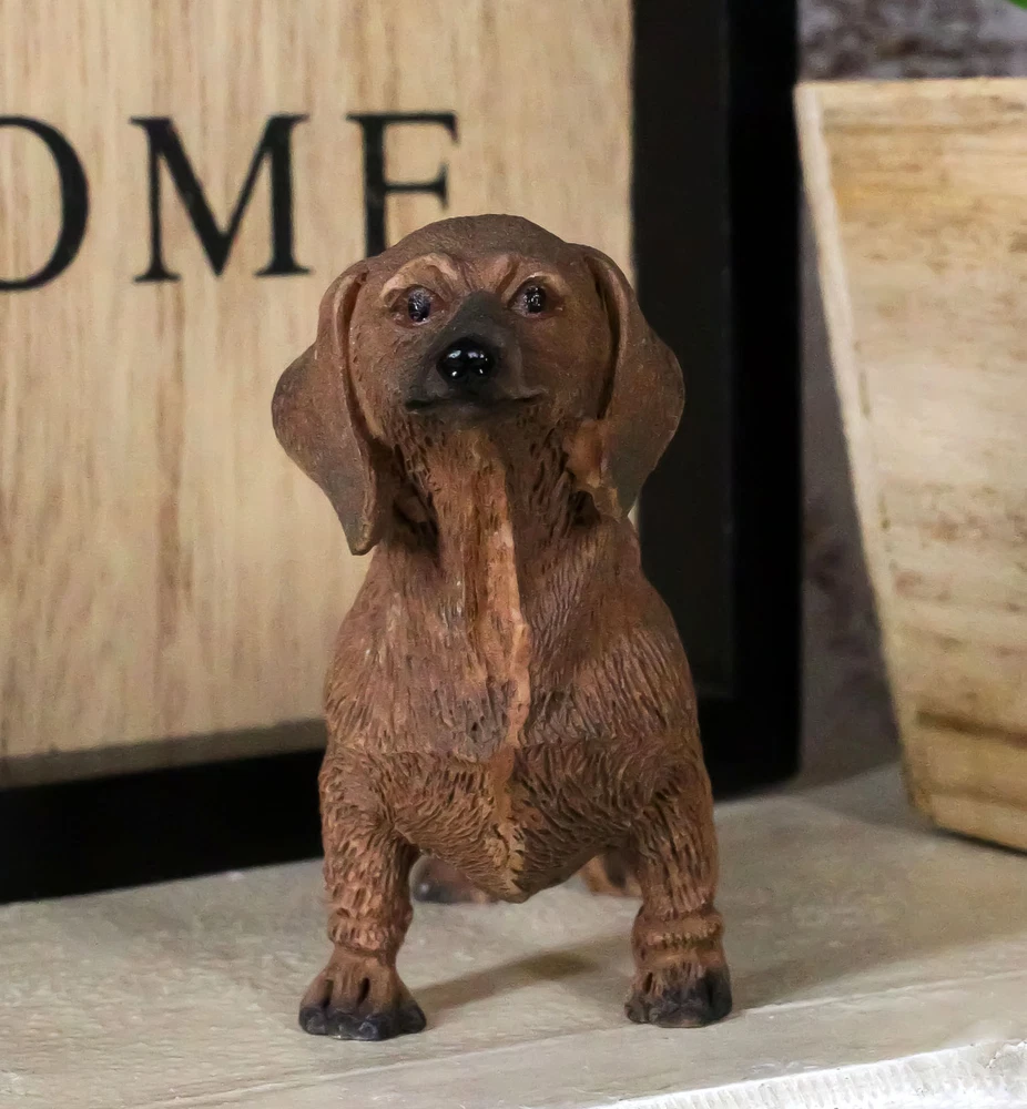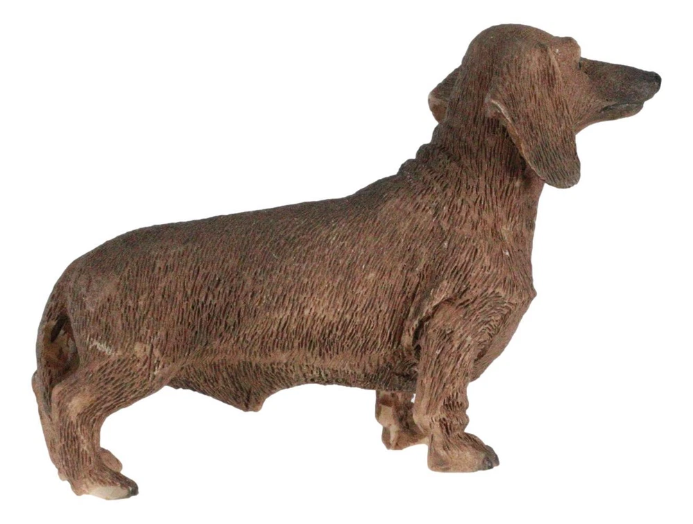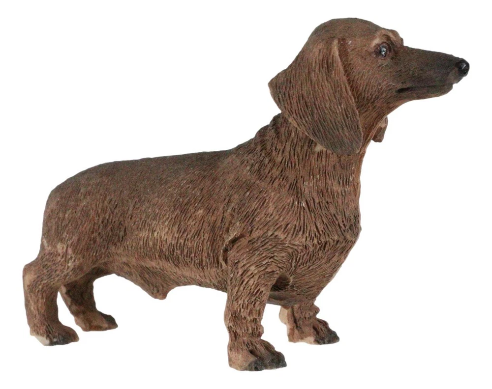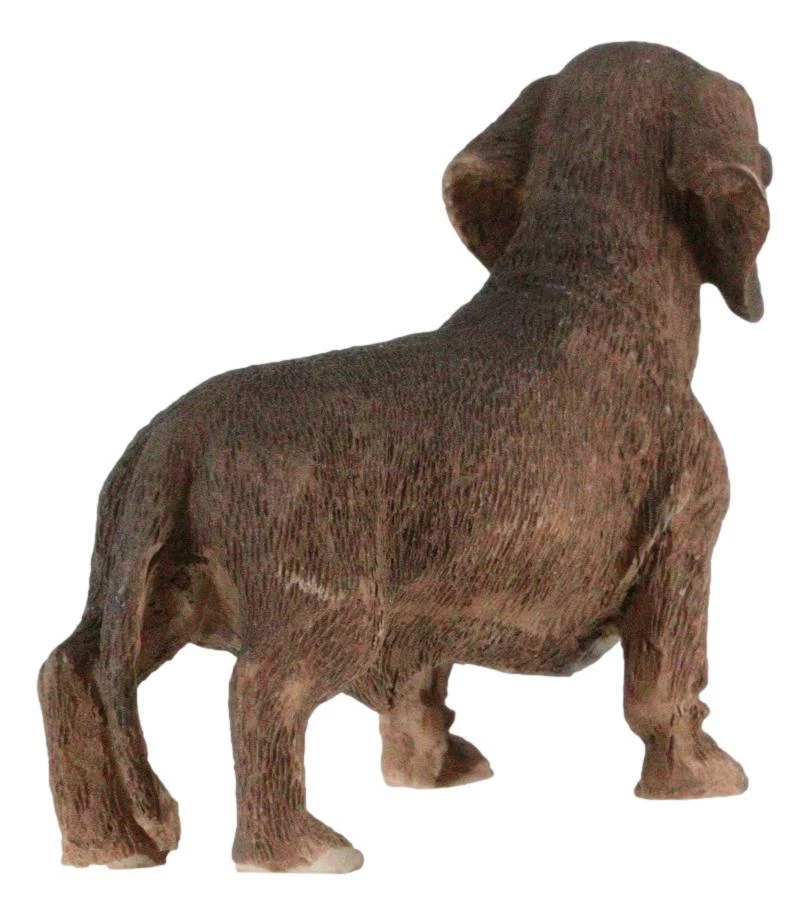 • Individually hand-crafted from cold cast resin, the sculpture is then hand painted and polished. Because our polyresin products are individually hand-crafted works of art, colors may vary slightly from what is pictured here. • This Chocolate Dachshund Dog sculpture measures 2.25" tall, 3.25" wide and 1.25" deep approximately. It weighs about 2 ounces. • A lighthearted accent sculpture for your shelf, countertop, desktop at home or office. Featuring a handsome sausage dog purebreed dachshund standing on all fours. • Props in photos are not included with the item. Ebros Adorable Lifelike Pet Pal Chocolate Dachshund Sausage Dog Miniature Figurine Video will open in a new window Using the mobile app? Copy this link into your browser: