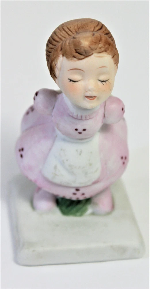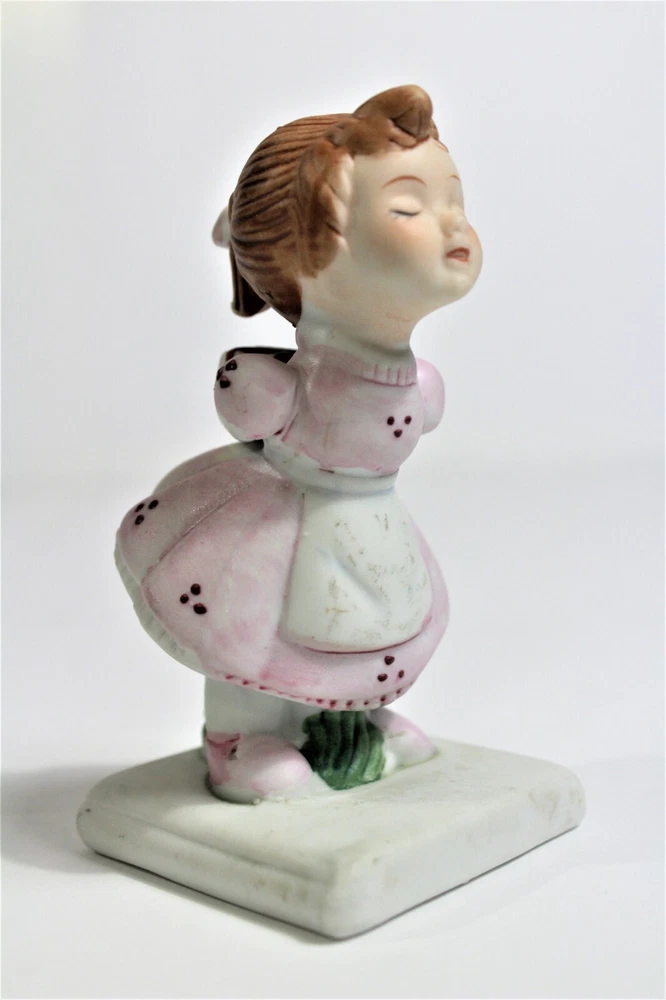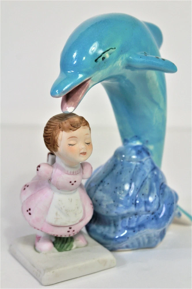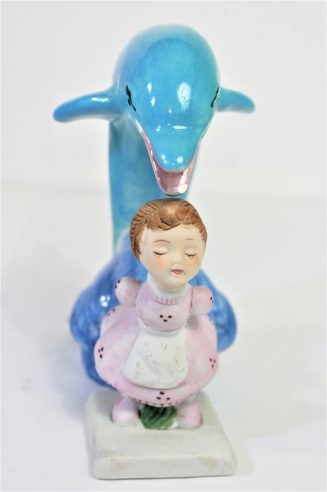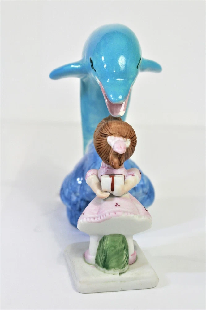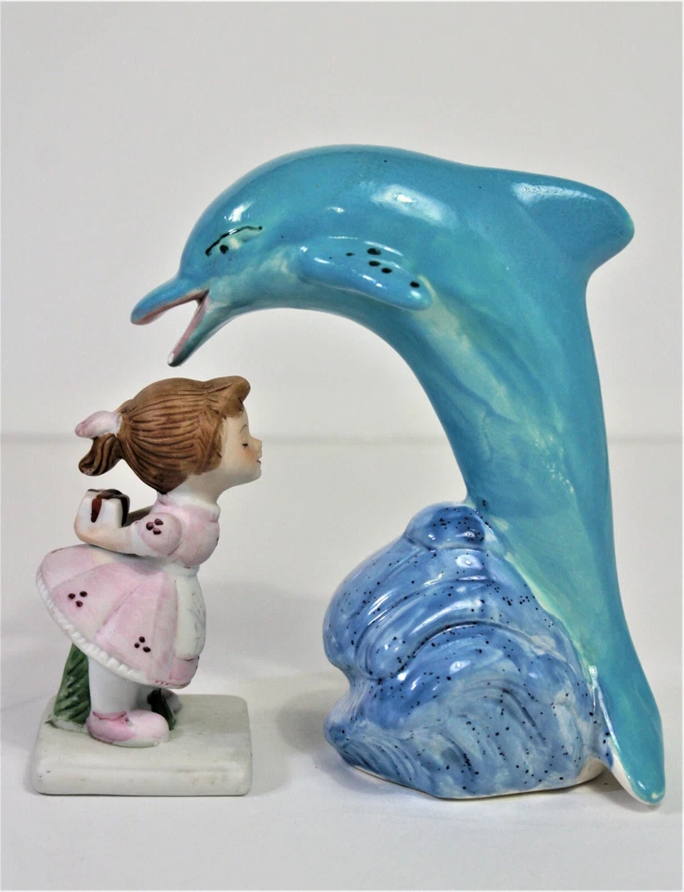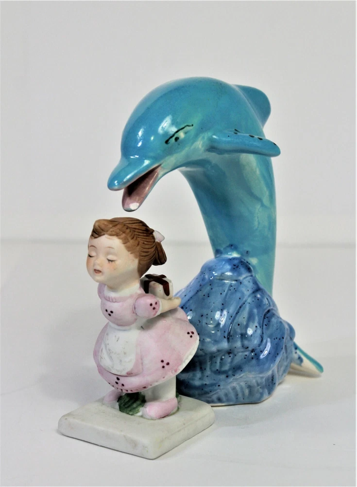 Sky Blue jumping Porcelain Painted Dolphin excited for gift from adorable girl. "In good condition" but small cut in Dolphin's mouth. Dolphin: Height: 6.5" Width: 5" Adorable Girl with gift pack: Height: 4" Width: 3"