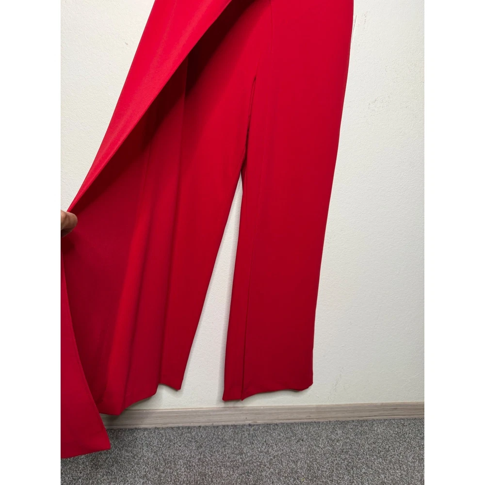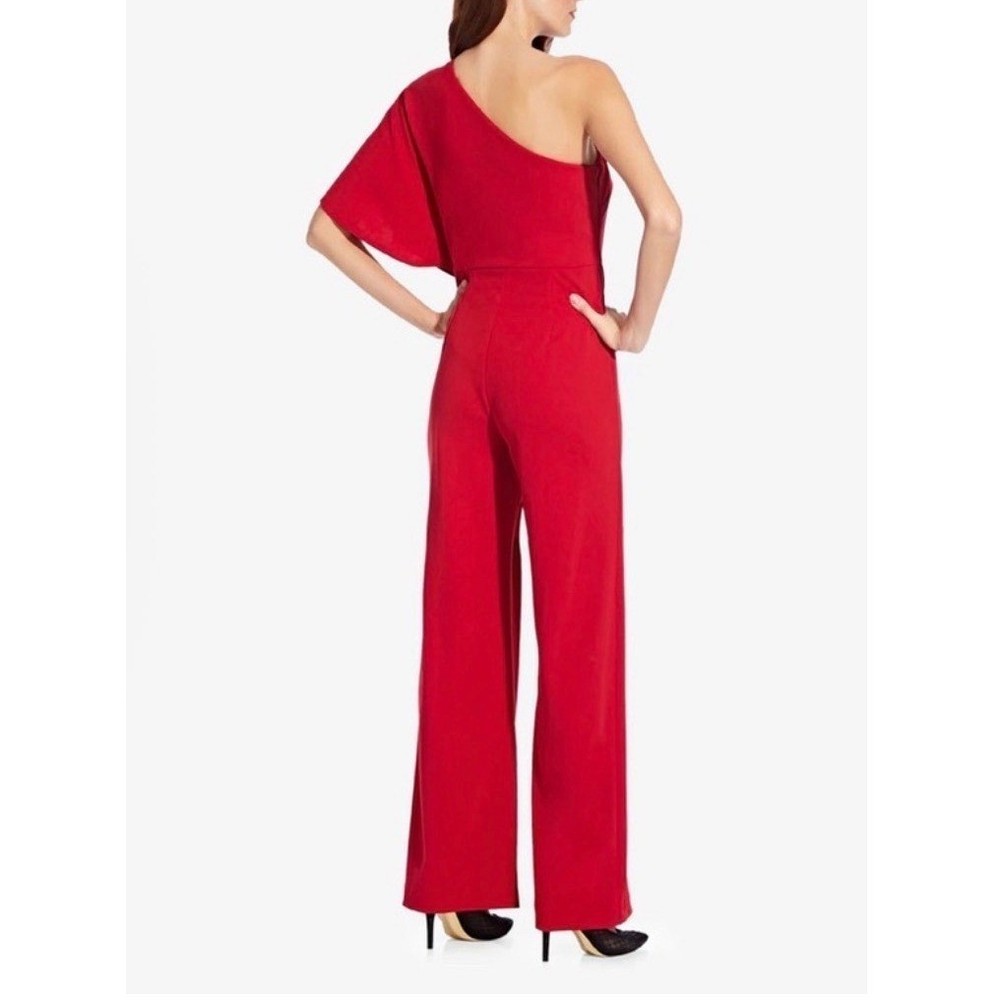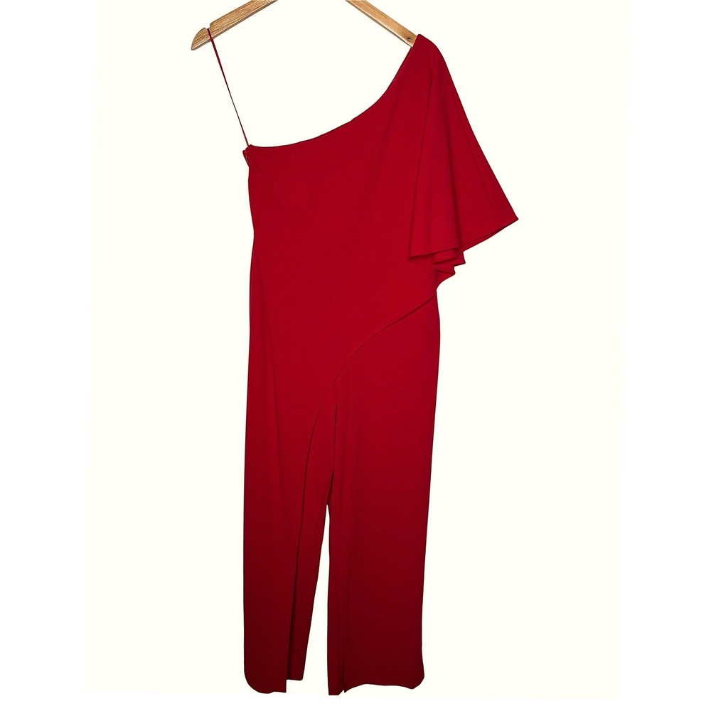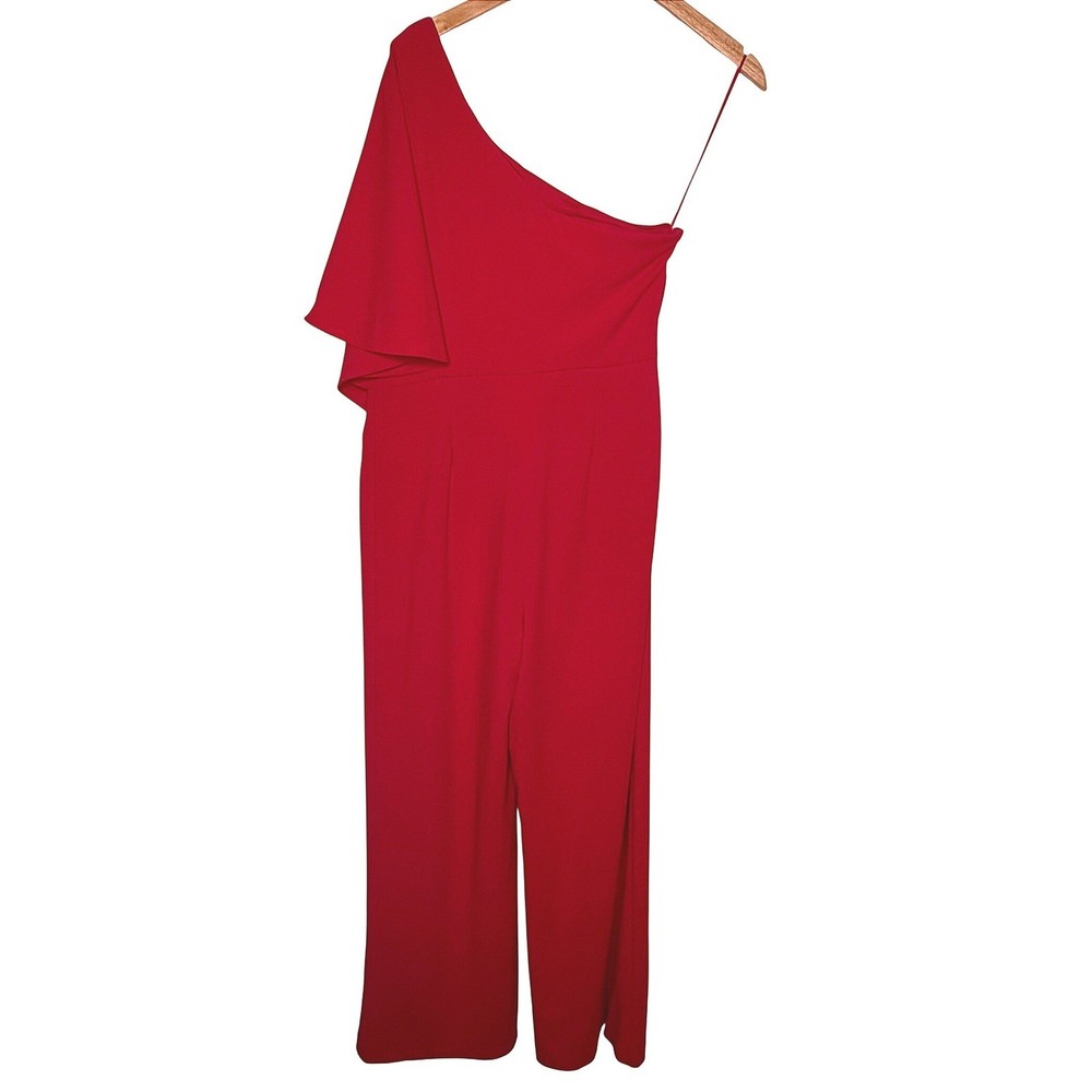 One-shoulder jumpsuit strikes a sophisticated balance with a dramatic draped overlay and a sleek wide-leg silhouette. Vibrant red crepe fabric offers a refined texture, while the asymmetrical neckline and single flutter sleeve create a modern, architectural look. A concealed side zipper ensures a smooth fit through the bodice, leading into a flattering wrap-style front detail on the trousers. Preowned in excellent condition. Measurements: • Armpit to armpit: 18" • Chest: 36" • Waist: 30" • Hips: 38" • Inseam: 31" • Total Length: 48" Size; 10/P Brand: Adrianna Papell Style: One Shoulder Jumpsuit Color: Red Neckline: Asymmetrical Sleeve: Single Flutter Sleeve Leg Style: Wide Leg Closure: Side Zipper Material: Crepe Occasion: Formal / Evening Fit: Petite Accent: Draped Overlay Gala, Wedding Guest, Cocktail, Statement, Minimalist, Chic, Holiday, Party, Sophisticated, Modern, Bold, Elegant, Special Occasion, Quiet Luxury • I ship within two business days. • All items come from a pet-free, smoke-free home. Thanks for shopping at Second Harvest Shop! Your support means the world to us.
