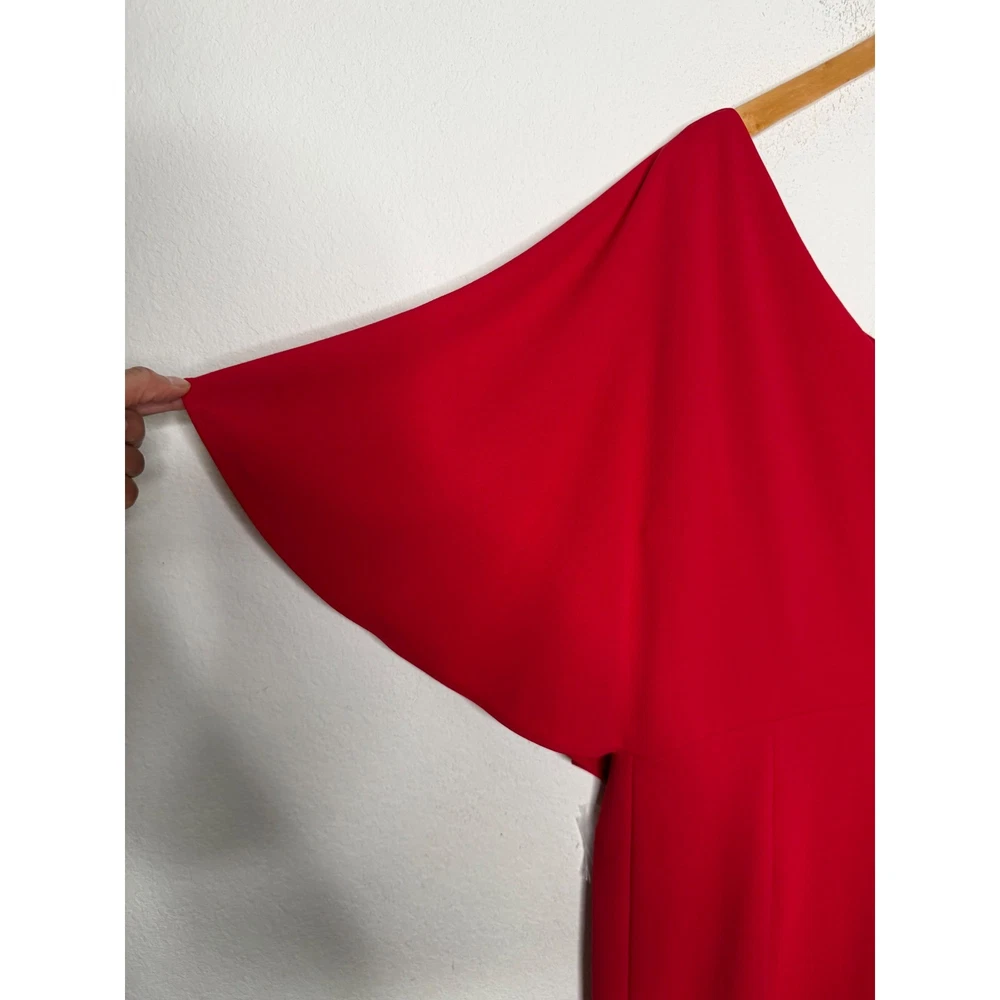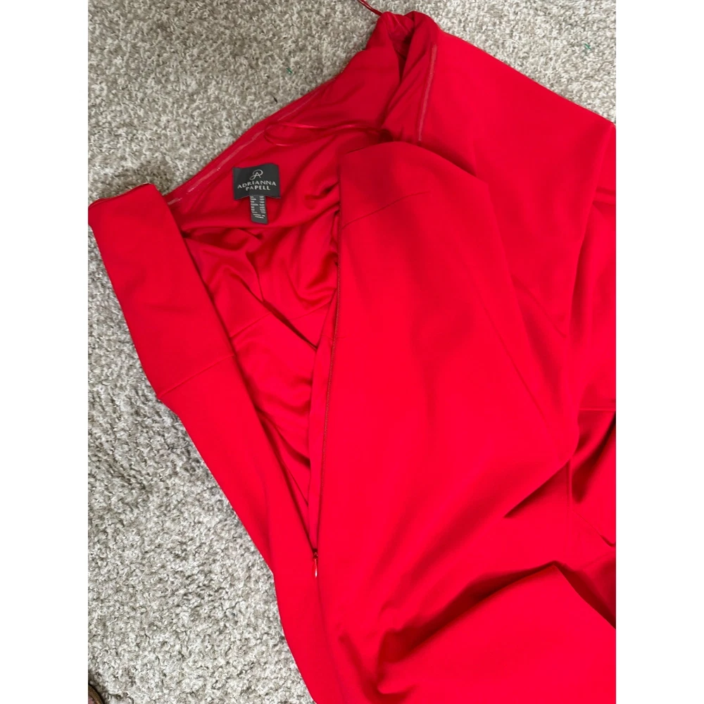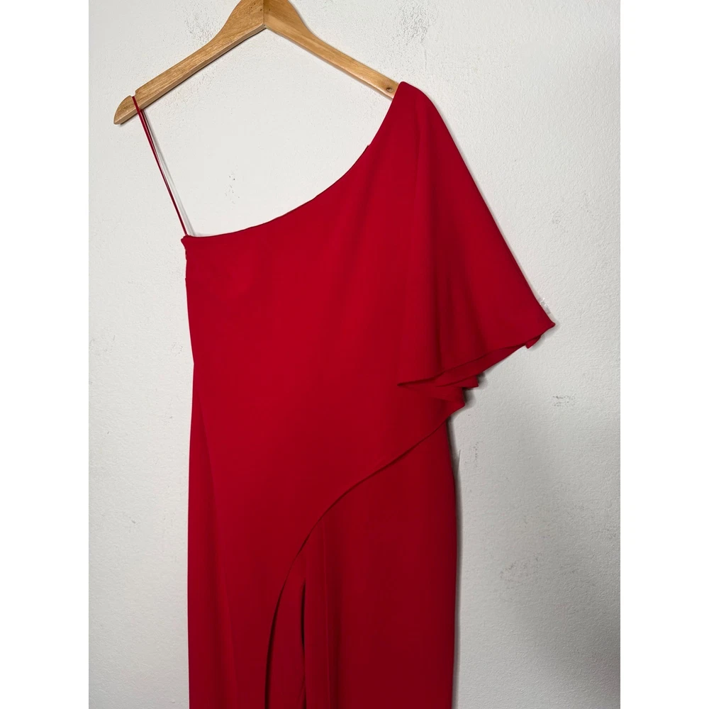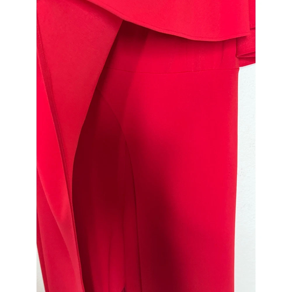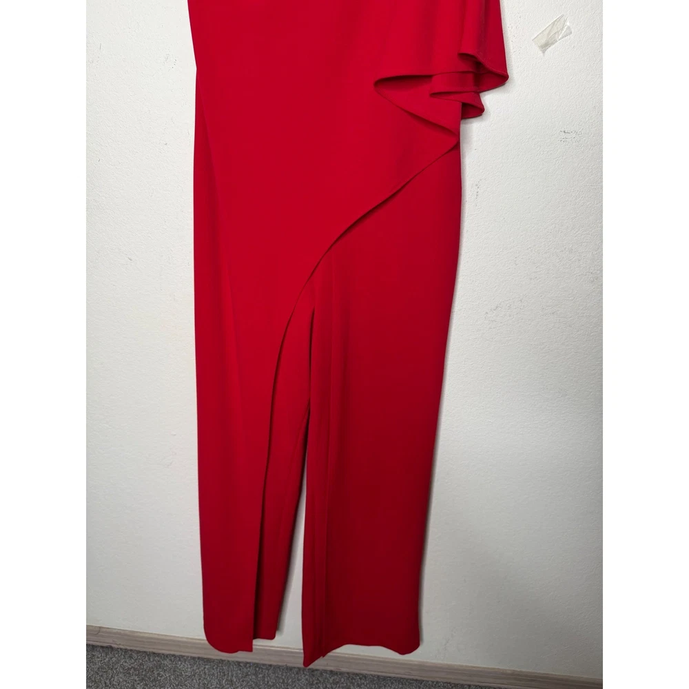 One-shoulder jumpsuit strikes a sophisticated balance with a dramatic draped overlay and a sleek wide-leg silhouette. Vibrant red crepe fabric offers a refined texture, while the asymmetrical neckline and single flutter sleeve create a modern, architectural look. A concealed side zipper ensures a smooth fit through the bodice, leading into a flattering wrap-style front detail on the trousers. Preowned in excellent condition. Measurements: • Armpit to armpit: 18" • Chest: 36" • Waist: 30" • Hips: 38" • Inseam: 31" • Total Length: 48" Size; 10/P Brand: Adrianna Papell Style: One Shoulder Jumpsuit Color: Red Neckline: Asymmetrical Sleeve: Single Flutter Sleeve Leg Style: Wide Leg Closure: Side Zipper Material: Crepe Occasion: Formal / Evening Fit: Petite Accent: Draped Overlay Gala, Wedding Guest, Cocktail, Statement, Minimalist, Chic, Holiday, Party, Sophisticated, Modern, Bold, Elegant, Special Occasion, Quiet Luxury • I ship within two business days. • All items come from a pet-free, smoke-free home. Thanks for shopping at Second Harvest Shop! Your support means the world to us.