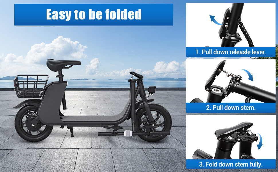 Adult Foldable Electric Bike Electric Scooter w/Seat Ebike 450W UL2849 Certified Feature Powerful Motor & Long Range: The adult electric bike comes with a 450W powerful brushless motor and large 40 cells 8.0Ah Lithium-ion battery, enables a 12.5-mile range, and a max speed of 15.5 mph. Portable & Lightweight: The foldable electric bike only weighs 42 lbs and can comfortably accommodate riders up to 265 lbs. This adult electric scooter can be easily folded and stored in the car trunk, which makes it perfect for commuters and students. Safe & Durable: With double braking systems, the front and back disc brake of the e-bike give you double safety. The 12" tires built for multi-terrain of daily use or outdoor activities. Detail Oriented Design: The E Scooter come with 13 x 11 inch rear carry basket and scooter deck, front LED light and rear reflectors for safety. Easy Assemble Required: The only assembly required is the seat and basket attachment. The handle bars are folded and just need to be erected. All tools are provided in the box. Package Listing 1 X E Scooter 1 X Charger 1 X User Manual 1 X Tool Kit After you receive the adults scooter,before first Riding,please do the follows: 1.Inflate the Tires before Riding. 2.Complete Charging(Light RED:Charging, Light Green: Charging Compelte). UL 2849 certified The E-bike have passed UL 2849 safety standard detec tionhttps://productiq.ulprospector.com/en/profile/ Shipping Payment Return and Refund Policy Feedback Help - Customer Support - Contac Shipping FREE SAME BUSINESS DAY MONDAY- FRIDAY SHIPPING FROM USA. No shipping on Weekends or US Public Holidays. No responsibility for any custom duty We will ship your order to your PayPal Verified address provided. Please verify your address and make sure that it is your current address before making your payment. Any address change requests after your payment CANNOT be guaranteed. Shipping information will be updated when available. All of our products can be shipped internationally. To confirm the shipping rates to your country please refer to eBay's Shipping Tab above. Any brokerage, customs, and duty fees associated with international shipments are the customer's responsibility and are not included in our shipping fee. A phone number is required for the customs documents. Failure to provide one will result in delays. We do not include an invoice or any advertising materials with our shipments. Payment Immediate payment is required. Shipping will be arranged within 1 business day once payment is cleared. To uphold a shipping speed, your order will be processed almost immediately. If you change your mind after your payment is confirmed, we will do our best to cancel the order, however, we CANNOT guarantee the cancellation. Return and Refund Policy 1. We stand behind our items and offer 30 days warranty . All items are in new and working condition unless specified otherwise elsewhere in the description. 2. All Returns - defective or otherwise - MUST BE PREAUTHORIZED to guarantee refund or exchange. Please contact us to get an authorization and return address. 3. Buyer agrees to pay for the cost of re-shipment for undeliverable or wrong addresses. 4. Buyer is responsible for Return Postage as well as a 20% restocking fee if return/replacement is not a result of our mistake such as wrong item. 5. Replacement or Refund will be made upon receipt of the returned item. Please include tracking number so we can process ASAP. If you do not wish to wait for a replacement, please repurchase the item. 6. ALL REFUNDS will be processed via PayPal. Please double check via PayPal history and transaction for confirmation. PayPal will send it back to whatever you used to pay within 3-5 days. Feedback We strive to provide the best products and services. Your positive feedback 5 stars DSR help us do better. If anything about your transaction did not meet expectations, please CONTACT US and give us the opportunity to make things right. We are always here to help. Help - Customer Support - Contac Please do not hesitate to CONTACT US . You can message 24/7 on eBay for all questions and inquiries. We will get back to you within 1-2 business days at the latest.