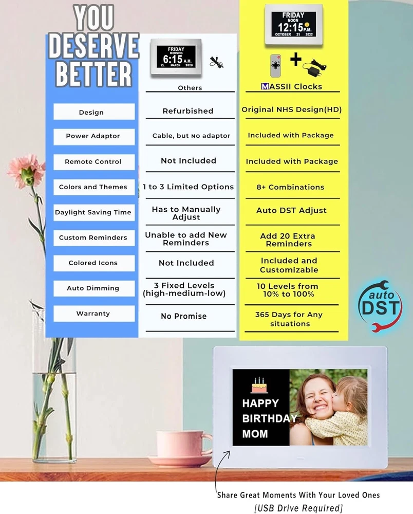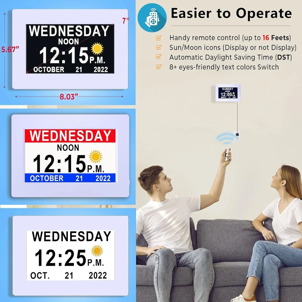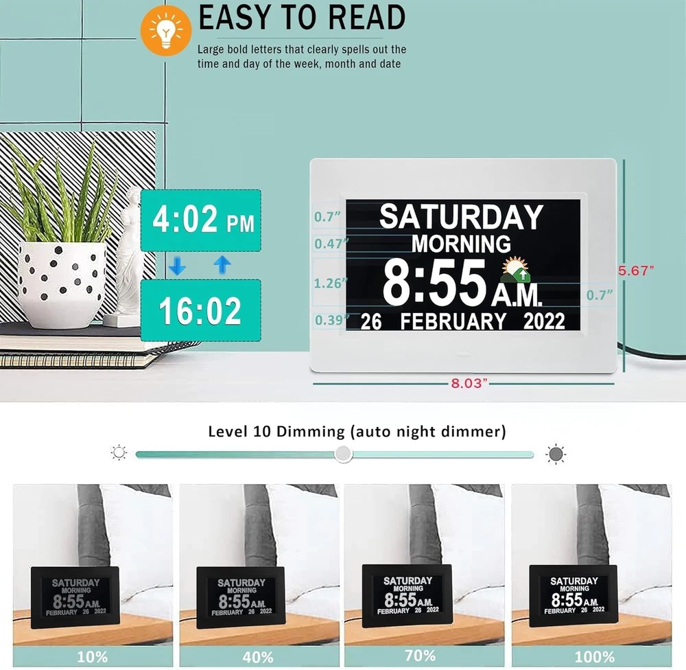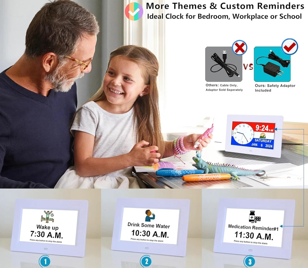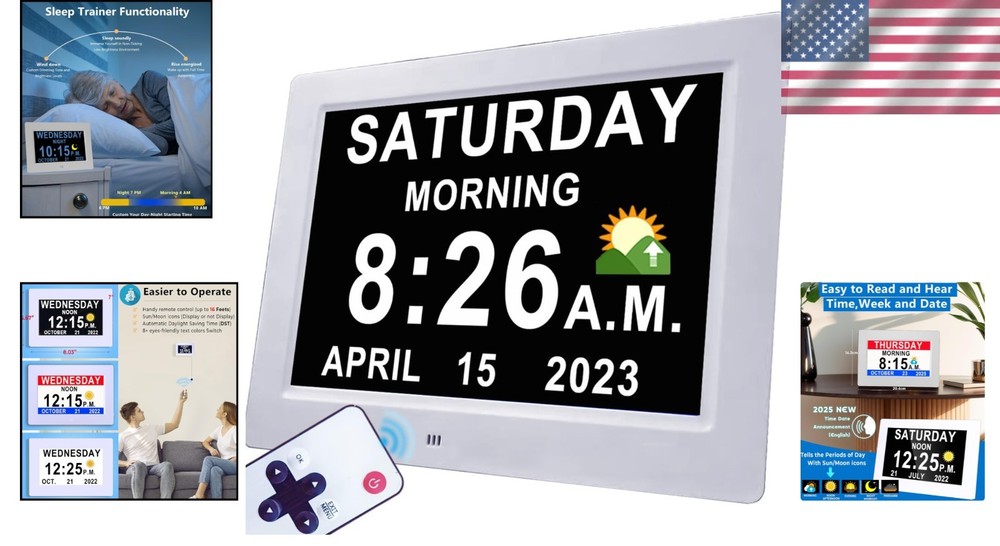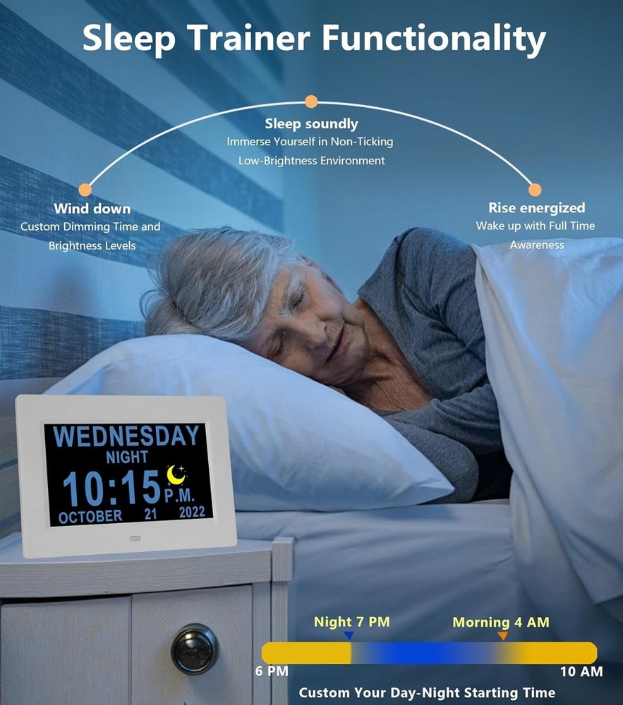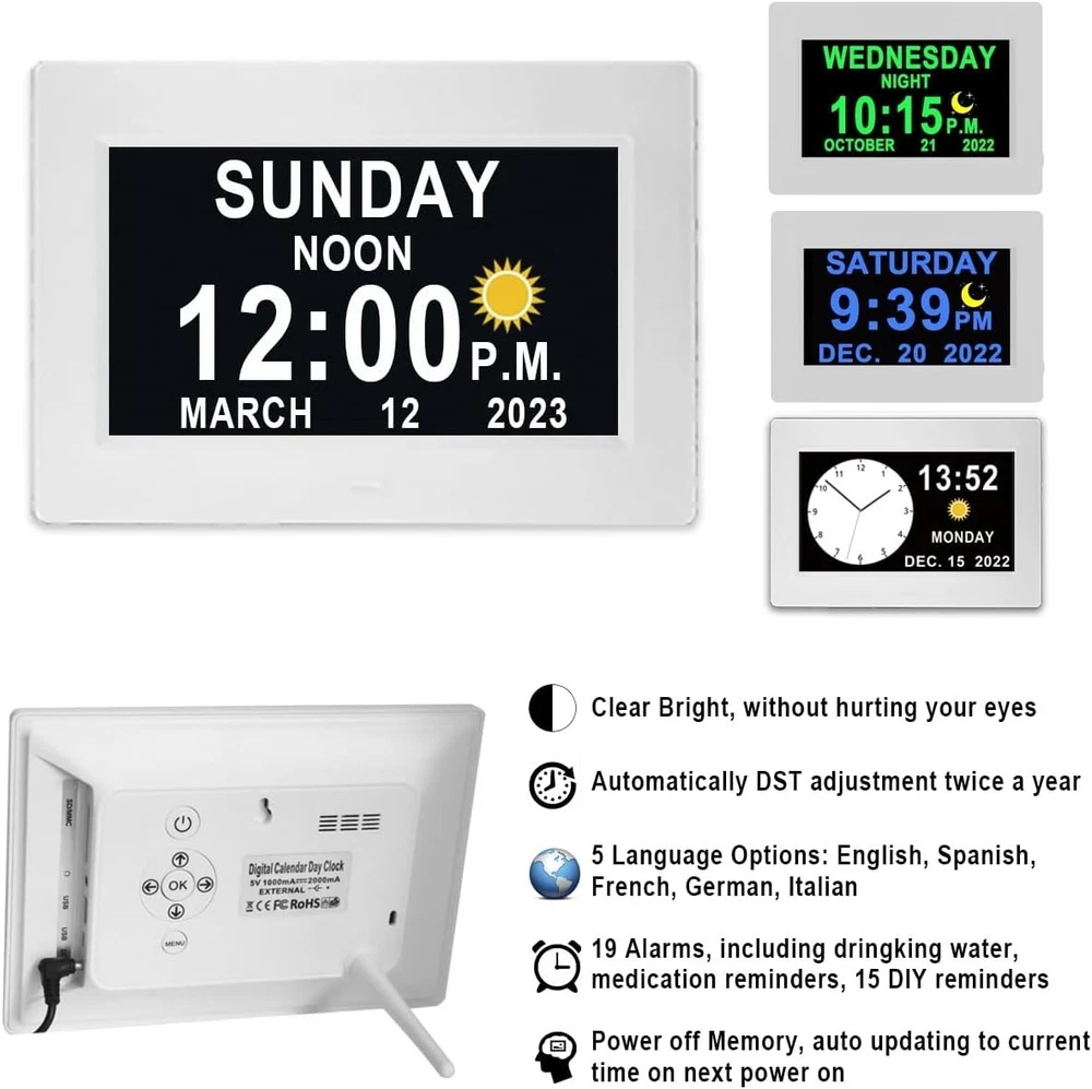 Advanced 7" Digital Alarm Clock with Auto DST & Voice Alerts for Dementia Care ‹ › ‹ › ‹ › ‹ › ‹ › ‹ › ‹ › ‹ › ‹ › ‹ › Advanced 7" Digital Alarm Clock Designed with Care for Dementia Support Key Features: Upgraded 7" HD Display: Experience a crystal clear view with a vibrant 1280*800 HD display showing time, day of week, and date without confusing punctuation. Voice Alerts: Unique voice feature announces the time, date, and more, ensuring clarity and ease-of-use for seniors. Multiple Alarms: Set various alarms and upload over 20 custom reminders to ensure important tasks, medications, and hydration needs are never missed. Auto DST Adjustment: Automatically adjusts for daylight saving time, taking away the hassle of manual changes. Customized Wake & Sleep Cycle: Configurable morning brightening and night dimming for a comfortable bedtime routine. All Accessories Included: Comes with a durable memory battery, safety-certified adapter, and remote control, making it plug-and-play! Robust Design: Built to withstand accidental drops while providing peace of mind during power outages with a 5- lasting backup battery. Elegant Customization: Choose from multiple font colors, alarm volumes, and more to cater to personal preferences. Why Choose This Clock? With its impeccable design and intuitive functionality, this digital alarm clock becomes a reliable partner for the elderly, ensuring they remain conscious of time without confusion. The innovative features cater specifically to those experiencing memory challenges, creating a tranquil environment and promoting a routine that fosters independence. Invest in peace of mind today and elevate your loved one's daily experience with this splendid digital alarm clock! Shipping Free & Fast Shipping - We offer free shipping to most of the USA with a normal delivery time of 3-7 days. However, due to the current situation, additional delivery time (up to 3 weeks) may be required for some items. Alternative Carriers - We may use alternative carriers (e.g. USPS, FedEx, UPS, etc.) to ensure your package arrives safely and on time. Due to the use of multiple carriers, we are unable to provide a tracking number automatically. Handling Time - Orders are processed and shipped within 1-2 business days of receiving cleared payment. Shipping Restrictions - Shipping to Alaska, Hawaii, Puerto Rico, Guam, and other US territories may incur shipping charges or delivery restrictions. Please contact us before ordering, or your order can be refunded/cancelled. State Restrictions - There may be restrictions based on your state of purchase. For example, certain items may not be shipped to California due to state regulations. Contact for Tracking Updates - If you require tracking updates or have any concerns about the delivery of your order, please feel free to contact us, and we will be happy to assist you. Return 30-Day Hassle-Free Returns - We want you to be completely satisfied with your purchase. If you are not, you can return the item within 30 days of receiving it for a full refund or exchange. Easy Return Process - To start a return, simply contact us and we will provide you with a prepaid return shipping label and detailed instructions. Restocking Fee - There are no restocking fees for returns. However, the buyer is responsible for return shipping costs if the return is not due to a seller's error. Refund Processing Time - Refunds will be processed within 5 business days of receiving the returned item in its condition. Payment We accept all major credit cards, PayPal, and Apple Pay for your convenience. Your payment information is secure and encrypted to ensure a safe and seamless transaction. Please complete your payment within 3 days of purchase to avoid any delays in shipping. Feedback Your feedback is extremely important to us. We strive to provide the best products and customer service possible. If you are satisfied with your purchase, please take a moment to leave us a positive review. If you have any concerns or issues with your order, please contact us before leaving negative feedback. We are committed to resolving any problems and ensuring your satisfaction. Contact Us If you have any questions or concerns, please feel free to out to our customer support team. You can contact us through the eBay messaging system. We are available Monday to Friday, 9:00 am to 5:00 pm EST, and we will do our best to respond to your inquiry within 24 hours. Buy it now and enjoy a pleasant shopping experience! Item Length: Digital Clock for Seniors Product Line: Digital Clock for Seniors Unit Quantity: 0.44 Features: Alarm,Auto DST,Talking Time,20 Custom Reminders,10-Level Auto Dimmer,Sleep Trainer,Day Date Calendar,Voice Announcement,HD Display,Remote Control,Programmable Themes,Customizable Brightness,Backup Battery Room: Garage,Living Room,Office,Bedrooms,Classroom(school),Nursing Home,Bar Material: Plastic,HD Display Material Smart Home Protocol: Bluetooth Department: Kids,Teens,Adults,Seniors Smart Home Compatibility: None Type: Digital Clock Display Type: Digital Color: White Movement: Automatic Power Source: Electrical Style: Modern Finish: None Era: 21st Century (2000-Now) Frame Material: Plastic Shape: Rectangular Protection Plan: No Coverage Item Weight: Less Than 1 lb Number Type: Arabic Numerals Unit Type: Unit