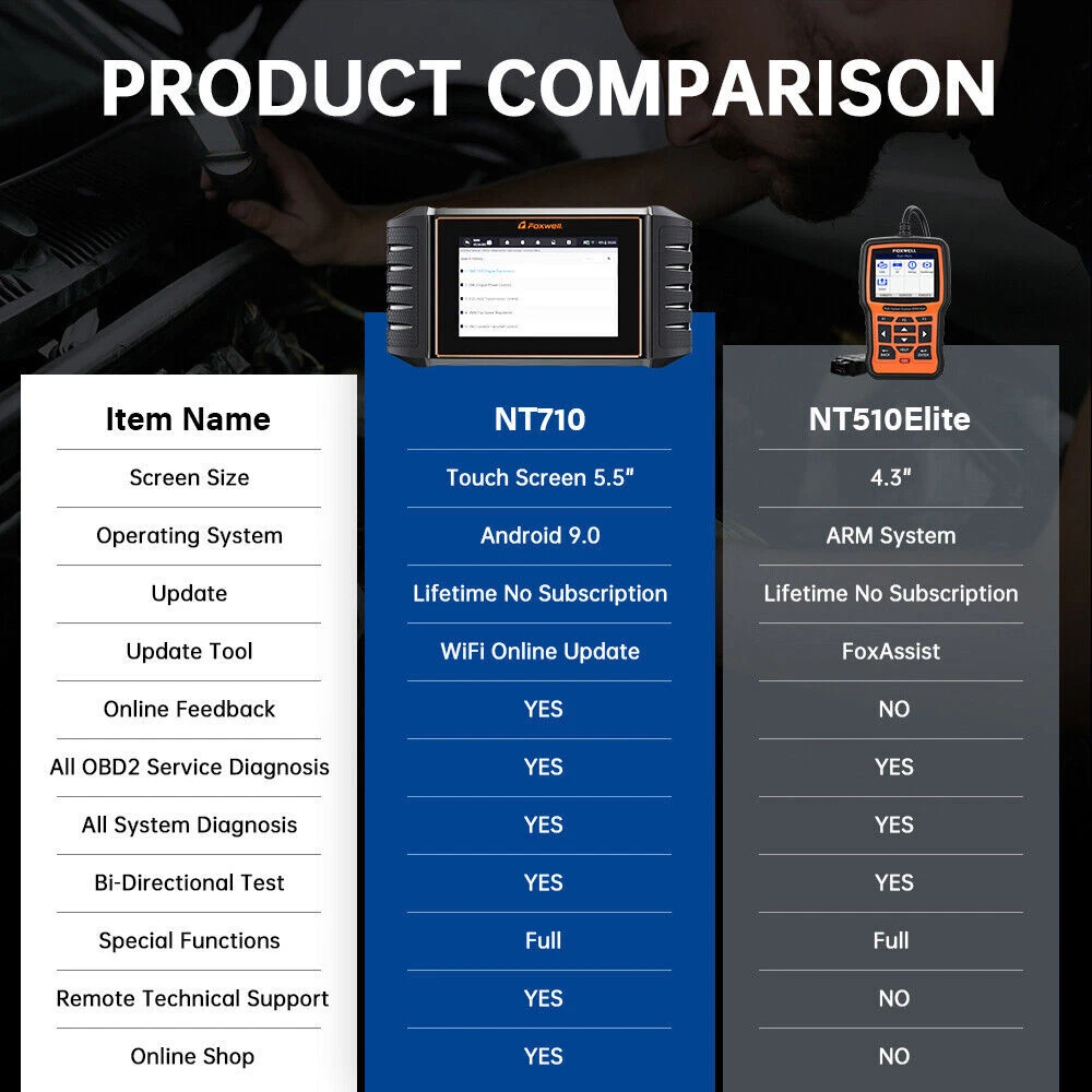 FOXWELL NT710 Car OBD2 Scanner Diagnostic Tool Ecu Key Coding Bidirectional Control, Full Systems Scan, 34+ Reset Service, Lifetime Free Update NOTE: NT710 is one free brand with full functions(any brand), lifetime free update, if you need more br ands, you need subscribe in MAll button , it takes USD40/Brands , you can choose the one you want to subscribe !!! when you receive it, first to change language setting, then choose the brand which one you need to download, if you make mistake, please contact me first! Foxwell NT710-- Offer Real Value For Car Owner, Upgrade of NT510 Elite Foxwerll NT710 is the 2025 latest version from FOXWELL TECH, aim to provide shorter diagnostic process & fast troubleshooting. This would be good as a quick auto scan tool for who do not want to be charged hundreds of even thousands of dollars on a small check by the repair shop, and supports the most commonly required service and coding features. If you want lowest cost get full functions, NT710 is your best choice! All-in-One Functions in Your Hand ●One-click Online Free Update anytime and anywhere, you do not need any SD cards, cables or PC. ●Bi-Directional Control (Active Tests) Full control over various car components, parts to perform active tests like EVAP test,injector tests and etc. ●OE-level All Systems Diagnostics can scan all available systems to read/ erase fault codes, display live data or analog, freeze data frame, active tests, retrieve ECU info. ●All Special Functions refer to the initial adaptation, self-learning, or some auto-detection function,like battery register/replacement abs bleeding, oil light and etc. ●ECU Coding to customize it according to your wishes and unlock hidden features for E-chassis of BMW ●10 OBD Function for all car brands to read/clear codes, turns off MILs displays freeze frame data to do some simple diagnostic by yourself. ●One-Click AUTO-VIN&SCAN to do a comprehensive diagnostic for your cars. 4 in 1 Live Data Graph to show the live vehicle conditions in text and graph to help you to analyze the abnormal parameter easily. ●Android 9.0 Operation System and smooth interface make it simple for beginners. Stable and Smooth Performance farewell to slow loading thus enjoy fast diagnosis ●5.5inch Bright & Intuitive Full Touchscreen, you can enjoy the clear and vibrant details of diagnostic data with fewer distractions. What Upgrade We Did on NT710 Compare with NT510 Elite? 1. NT710 is 5.5inch Anroid tablet, it makes diagnostic more convenience. and upgrade via WiFi, get rid of the USB cable and card reader, no troubles. 2. Support Check Diagnostic Coverage List online 3. Support Purchase software Online, easy to use 4. Support Feedback online, solve problem in time Full System Bi-directional Control Test/ Active Test NT710 allows you to use the scan tool temporarily activate or control a vehicle system or component and to check of the electronic components such as switches, sensors, relays, and actuators. and supports the most commonly required service and coding features. ●Auto Bleed Test/ Automated Bleed ●ABS Pump Motor Test ●Fuel Injector Pump/ Fuel Trim Reset ●Window/Mirror/ Door Lock/ Horn ●Cycle A/C Clutch On/Off ●Air Conditioning Test ●Wiper Test ●Interior & exterior lights Test ●Sound horn Test ●Brake Bleed Preparation Test + ABS Manual Control Tests + Fuel ●Composition Reset + EVAP Test + Idle Relearn + Injector Buzz Test + Pump and Value Tests + VGT Turbo Calibration...... Advanced ECU Coding Restore Functional Status after Repair or Replacement After making repairs or replacements, you can use this bi-directional diagnostic scanner to re-flash the vehicle control modules, clear the original memories stored in Electronic Control Unit, and write the adaptive data into specific components to get your vehicle back on the right track. Customize and Upgrade Vehicle in Your Own Way You can also make manual tuning to break the limitations and restrictions of the market-specific settings of the car when it left the factory. With the help of this scan tool’s online coding, you can disable annoying functions or activate high-end features, make software modifications to alter how it behaves originally. Here are some examples: - Disable the automatic start/stop. So when you press down the accelerator pedal/brake pedal, your car won’t automatically start/stop. - FCA vehicle’s car doors can be unlocked with just one press of the key fob. - Make the moving pointer move, perform self check, and then return to the initial point at the time the ignition is turned on. - The fuel gauge can show the real-time filling quantity of fuel in the tank. - The car lock sound effect will be available at the time the car is locked. - Use the key fob to make all car windows automatically closed with just one press of the lock button. - Keep the daytime driving lights lighted on for 20 seconds. - When you press the brake pedal, your stoplights can be all lighted up. - Your turn signals & rear fog lights can be alternatively flashing. 34+Reset Function : 1. Steering Angle Reset Reset the steering angle to zero to keep the car running straight. 2. Injector Coding Write the new injector code into the car system for the correct cylinder injection quantity. 3. IMMO Disable any lost keys and add new keys. **ONLY for cars with an easy IMMO system. 4. DPF Regeneration Especially works for D-P-F system with D-P-F regeneration, D-P-F component replacement teach-in and D-P-F teach-in after replacing the engine control unit. 5. A/C relearn The vehicle air conditioner replaces the electronic control unit, replaces the actuator or the memory of the electronic control unit memory is lost, and requires air conditioning initialization learning. 6. ABS Bleeding Help exhaust the air after repair the ABS pump system. 7. AdBlue Reset Reset urea after the diesel exhaust treatment fluid is replaced or filled up. 8. Throttle Matching Initialize the throttle actuators to the
