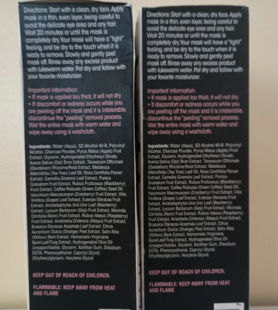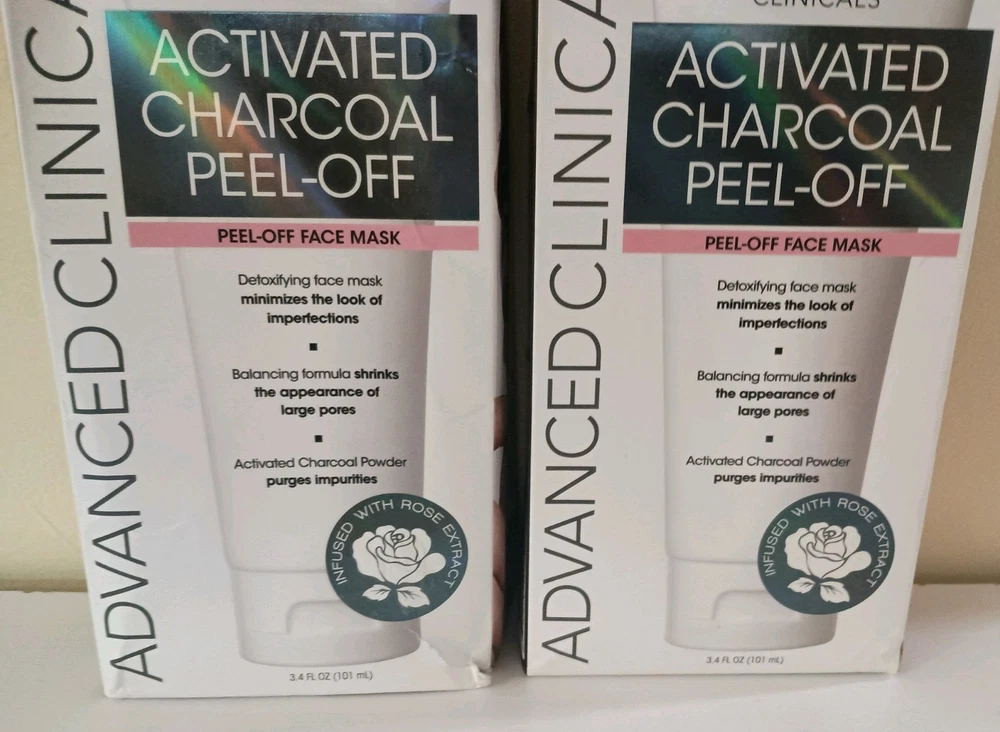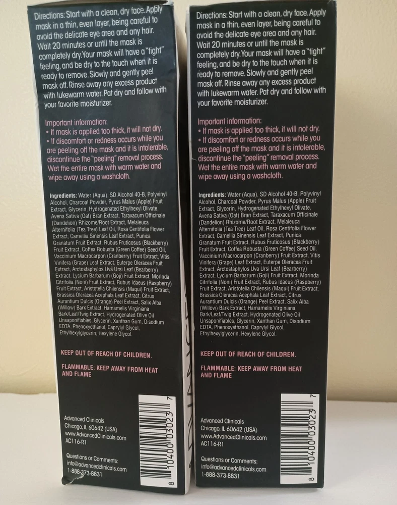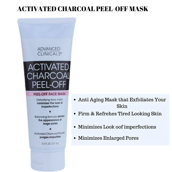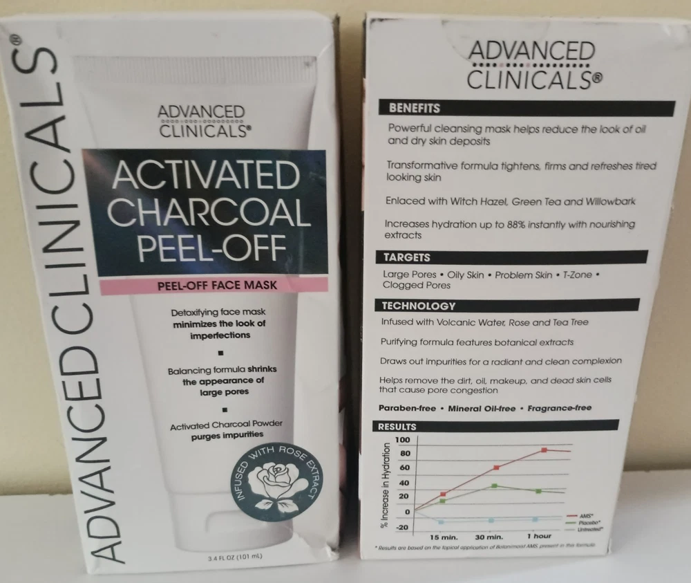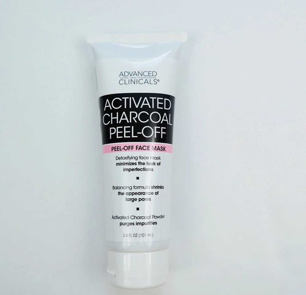 Advanced Clinicals® Activated Charcoal Peel-Off Face Mask 3.4oz (2 Pack) for Men & Women, Two 3.4 oz Tubes in Factory Sealed Boxes by Advanced Clinicals® A powerful cleansing mask that reduces the look of oily and dry skin. • Targets large pores, oily skin, problem skin and clogged pores • Purifying formula featuring botanical extracts • Paraben free • Mineral Oil free • Increases hydration by up to 88%. • Enlaced with Witch Hazel, Green Tea, Volcanic Water, Rose, Tea Tree & Willow bark. • This mask peels off impurities and promotes a radiant and clean complexion. • Shrinks large pores which are prone to oil and bacteria. • Advanced Clinicals® Activated Charcoal Peel-Off Face Mask 3.4oz (2 Pack) • All Skin Types Ingredients: Water, SD alcohol 40-B, polyvinyl alcohol, charcoal powder, pyrus malus (apple) fruit extract, glycerin, hydrogenated ethylhexyl olivate, avena sativa (oat) bran extract, volcanic water, taraxacum officinale (dandelion) rhizome/root extract, melaleuca alternifolia (tea tree)leaf oil, rosa centifolia flower extract, camellia sinensis leafextract, punica granatum fruit extract, rubus fruticosus (blackberry) fruit extract, coffea robusta (green coffee) seed oil, vaccinium macrocarpon (cranberry) fruit extract, vitis vinifera (grape) leaf extract, euterpe oleracea fruit extract, arctostaphylos uva ursi leaf (bearberry) extract, lycium barbarum (goji) fruit extract, morinda citrifolia(noni) fruit extract, rubus idaeus (raspberry) fruit extract, aristotelia chilensis (maqui) fruit extract, brassica oleracea acephala leaf extract, citrus aurnatium dulcis (orange) peel extract, salix alba (willow) bark extract, hamamelis virginiana bark/leaf/twig extract, hydrogenated olive oil unsaponifiables, glycerin, xanthan gum, disodium edta, phenoxyethanol, caprylyl glycol, ethylhexylglycerin, hexylene glycol Skincare Directions for Use: Start with a clean, dry face. Apply mask in a thin, even layer, being careful to avoid the delicate eye area and any hair. Wait 20 minutes or until the mask is completely dry. Your mask will have a “tight” feeling, and be dry to the touch when it is ready to remove. Slowly and gently peel mask off. Rinse away any excess product with lukewarm water. Pat dry and follow with your favorite moisturizer. Dimensions: 7.0 inches (H) x 1.75 inches (W) x 2.75 inches (L) Weight: 3.4 ounces Made in United States UPC: 810400030237