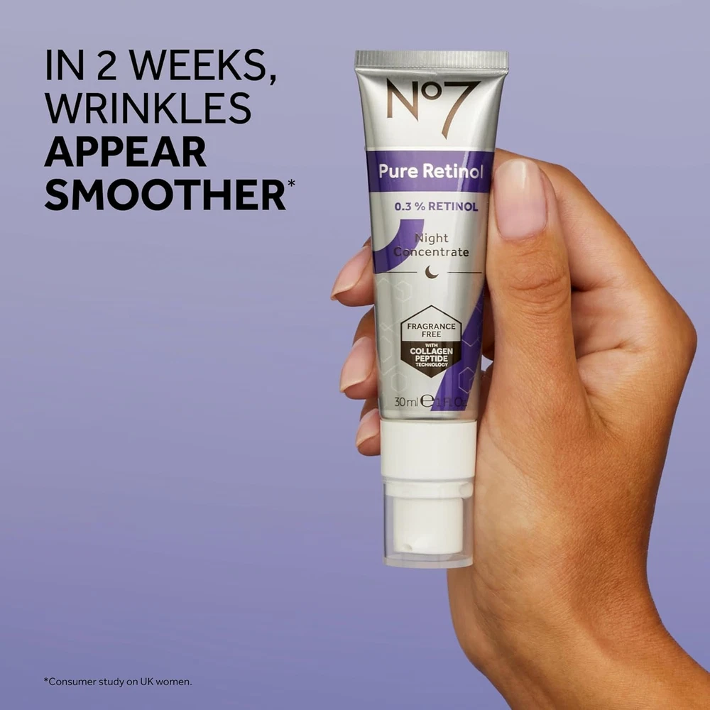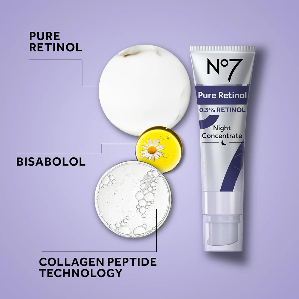 This night retinol concentrate offers a boost of overnight anti-aging power that reboots and renews skin, helping it act like younger, healthier-looking skin. This boosted anti-wrinkle serum also helps to refine pores acting as a pore cleaner. Age-Defying Ingredients & Technology - Now for the first time, No7 has combined two powerful age-defying skincare technologies in one expert night serum for face formula. With a next-generation retinol complex and our advanced peptide technology, Matrixyl 3000+™, this pore minimizer retinol serum is the ultimate anti-aging serum night time skincare users need in their rotation. For Skin that Looks Smooth & Firm - When using this retinol serum for face, lines look smoother, skin tone looks even and skin appears firm, lifted, brighter and more radiant while pores and texture look refined. The multi action formula acts as a wrinkle night serum and a pore minimizer for face while also targeting fine lines and wrinkles. Slow-Release Technology for Optimal Efficacy - This retinol night cream concentrate features a unique slow-release retinol delivery system that offers powerful retinol for face results while minimizing irritation commonly associated with retinol facial treatments and retinol for dark spot products. Empowering Women Since 1935 - No7 offers women luxurious and glamorous beauty, like this skin renewing retinol serum, at an affordable price. Our products give women the support, confidence and momentum to live life on their own terms. Discover more skin care products like this dual resurfacing retinol serum and pore cleaner, and other anti-aging serum night repair products at the No 7 Amazon store. Product Description The video showcases the product in use. The video guides you through product setup. The video compares multiple products. The video shows the product being unpacked. Discover the Pure Retinol Line Add to Cart Add to Cart Add to Cart Add to Cart Customer Reviews 4.4 out of 5 stars 275 4.5 out of 5 stars 1,819 4.5 out of 5 stars 851 4.3 out of 5 stars 68 4.6 out of 5 stars 1,237 Price — $22.93 $ 22 . 93 $15.99 $ 15 . 99 $8.00 $ 8 . 00 $28.95 $ 28 . 95 Pure Retinol Collection ✔ ✔ ✔ ✔ ✔ Description Accelerates skin renewal Accelerates skin renewal Wrinkles look visibly reduced Provides soothing moisture Gentler skin renewal formula Step in Routine Use once-twice weekly Use nightly Use every other night Use daily Use once-twice weekly For All Skin Types ✔ ✔ ✔ ✔ ✔ When to Use PM PM PM PM PM
