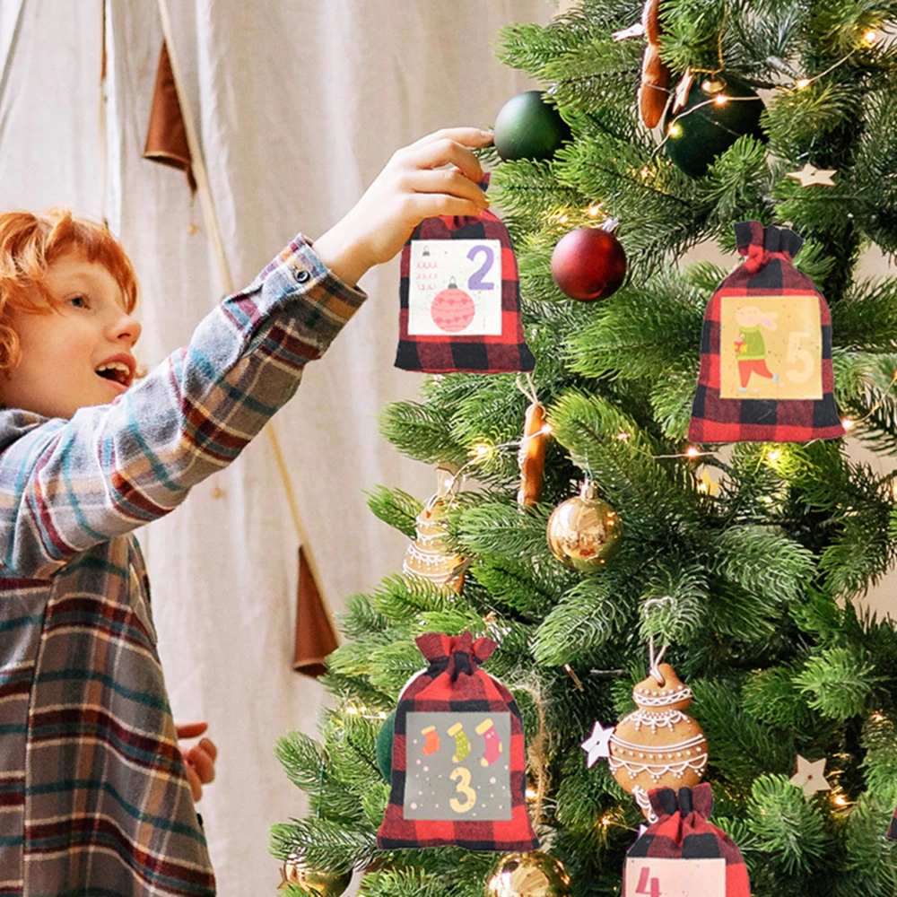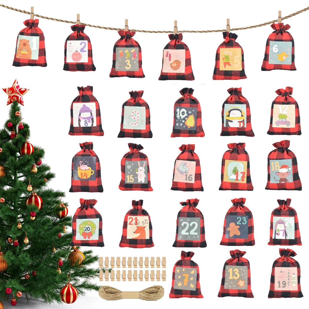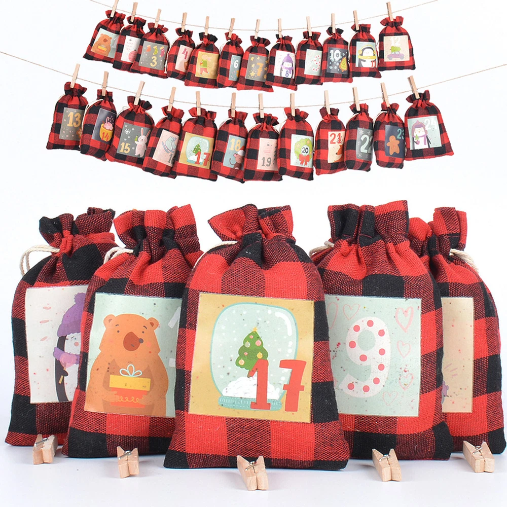 Advent Calendar Hanging 24 Days Christmas Candy Bags Drawstring With 24 Clips