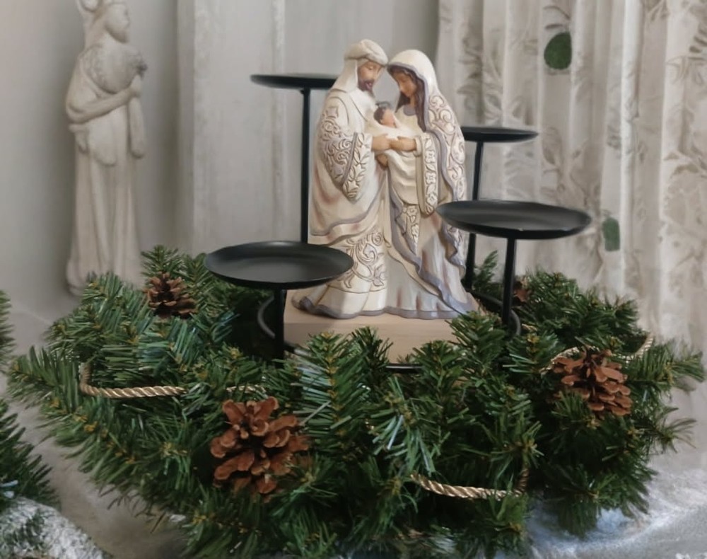 Advent Wreath with Baby Jesus, Joseph, and Mary statue & candle holder. Candles sold separately.