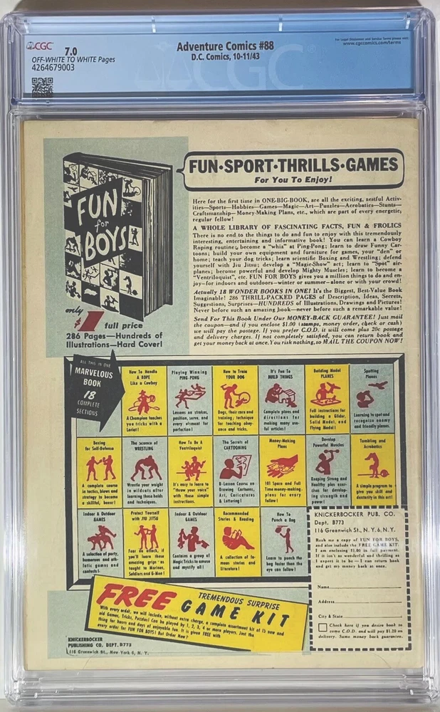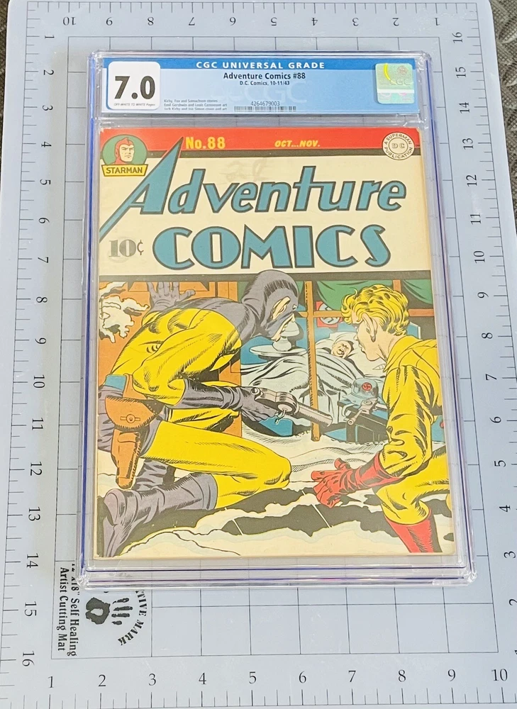 ⭐️ Adventure Comics #88 ⭐️ DC 1943, ⭐️ . CGC 7.0 Very Fine ⭐️ Terrific Simon & Kirby Sandman 🔥 ⭐️ . WWII Nazi Cover 🇺🇸 ⭐️ Very Cool Splash, Sandman, ⭐️ . Manhunter and Starman Art ⭐️ Digital examples included in photos ⭐️ Low Census (See Photos) ⭐️ DC-SandMan Collectina ⭐️ ⭐️ . Scarce Early Golden Age Adventure Comics including The Sand Man in Very Fine condition are very sought after books and are in high demand . The Sandman was originally one of the "mystery men" to appear in comic books and other types of adventure fiction in the 1930s, but later was outfitted with a Purple and yellow costume and developed into a proper superhero, acquiring a sidekick, Sandy, and founding the Justice Society of America (JSA) 🇺🇸 Wizard Magazine ranked The Sandman Wesley Dodds among the Top 200 Comic Book Characters of All Time, and he is the oldest superhero in terms of continuity to appear on the list. This Golden Age Very Fine beauty exemplifies American Patriotism during WWII ! This encapsulated gem is close to 80 years old and will provide the next proud owner a great investment for years to come! Happy Collecting !!