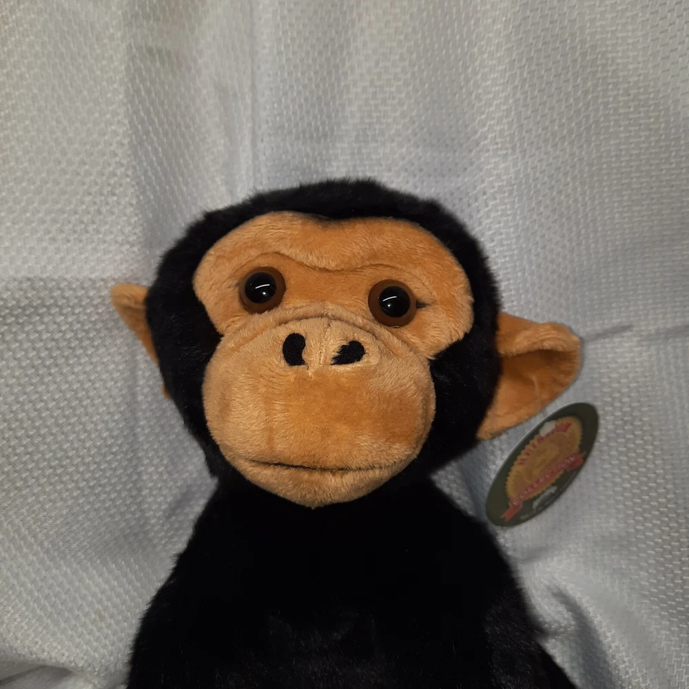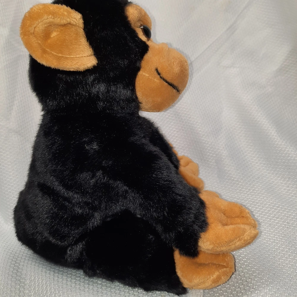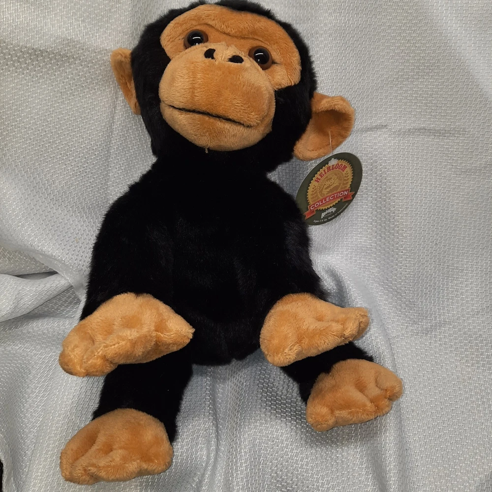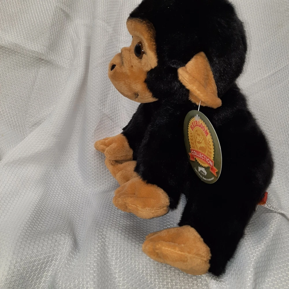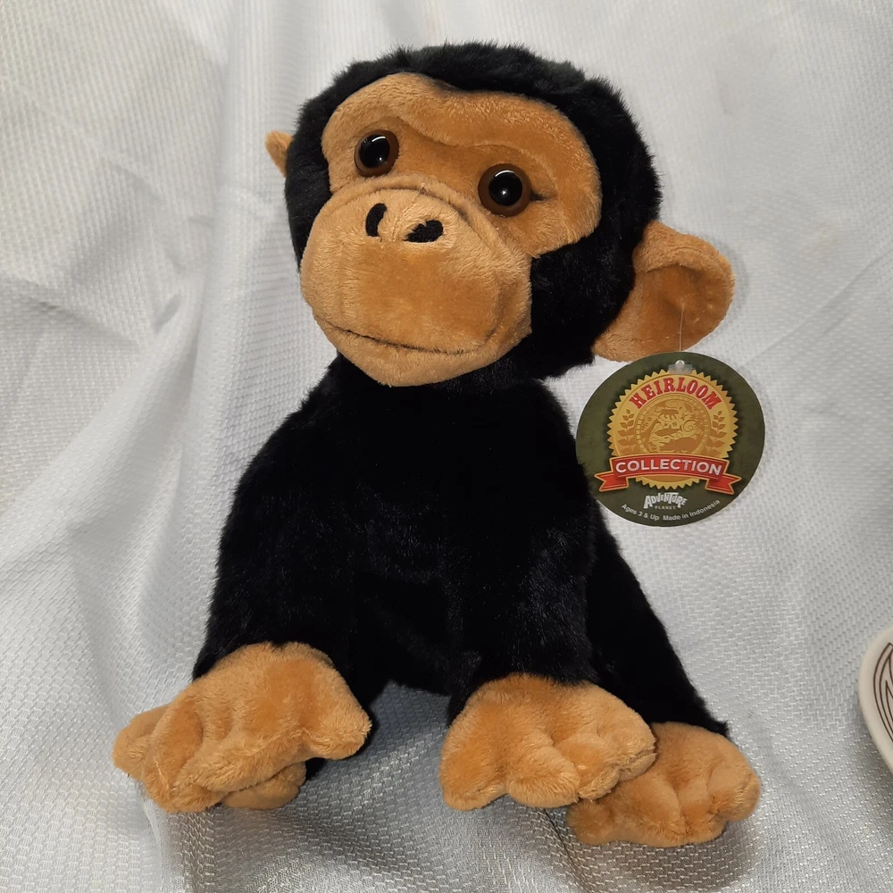 This product is a 12-inch plush chimpanzee toy from the Adventure Planet Heirloom Collection. It features a black color and is made in Indonesia. The toy is suitable for children aged 3 years and above, making it an ideal birthday gift for kids and adults who love stuffed animals.