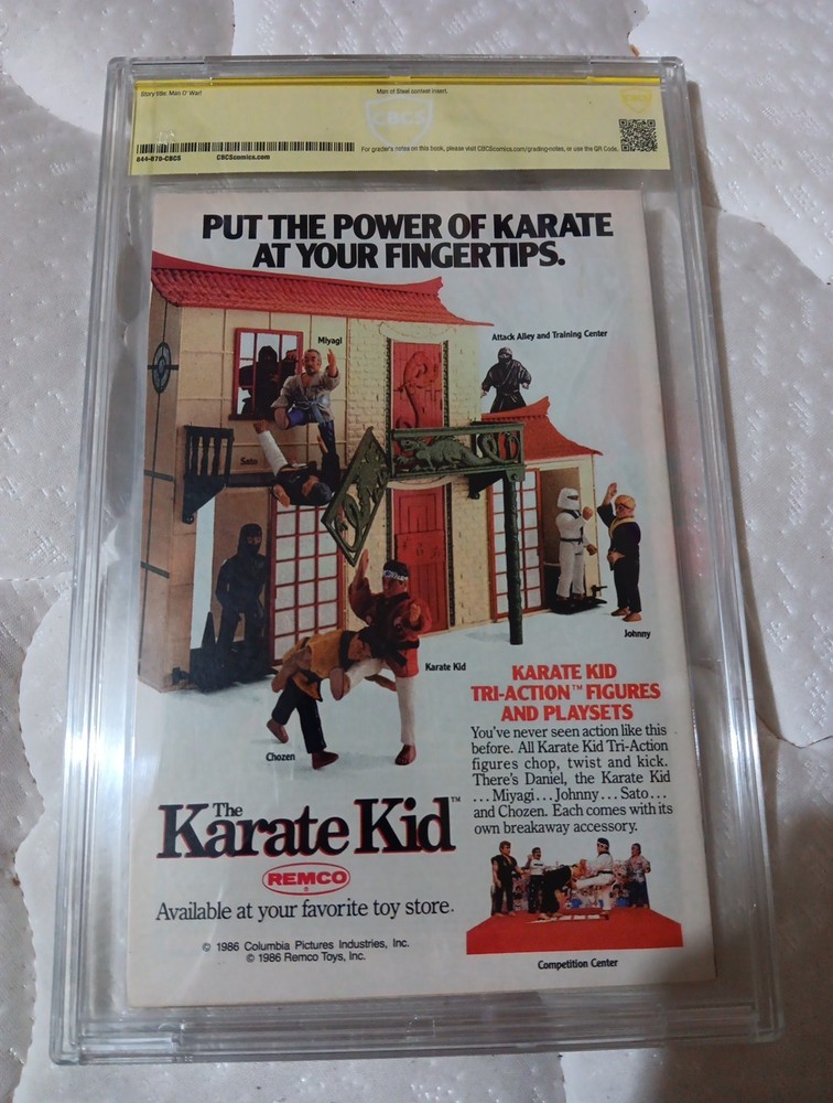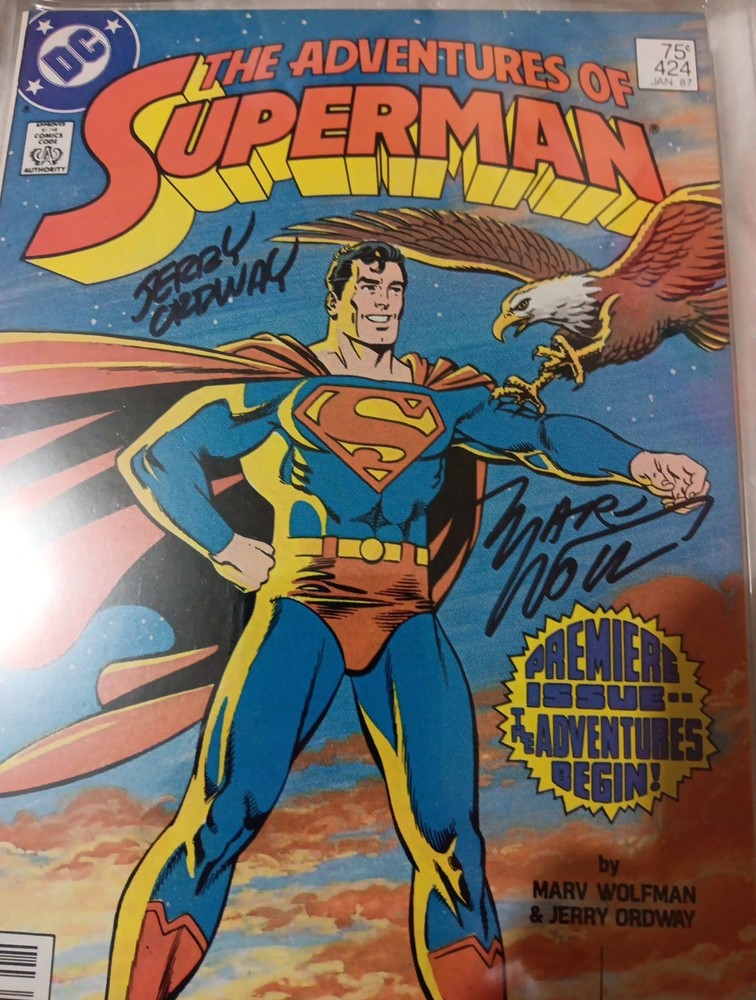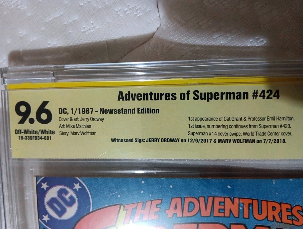 The product is a vintage comic book, Adventures of Superman #424 from January 1987, featuring the first appearance of Cat Grant. This single issue is autographed by Marv Wolfman and Jerry Ordway, with a grade of 9.6 Near Mint+. It is a key issue with a colorful style, part of the DC Universe and the Modern Age era of US Comics. With its iconic superhero, Superman, and the signatures of renowned artists and writers, this collectible item is a must-have for comic book enthusiasts and fans of the Superman series.