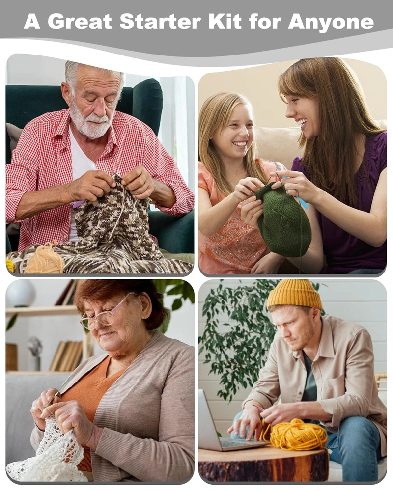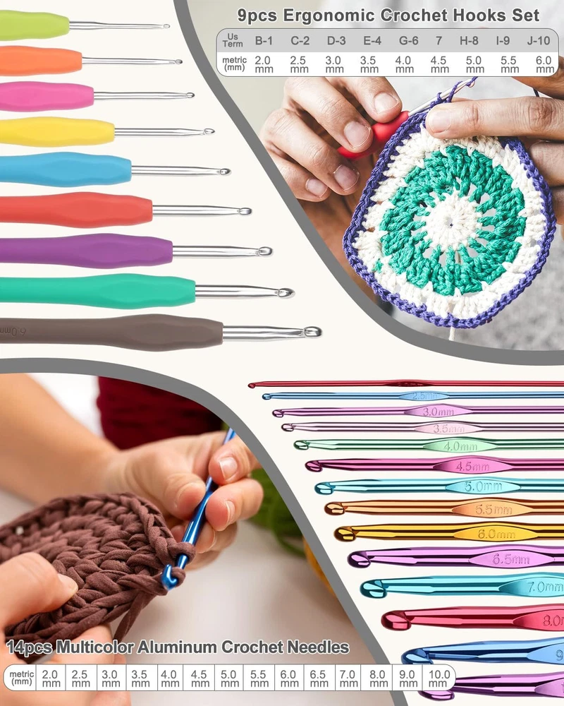 Crochet Kit for Beginners Adult and , 77pcs Crochet Kit with Everything Include 9pcs Colorful Crochet Hooks Ergonomic Soft Grip for Arthritic Hands, 14pcs Multicolor Aluminum Crochet Hooks Knitting Needles, 12 Colors Colorful Acrylic Yarn Balls for Crochet Knitting Crafts, Metal tapestry needles, Practical Crochet Storage Bag & Accessories, Gift for Crochet and Knitting Lovers Beginners Crochet Kit includes: 20 x practical stitch markers 12 x colorful acrylic yarn balls 14 x aluminum crochet needles 9 x ergonomic crochet hooks 10 x Metal tapestry needles in little carrying tube 6 x Point Protectors 2 x pom pom makers 1 x tape measure 1 x scissors 1 x instruction booklet 1 x storage bag 9 crochet hooks with soft grip complete sizes: 2.0mm / 2.5mm / 3.0mm / 3.5mm / 4.0mm / 4.5mm / 5.0mm / 5.5mm / 6.0mm 14 Aluminum Crochet Hooks Knitting Needles sizes: 2.0mm / 2.5mm / 3.0mm / 3.5mm / 4.0mm / 4.5mm / 5.0mm / 5.5mm / 6.0mm / 6.5mm / 7.0mm / 8.0mm / 9.0mm / 10.0mm The crochet size is marked on the handle, so you can easily distinguish it and pick the you need. Multifunctional Storage Bag: Not only can crochet tools, but also can toiletries and storage items. A great starter kit for anyone interested in crochet. You can start to learn how to crochet and enjoy your crochet journey as soon as you receive it. GOOD KIT for CROCHETER: 14pcs aluminum knitting needles and 9pcs ergonomic crochet hooks,12pcs different colors yarns, 20pcs stitch markers, 9pcs metal tapestry needles,6pcs point protectors,tape measure, scissors, pom pom maker, crocheting instruction booklet and crochet tote bag. Crochet kit for either new crocheter, or even someone just looking to get a good value to expand their crochet hook library, as well as other useful crochet notions & tools. STEP-BY-STEP INSTRUCTION: Aeelike crochet starter kit comes with instruction booklet of basic stitches and information for beginners or anyone needing a refresher. Great collection of colors and different sizes of hooks, include a size guide to help you choose the correct hook for your yarn! 23pcs CROCHET HOOKS: The soft handle ergonomic hooks come in the sizes 2.0mm 2.5mm 3.0mm 3.5mm 4.0mm 4.5mm 5.0mm 5.5mm 6.0mm, and the metal knitting needles come in the sizes 2.0 2.5 3.0 3.5 4.0 4.5 5.0 5.5 6.0 6.5 7.0 8.0 9.0 10.0mm. Aeelike crochet kit gives you enough sizes to work any yarn from fingerling (1 gauge) to super bulky yarn (6 gauge), meaning you could complete 99% of the projects you could ever want to do just with this set of hooks alone. MULTICOLORED ACRYLIC YARN: Beginner crochet kit with 12pcs different colors yarns 655 Yards ( 10.56 oz) in total, the variety of yarn colors gives enough to practice. Then you can creative and crochet plushies, trinkets, handbags, hats, scarves, gloves, shoes, shawls, blankets etc. The portable bag will organize all your crochet supplies neatly in place. Great for traveling / home with projects. GREAT GIFT for ANYONE: Crocheting is a wonderful and enjoyable hobby that popular craft among people of all ages around the world. This crochet set with everything perfect to anyone who is starting to become interested in learning to crochet. Crochet starter kit is an ideal gift for your family and yourself, warm and intimate!