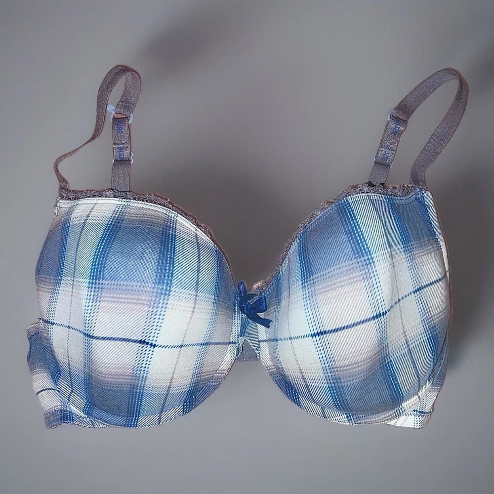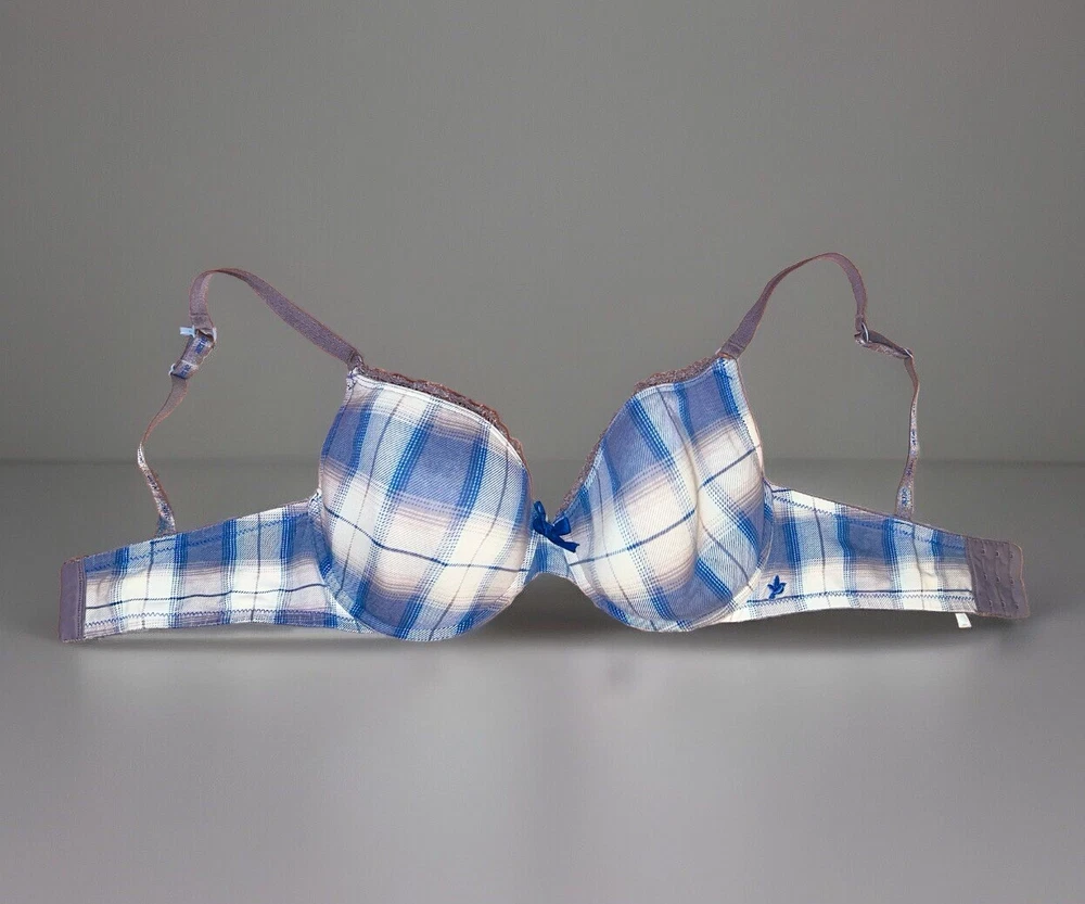 Aerie 34DD Sasha Bra- Blue & White Plaid Print. Condition: Very good for being from the early 2000s. Has been in storage is very clean, stain free, tear and rip free as well. No odor. Only worn a couple of times years back, very cute bra but no longer fits. Features: Lightly Lined, Has Underwire. Small dark blue bow in the middle of the bra. Adjustable straps.
