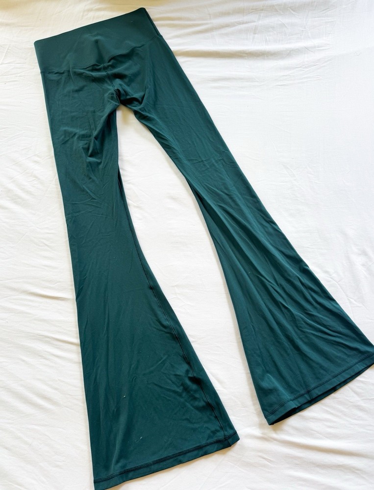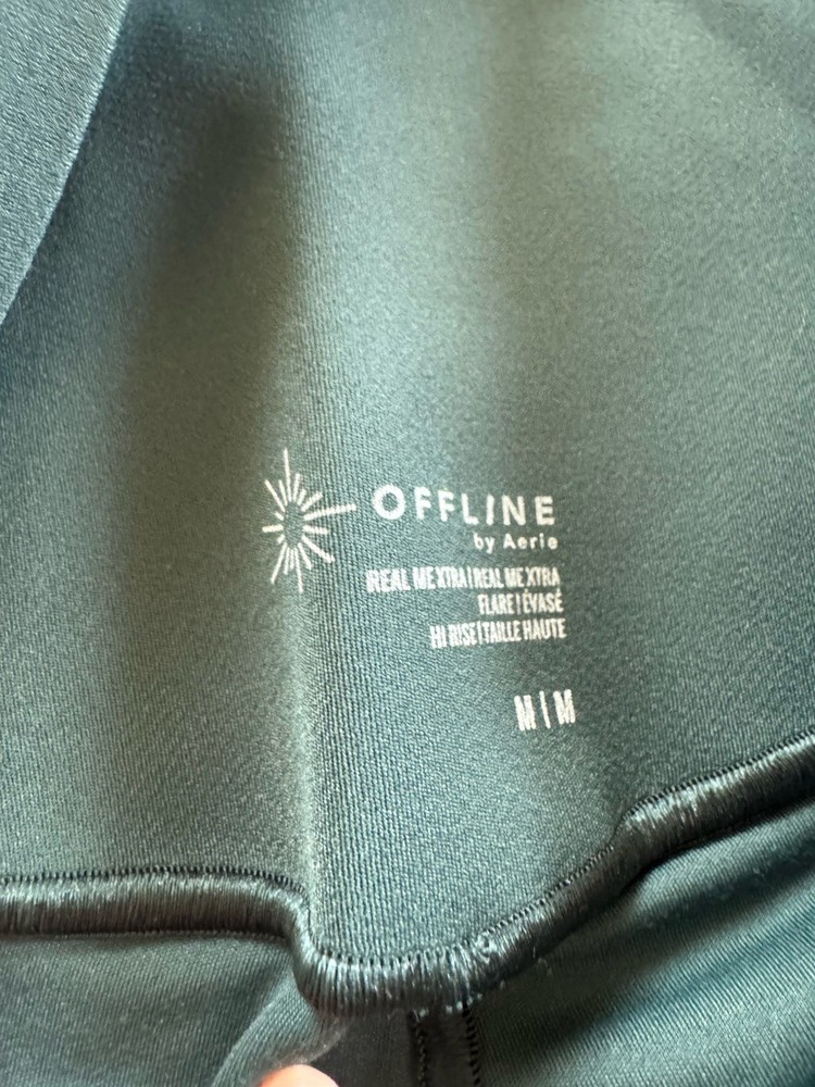 The OFFLINE By Aerie Real Me Flare Hi-Rise Leggings in Green, Size Medium, are versatile and stylish leggings perfect for various occasions including travel, activewear, and casual outings. Made with a blend of nylon and elastane, these leggings offer comfort and stretch with an elastic waist for a secure fit. The flared style and high rise make them a fashionable choice for the modern woman, suitable for activities like gym training, walking, and yoga. The solid green color and athleisure theme add a touch of sporty chic to your wardrobe, making them a must-have for all seasons.