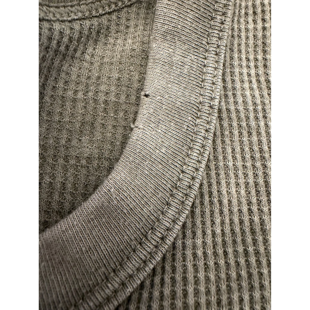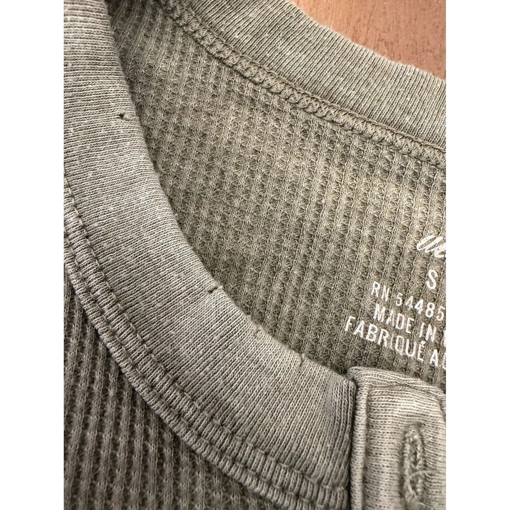 Aerie long sleeve henley top in a muted sage green or olive drab color. This thermal shirt features a classic waffle knit texture, a multi-button placket, and a curved hemline. Designed with a slim fit and extended cuffs, it provides a cozy, layered look perfect for casual wear or lounging. Note that there are some minor pinholes near the neckline as shown in the detail photos. Measurements: • Pit to Pit: 14.5" (29" doubled) • Length: 23"