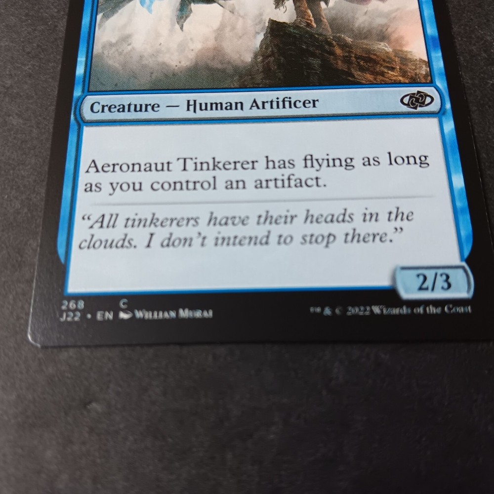 Manufacturer:Wizards of the CoastAdditional Description:Aeronaut TinkererLanguage:EnglishFinish:RegularIllustrator:Willian MuraiDefense/Toughness:3Card Type:CreatureCost:2ubrand:Wizards of the CoastSet:Jumpstart 2022Game:Magic: The GatheringAttribute/MTG:Color:BlueRarity:CommonCard Number:268Creature/Monster Type:Human, ArtificerCard Name:Aeronaut TinkererAttack/Power:2Card Text:Aeronaut Tinkerer has flying as long as you control an artifact.