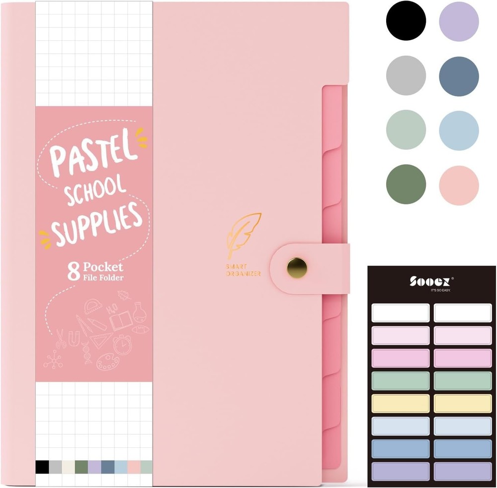Aesthetic 8 Pocket Accordion File Organizer, Pastels Expanding File Folder for Important Document with Labels, Portable Receipt Bill Paper Organizer for Office School Supplies, Letter Size Pink 2024 New Aesthetic Color: Elegant pattern design and eye-catching colors, this file folder can brighten up your workspace, quickly find your files in drawers or shelves, and greatly improve work efficiency. With a total of 9 pastels colors to choose from, you're sure to find one you love. Keep Organized: No need to worry about grabbing the wrong notes. With 8 large pockets, this expanding file folders make it easy to sort and organzie your bills, tax, reports, notes, records. The included sticker labels allow you to easily identify the topics, make it easy to find files and enhancing productivity! Portable: Designed for easy-access desktop filing and portability. 13 x inches. Suitable for A4/letter size, fits perfectly in your backpack. Lightweight and easy to carry around, keep your important papers handy and tidy, Ideal for meeting, traveling or school. Made to Last: The file organizer is made of high quality material, not easy to break and deform, protect your documents with durable, waterproof and tear-resistant. Upgraded Snap is very secure and keeps everything in place. Large Pocket Design: This accordion folder is designed with a expandable spine for more stretch and can hold more than 250 sheets of paper without being too bulky.