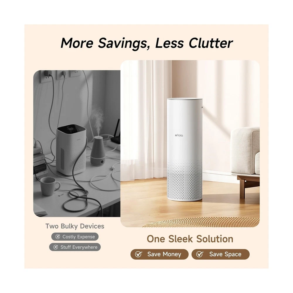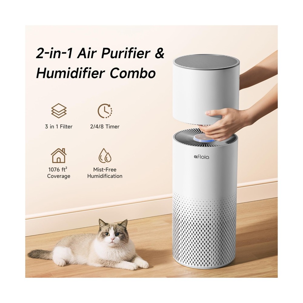 Afloia Humidifier and Air Purifier in One, Air Purifier and Evaporative Humidifier Combo for Home, 24dB Quiet Air Cleaner Remove Pets Dust Dander Hair Allergy Pollen Smoke Smell for Room Description Features: 2-in-1 Air Purifier & Humidifier: Kilo Pro - Simultaneously purifies and humidifies air. Covers up to 1076 ft2 per hour, perfect for bedrooms, living rooms, and offices (Note: Humidifier function cannot be used separately) 3-Stage Filter: Improves overall air quality and helps relieve coughing, sneezing, and allergy symptoms Mist-Free Humidification with Evaporative Technology: Uses natural cold evaporation and a humidifier filter to release clean, evenly dispersed moisture. No water puddles, no white dust 7-Color Ambient Light: Customize the atmosphere with 7 soothing light colorsideal for any room. Light automatically softens in Sleep Mode, create a calming environment for rest 3 Fan Speeds & 8-Hour Timer: Choose from three fan speeds to control purification and humidity levels based on your room's needs. Set the auto shut-off timer for up to 8 hours for worry-free use day or night Remote Control: Easily turn the device on/off, adjust fan speeds, lights, and timer settingsall from across the room. No need to get up from your bed or sofa Top-Fill Water Design: Refill with ease by removing the top mesh lid and pouring water directly insideno need to remove or flip over a bulky tank Whats in the Box:Air Purifier 1, Humidifier Module 1, 3-Stage Filter 1, Humidifier Filter 1, Power Adapter 1, Remote Control 1, User Manual 1, 1-Year Warranty for Peace of Mind Product Details: Color: White Brand: Afloia Product Dimensions: 7.6"D x 7.6"W x 21.8"H Floor Area: 46 Square Inches Specification Met: CE Certified, EPA Certified, FCC Certified Product Dimensions ‏ : ‎ 7.6 x 7.6 x 21.8 inches; 7 Pounds Item model number ‏ : ‎ Kilopro Date First Available ‏ : ‎ May 19, 2025 Manufacturer ‏ : ‎ Afloia Best Sellers Rank: #144,716 in Home & Kitchen (See Top 100 in Home & Kitchen) #300 in Home Air Purifiers #300 in Home Air Purifiers Customer Reviews: 4.7 4.7 out of 5 stars 39 ratings Delivery We Do Not Ship Outside of the Continental US. Return Policy All items qualify for returns within 30 days of receipt. Feedback We take our reputation seriously, we buy and sell online, so we understand the value of trust. If you are unsatisfied with your order, please contact us and we will work with you to resolve it to your satisfaction.