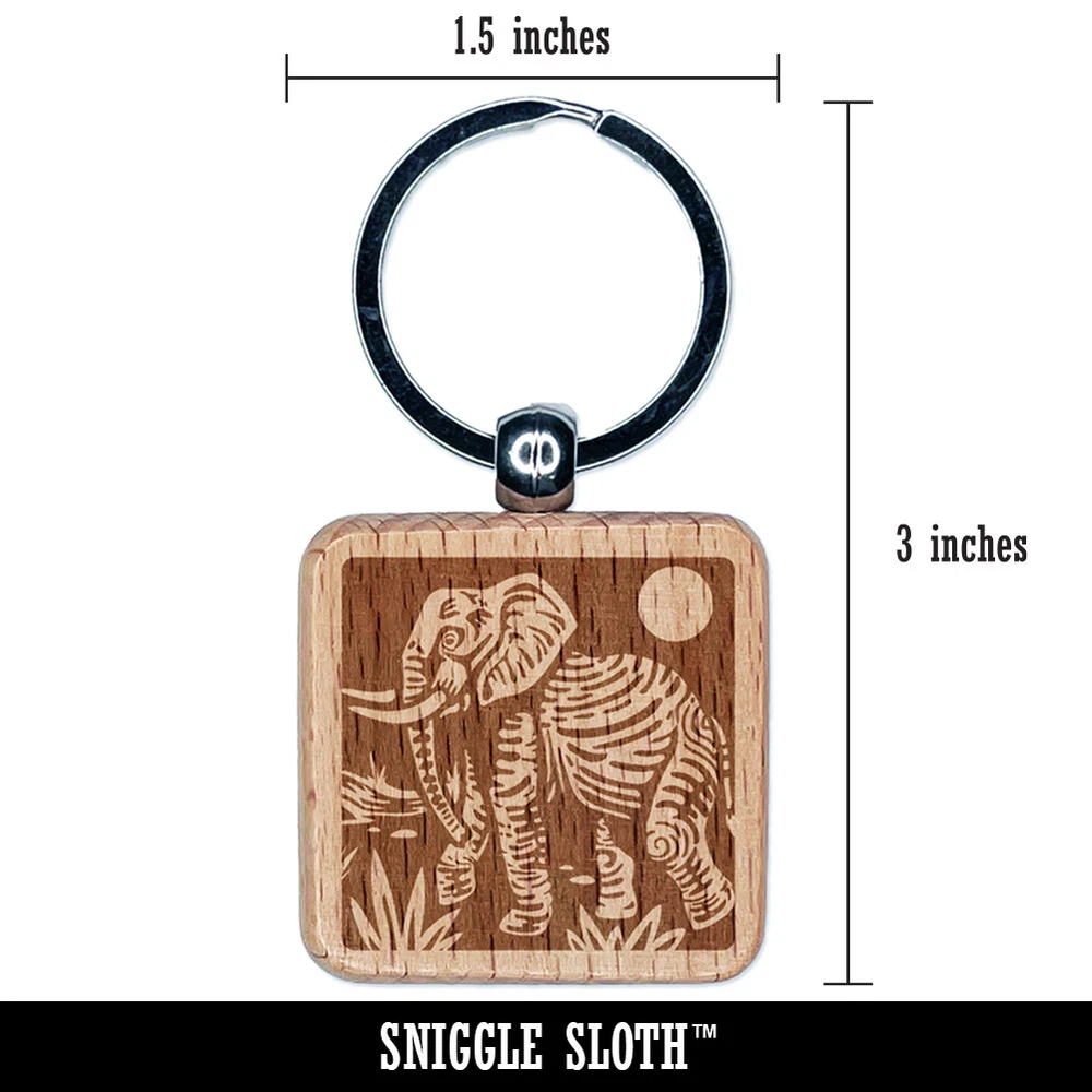African Elephant Engraved Wood Square Keychain Tag Charm