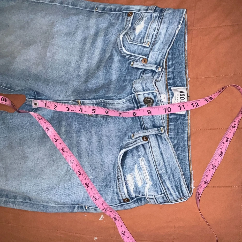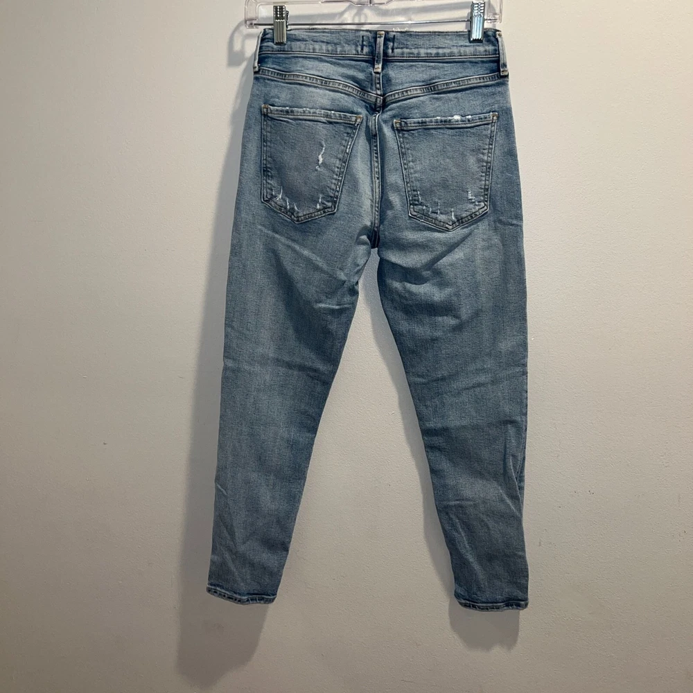 These Agolde Los angeles the Sophie crop high waisted ripped jeans in size 26 are tailored for a modern fit. Crafted with high-quality denim, these jeans feature a distressed design, adding a touch of rugged style to your wardrobe. • Front and back pockets • Button and zip closure • Ankle-length cut • Light wash finish Size 26 Great Preowned conditions