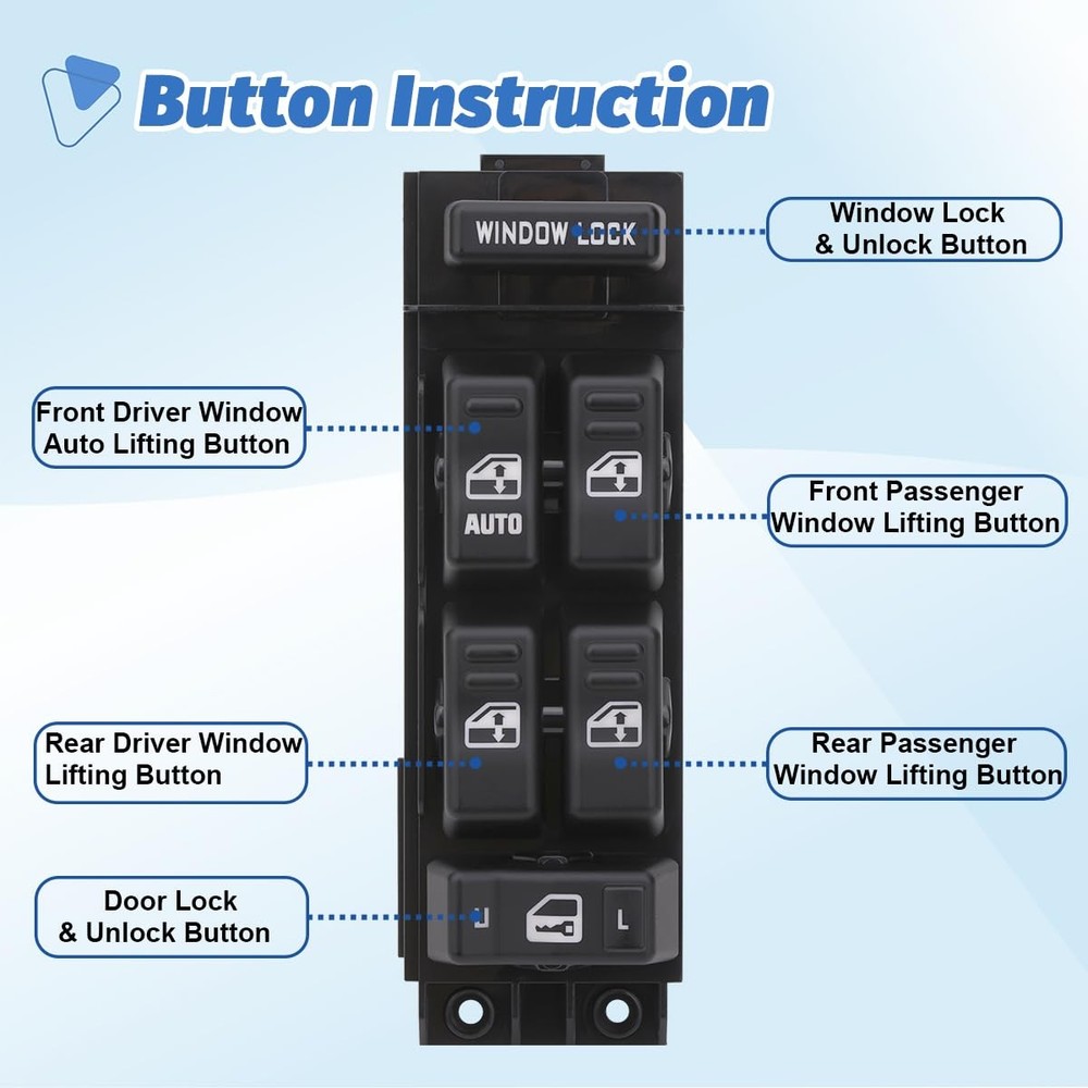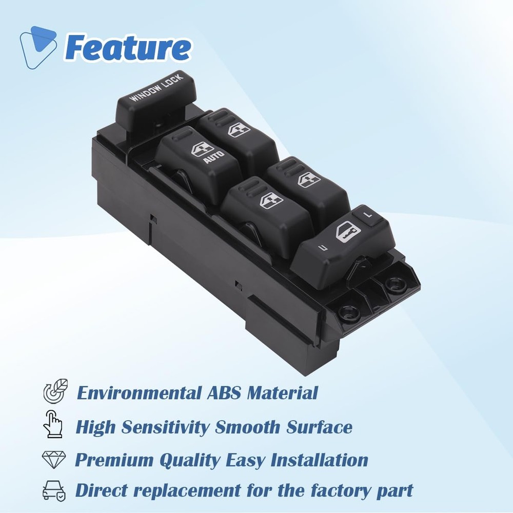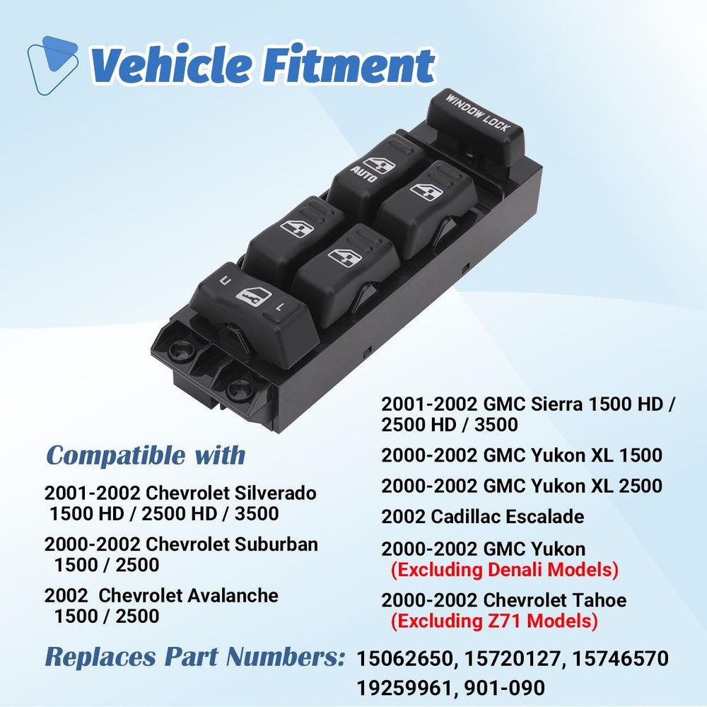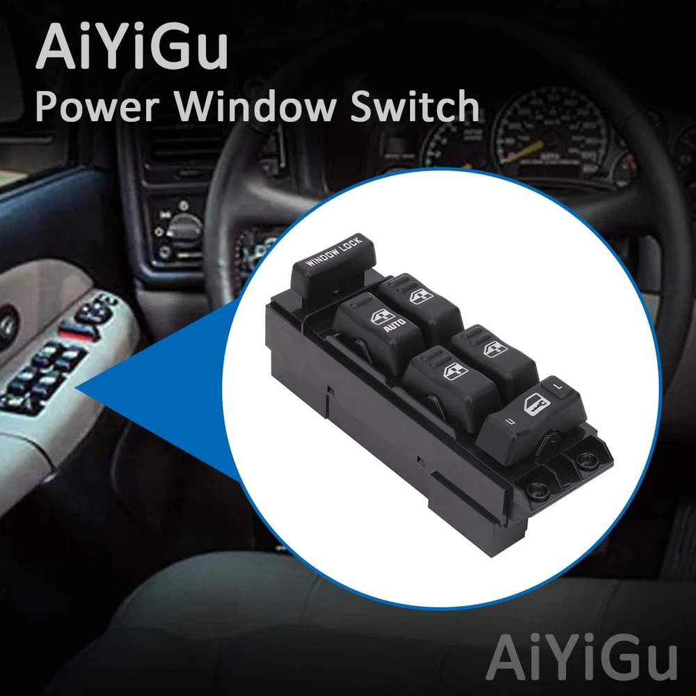 AiYiGu Power Window Switch Control Button Driver Side Compatible with 2000-2002 Chevrolet Chevy Tahoe Silverado Suburban Avalanche GMC Yukon Sierra 1500 2500 3500 Cadillac Escalade Replaces 19259961 Description Features: 【Compatibility】This master power window switch compatible with 2000-2002 Tahoe / Suburban 1500 / 2500, 2001-2002 Chevrolet Silverado 1500 HD / 2500 HD / 3500, 2002 Avalanche 1500 / 2500; 2001-2002 GMC Sierra 1500 HD / 2500 HD / 3500, 2000-2002 Yukon / XL 1500 / XL 2500, 2002 Cadillac Escalade. 【Specification】① Terminal Connector: 8 + 12 pins; ② Material: ABS plastic; ③Button: 1 Auto up & down/ window lock/ door look; ④ Package Content: 1 x power window switch + 1 x switch removal tool. 【Easy Installation】Plug and play style. Just need to remove the defective switch and replace it, easy to install.Please check your original switch thoroughly to ensure you are ordering the correct switch. 【Purchase Without Worry】 If the master power window control switch has any problems, simply contact us for giving you a satisfactory solution. Product Details: Handling We will ship all orders within 1 business day of payment. Delivery We Do Not Ship Outside of the Continental US. Return Policy All items qualify for returns within 30 days of receipt. Buyer is responsible for return shipping on any item that is not damaged. Feedback We take our reputation seriously, we buy and sell online, so we understand the value of trust. If you are unsatisfied with your order, please contact us and we will work with you to resolve it to your satisfaction.