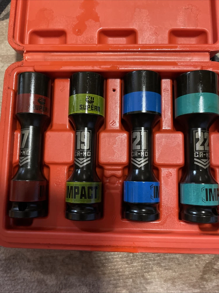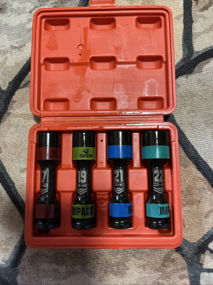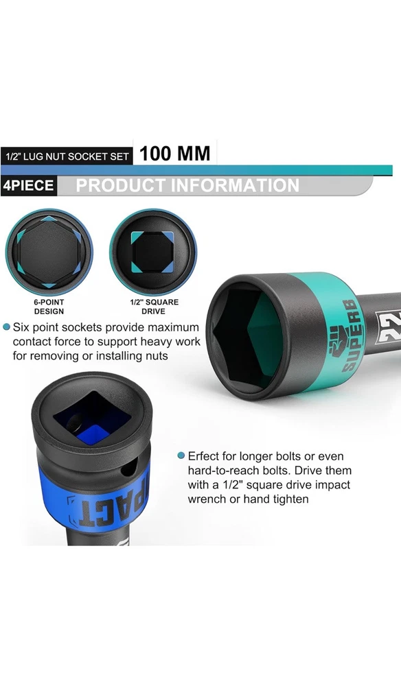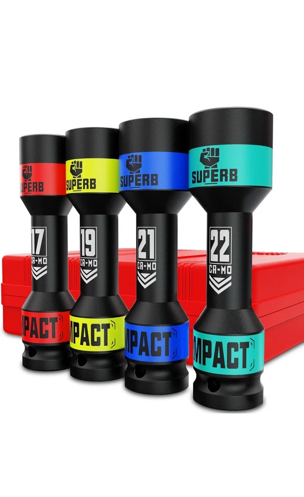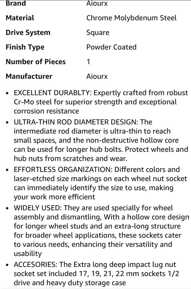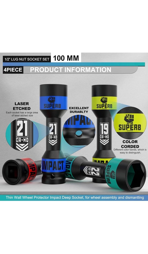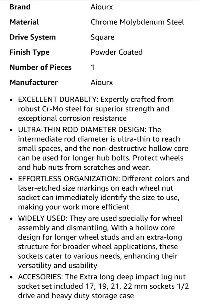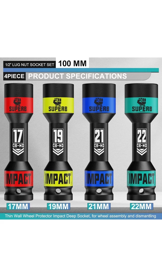The Aiourx Superb Lug Nut Socket Set is a set of 4 impact sockets designed for lug nut removal and installation. The sockets are made from durable Chrome Molybdenum Steel with a 6-point design, ensuring a secure grip on nuts without causing damage. The set includes sockets in sizes 17mm, 19mm, 21mm, and 22mm, all in a 1/2 inch drive size. These non-marring sockets are suitable for use with metric measurements and are a valuable addition to any automotive tool collection.