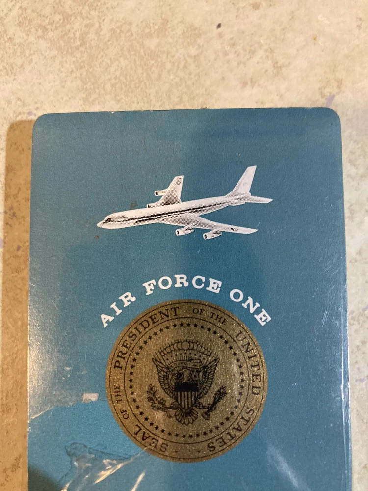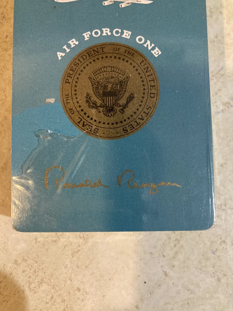 The product is a deck of playing cards featuring the Presidential Seal used during Ronald Reagan's time in office, with Air Force One as the theme. This collectible item is new and sealed, manufactured in the United States. The deck likely showcases iconic symbols of Reagan's presidency and is a unique piece of historical memorabilia for fans of U.S. Presidents and political enthusiasts. Please look closely at the photos to assess condition for yourself. Payment is expected within two days of the winning bid or accepted offer. We only sell/ship to bidders in the continental United States. Please ask questions prior to bidding.