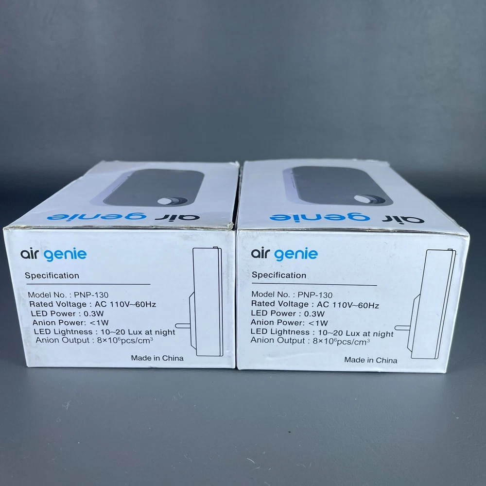 2 - Air Genie Plug N' Pure Smoke Dust Pet Odor Eliminator Plug in Air Freshener Both are New Open Box condition. One box has some kind of stain or got a bit wet but the actual unit inside is fine. • P lease see all pictures for details on condition. • Pictures are part of the description. • You will receive the exact items you see in the photos. • Please ask any questions you have. • We offer combined shipping for multiple orders. • Ships quickly Monday-Friday with USPS