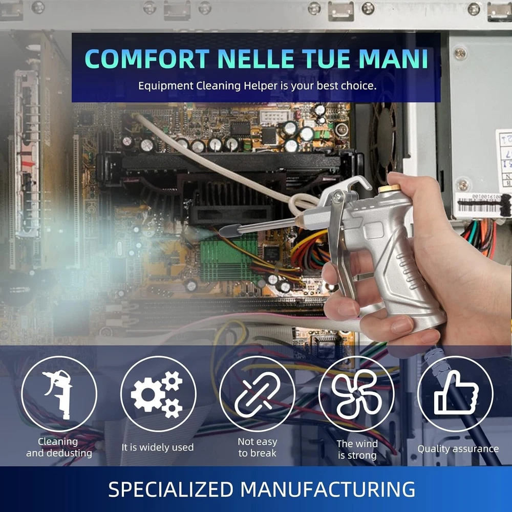 [Flexible Universal Air Blow Hose] -- Easily clean hard-to-reach narrow gaps, inside pipes and machine parts. [Short Nozzle] -- Adjustable copper nozzle rotates to control air flow volume, suitable for general scenes. [Straight Gun Nozzle] -- 3.7 and 6.4 inches, used in the more difficult to enter the space, strongly concentrated air nozzle. [Strong Airflow] -- Quality air compressor tools with high volume air flow, ideal for carpentry workplace and industrial workshop dust or powders blow off. Also for car repair shop cleaning work, household blind corner blowing off. [Air Tools and Accessories] -- You will get: 1 x air blow gun with standard quick coupling, 1 x adjustable air flow short nozzle, 2 x steel air flow extension, 1 x universal blow hose, 6 x sealing ring.