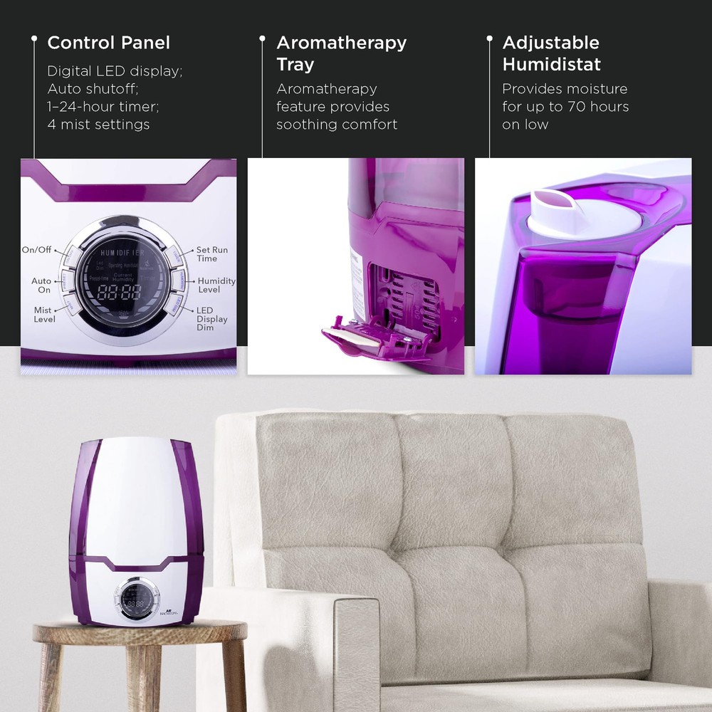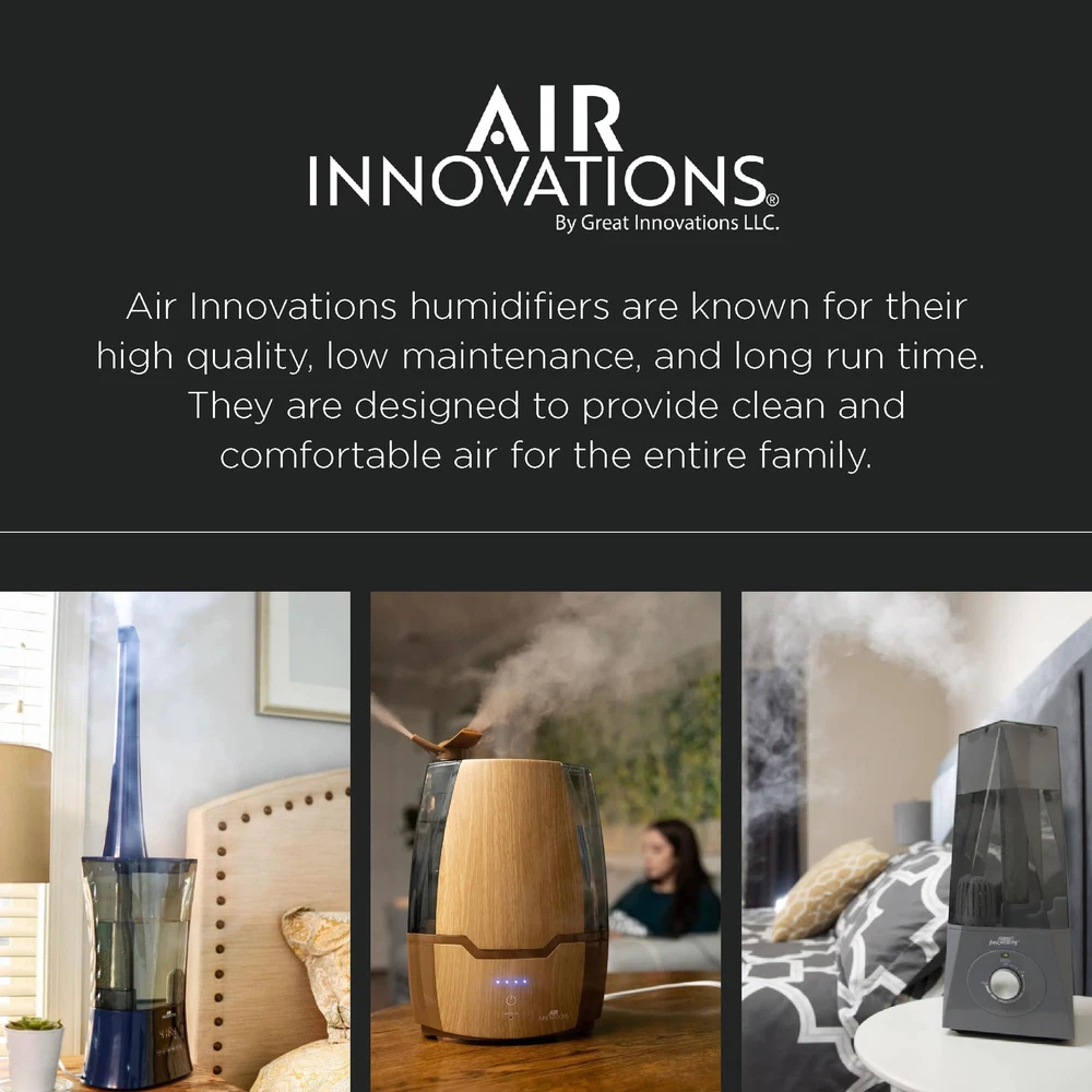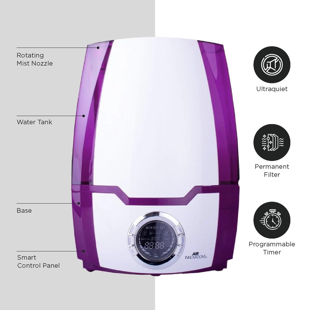 Breathe easier with the Air Innovations Ultrasonic Cool Mist Digital Smart Humidifier - Model 505A. For its size, it runs longer and it’s more versatile than any other humidifier on the market. This fully featured unit has a 1.37 gallon tank the runs up to 70 hours on low – that’s almost 9 nights of sleep before you have to refill it. The operation of this humidifier is silent for a peaceful night of sleep, yet it’s powerful enough to add humidity to large rooms up to 400 sq. ft. Other features include: built-in programmable humidistat that monitors and maintains the humidity levels that you set, a permanent ceramic filter that traps impurities from water, and a 360 degree rotating mist nozzle helps direct the moisture where you want it. It also features a fully programmable timer that turns on and off when you want it to, top and bottom handles for easy filling and carrying, extra wide opening for easy filling, and an auto out-of-water shut off when it runs out of water. It will also help kids and babies because the extra humidity will relieve dry eyes, rehydrate skin, help scratchy throats and will help reduce snoring for better sleeping. It also protects and rehydrates furniture, wood cabinets & floors and acoustic & electric guitars. Operates silent for long, uninterrupted sleep Puts clean, pure moisture back into the air Includes Aromatherapy Tray For large rooms up to 400 sq. ft. 4 mist settings: Low, Medium, High, Supreme Permanent ceramic filter never needs replaced Runs up to 70 hours on the low Auto shut off setting Digital LED display for easy operation Dual directional mist nozzle to point mist where you want it Adjustable humidistat to set the humidity level you want 24-hour timer 1.37 gallon tank Measures 9.25" L x 6.5" W x 12.75" H 1-year limited manufacturer's warranty Permanent Ceramic Filter That Never Needs Replacement | Programmable Built-in Humidistat That Monitors And Maintains The Humidity Level You Set 6.2L EXTRA LARGE WATER TANK: Impressive 6.2L super large water tank which keeps your Room-Humidifier running for over 70 hours on a single fill SILENT OPERATION & AUTO SHUTOFF: This baby humidifier runs almost silent to guarantee a full night's sleep without interruption, making it ideal for the bedroom. It also has an auto shutoff for your safety Runs For A Full 70 Hrs On Low (almost 9 Nights Of Sleep) And Is Completely Silent When Running As It Was Designed To Operate Quietly For Uninterrupted Sleep Fully Programmable Timer To Turn It On And Off When You Want It To | Auto Safety Shut Off And Audio Beep When It Runs Out Of Water