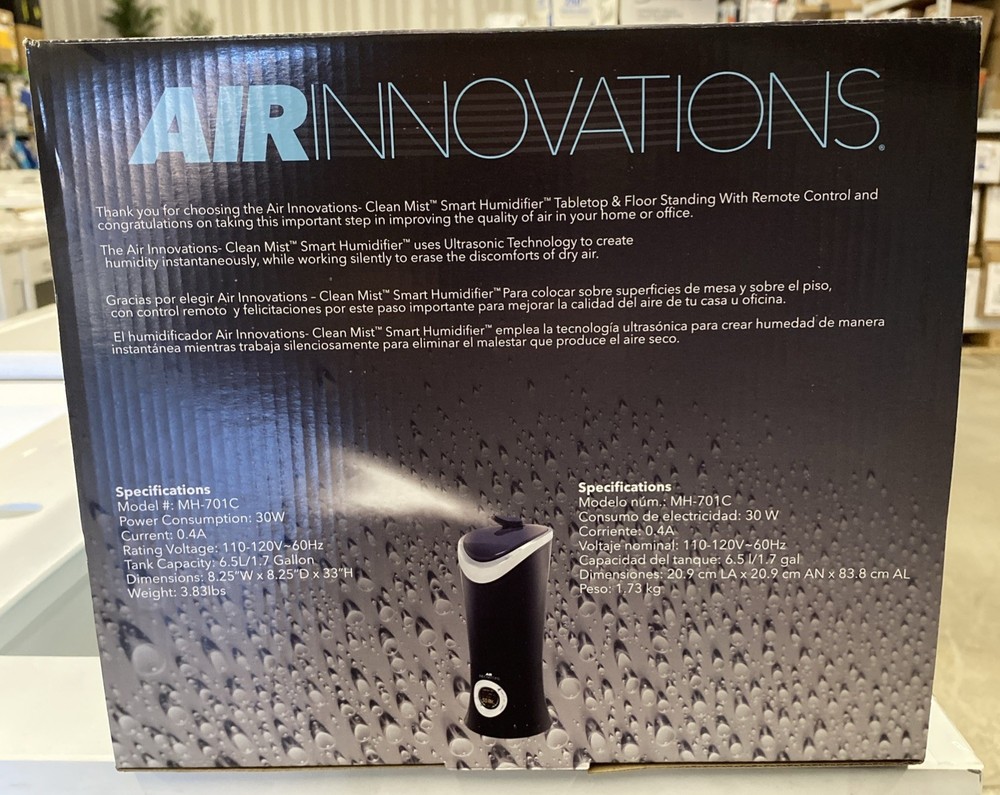 Air Innovations MH-701C Ultrasonic Cool Mist Humidifier – Large Room Brand new unit in original packaging. Ideal for bedrooms and living spaces. Quiet ultrasonic operation with adjustable mist levels and built-in aromatherapy tray. Features • Large room coverage • 1.7 gallon tank for extended run time • Remote control included • Adjustable timer & humidity levels • Auto shut-off safety • Night light function • Aromatherapy compatible Coverage Up to ~600 square feet
