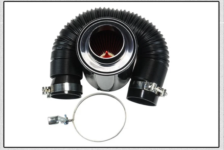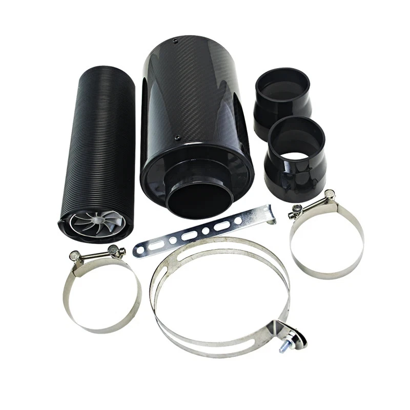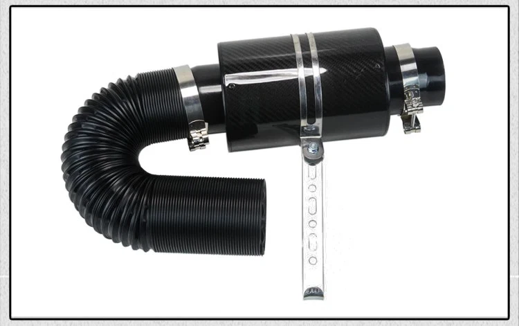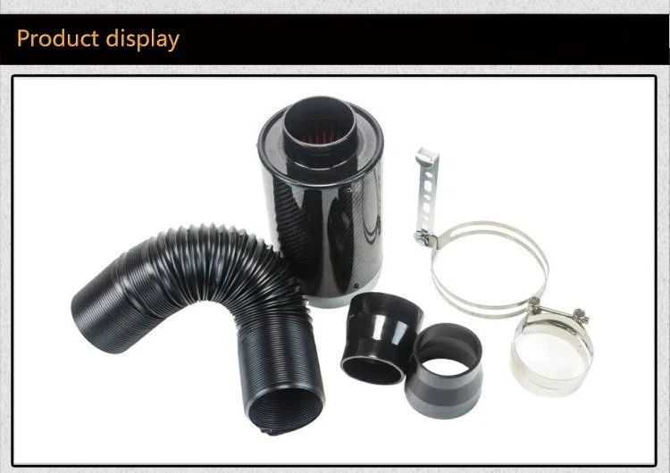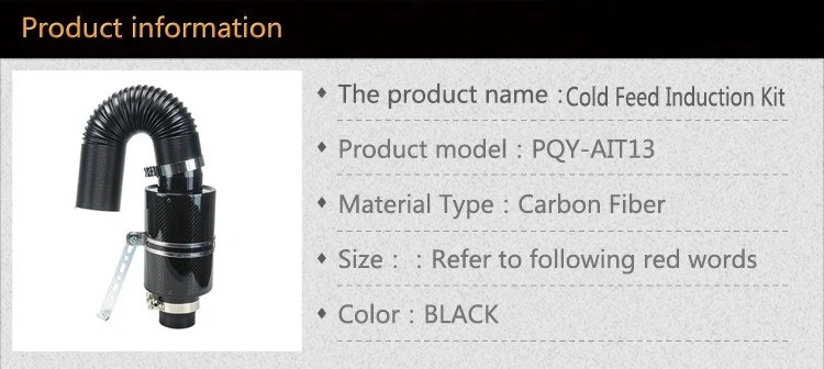 4767 Universal Racing Air Filter Box Carbon Fiber Cold Feed Induction Kit Air Intake Kit Without Fan PQY-AIT13 Application: Universal fits for most of cars Features and Benefits: A Cold Air intake system relocates the filter outside of the engine compartment to deliver the coolest air inlet temperatures possible. Cooler air carries more oxygen, which translates into a more intense explosion in the combustion chamber to create more horsepower and torque. But that's only part of the power equation. Tuning the inlet pipe in length and diameter to match the engine's resonance helps move more air to the cylinders (think of your engine as a big air pump), and this tuning allows us to deliver the maximum power gains throughout the entire RPM range. This Cold Air Intake Kit is of high flow cold air extension system that it is a very important part to your car. Change a high-flow air filter can reduce the resistance of the engine air intake while increasing the air inflow and max volume efficiency at a unit time when the engine is running. Dimensions& Material: Made Of High Quality carbon fiber Size of Filter: 190mm(L) x 132mm(D) Length of Carbon Fiber: 181mm Caliber of Inlet: 68m Length of Adjustable Pipe: 250mm (Not Stretched) Caliber of Adjustable Pipe: 73mm Without fan Package Included: 1 x Air Filter without fan Accessories (100% Brand New Never Used Or Installed)