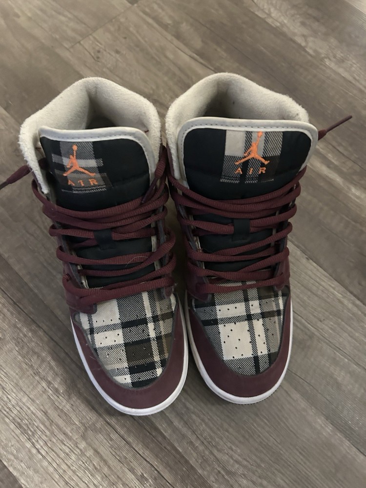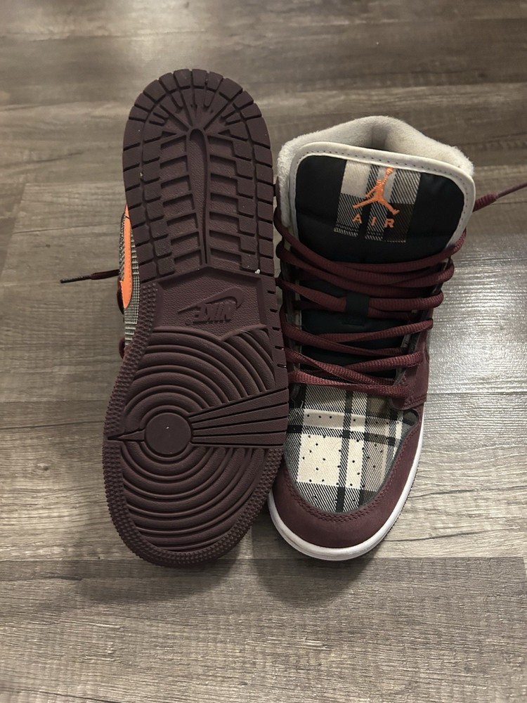 The Air Jordan 1 Mid SE GS "Plaid" sneaker in a Night Maroon Size 6y is a stylish and comfortable shoe for casual occasions. Featuring a round toe, lace-up closure, and rubber outsole, this shoe offers moderate cushioning and standard shoe width for a comfortable fit. The retro theme, leather upper material, and logo accents add a touch of flair to this athletic shoe from the Air Jordan product line. Perfect for summer, fall, or spring, this sneaker is ideal for basketball or everyday wear for both boys and girls.