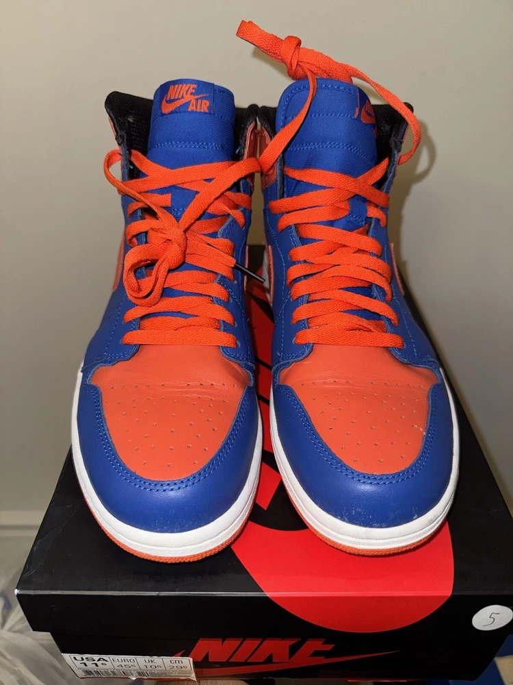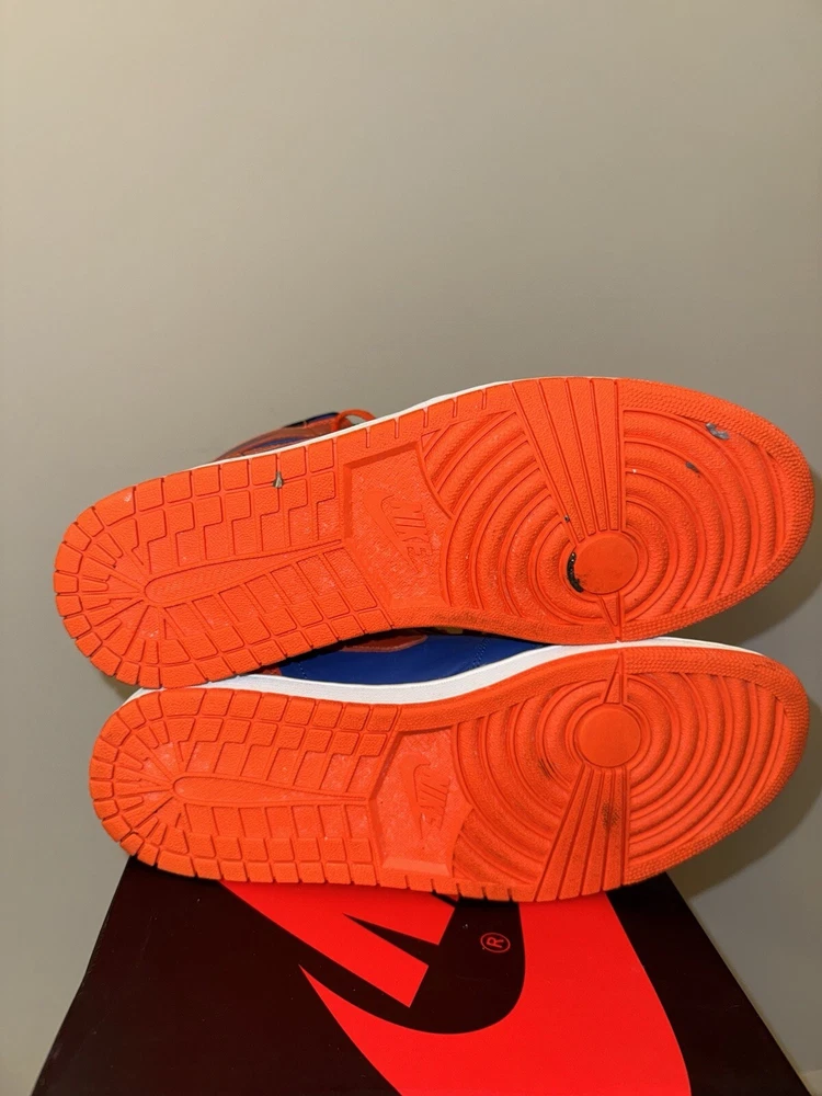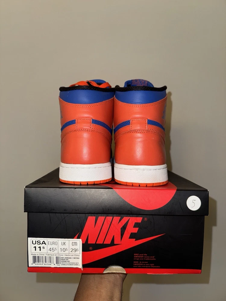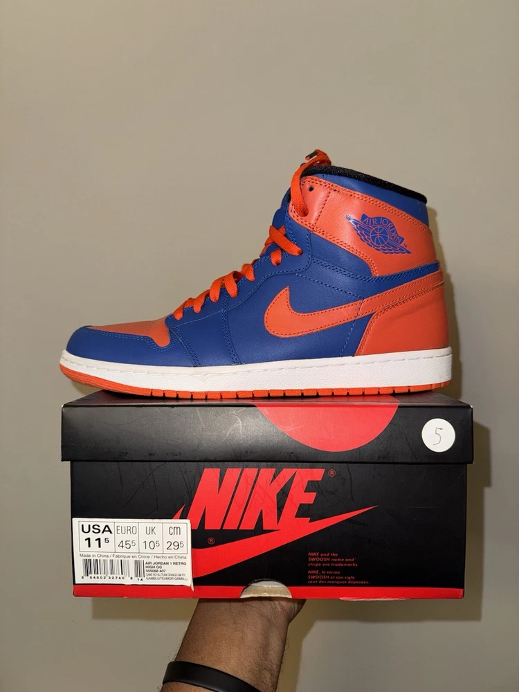 Elevate your sneaker game with these Air Jordan 1 Retro High OG "KNICKS" sneakers. These limited edition sneakers come in a vibrant orange colorway and feature a solid pattern. The high-top shoe shaft style and tie closure make these sneakers perfect for any occasion, whether it's activewear, casual wear, or workwear. These sneakers have a standard shoe width and are available in US size 11.5 and UK size 10.5. The synthetic upper material and foam insole material provide comfort and durability, making them suitable for gym and training, walking, cross-training, CrossFit, and basketball activities. These Air Jordan 1 High sneakers are a must-have for any sneakerhead who loves the 90s Knicks theme. Great condition