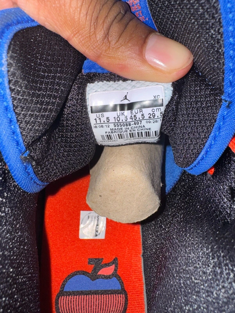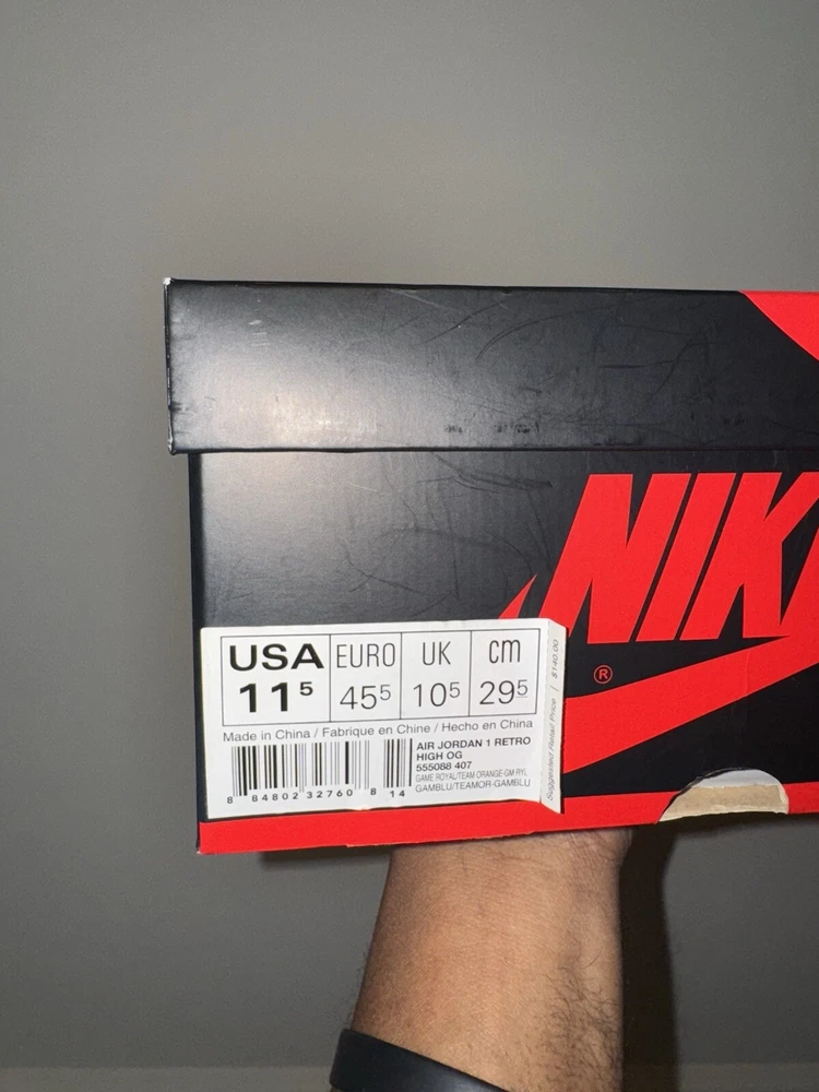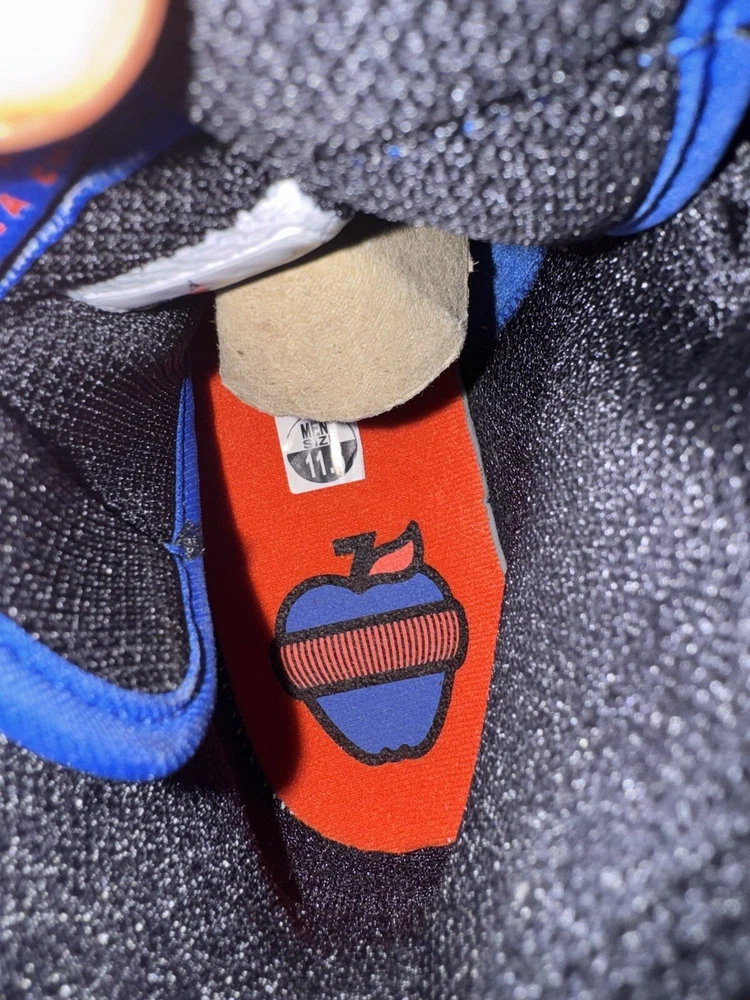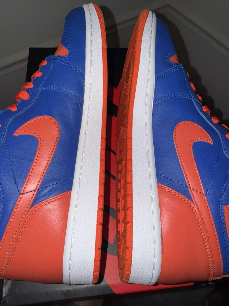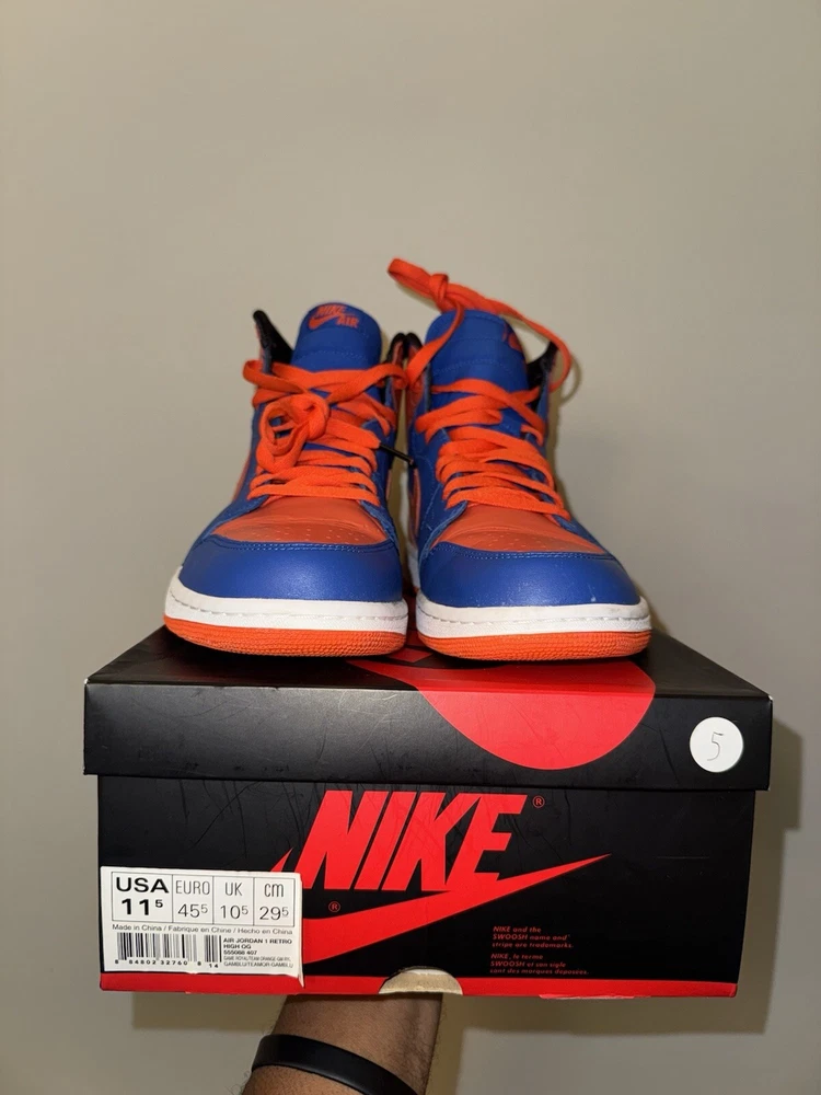 Elevate your sneaker game with these Air Jordan 1 Retro High OG "KNICKS" sneakers. These limited edition sneakers come in a vibrant orange colorway and feature a solid pattern. The high-top shoe shaft style and tie closure make these sneakers perfect for any occasion, whether it's activewear, casual wear, or workwear. These sneakers have a standard shoe width and are available in US size 11.5 and UK size 10.5. The synthetic upper material and foam insole material provide comfort and durability, making them suitable for gym and training, walking, cross-training, CrossFit, and basketball activities. These Air Jordan 1 High sneakers are a must-have for any sneakerhead who loves the 90s Knicks theme. Great condition