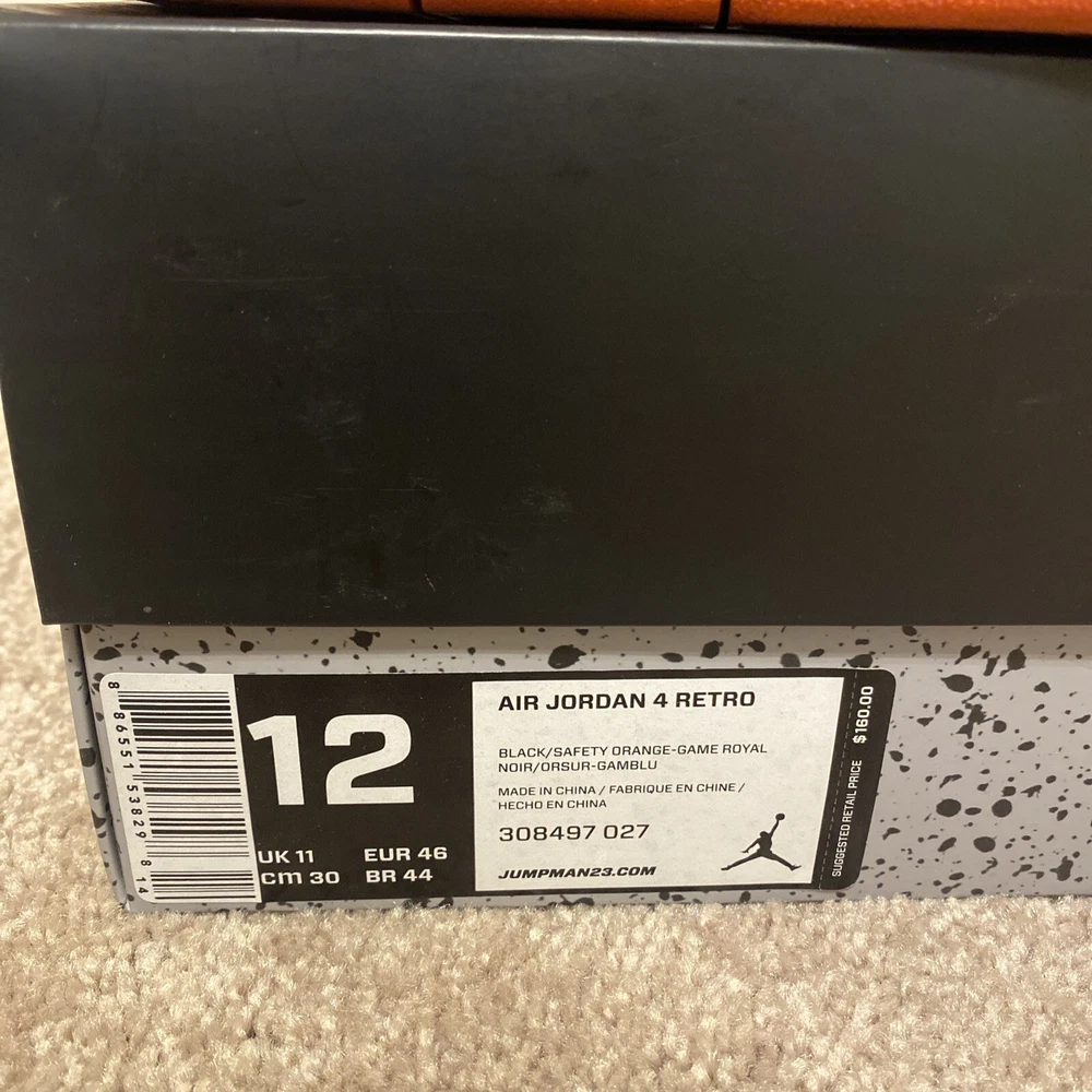 Selling my used size 12 cavs. Signs of wear include toe box creasing/scuffs, marks on midsole & outsole. Still in good condition & wearable. Extra orange laces included ——— Elevate your sneaker game with these Air Jordan 4 Retro Cavs. These stylish sneakers come in a classic black colorway with accents of safety orange and game royal. The nubuck upper material gives them a luxurious feel and the Cavs nickname adds a touch of personality. These sneakers are perfect for any athletic occasion and are sure to turn heads with their sleek design. The size 12 fit is ideal for men and the Air Jordan product line guarantees quality and style. Don't miss out on the chance to add these must-have sneakers to your collection.