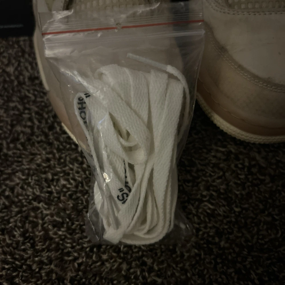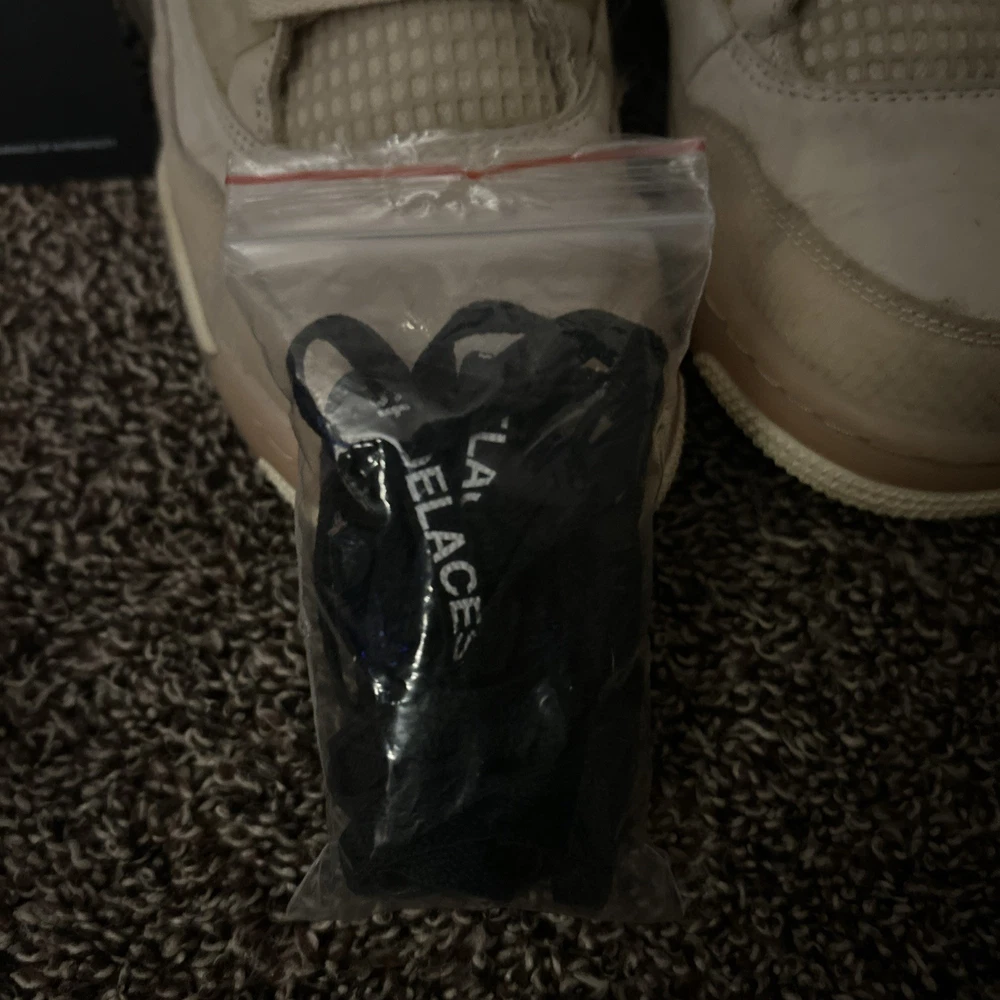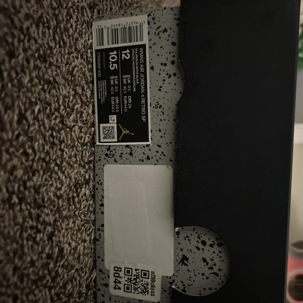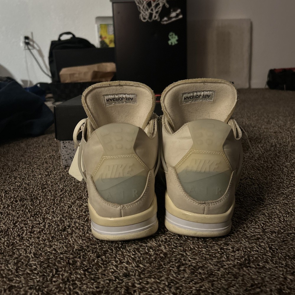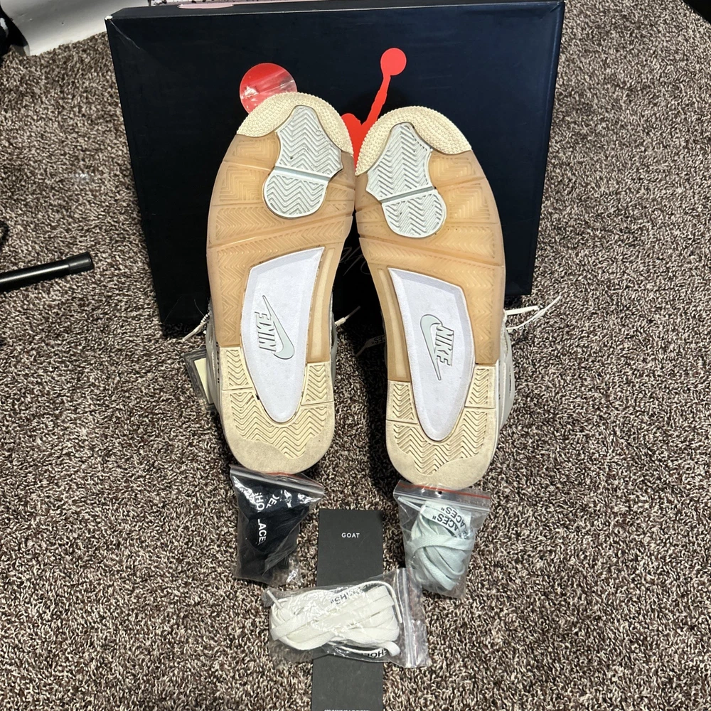 The Air Jordan 4 Retro SP Sail Off White in size 10.5M/12W is a stylish athletic sneaker with a mid-top shoe shaft style. Manufactured by Jordan in 2020, this beige sneaker features a unique color combination of Sail, Muslin, White, and Black. Perfect for women, this model is part of the Air Jordan product line and known by the nickname "Sail". With a classic Jordan style and comfortable fit, this shoe is a must-have for sneaker enthusiasts looking for a trendy and versatile addition to their collection.