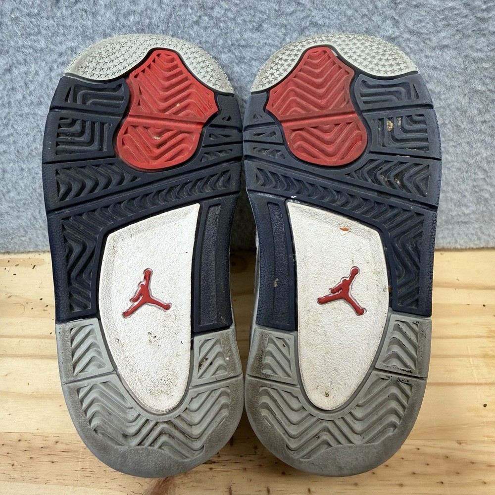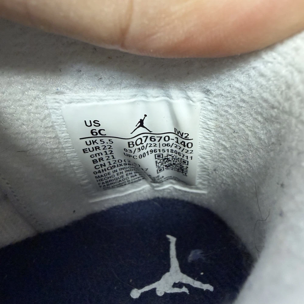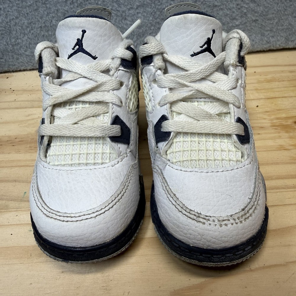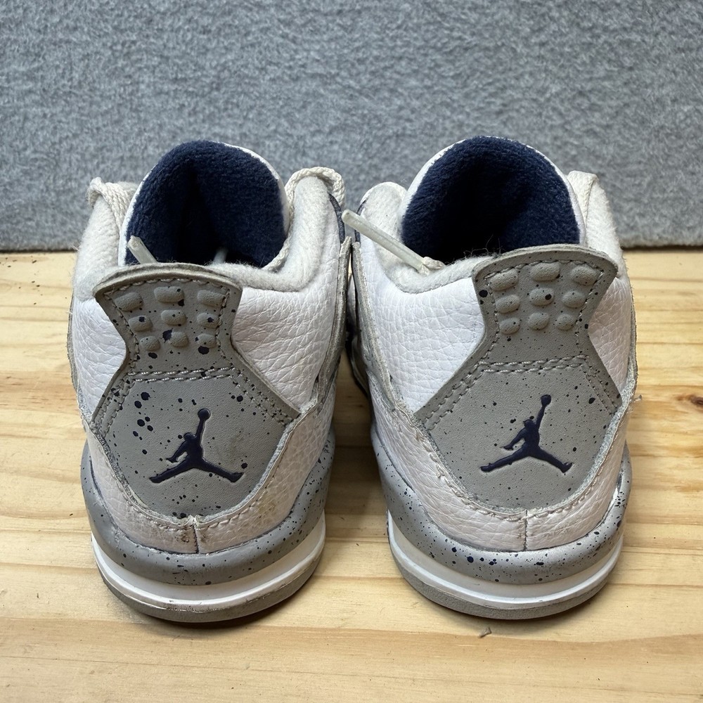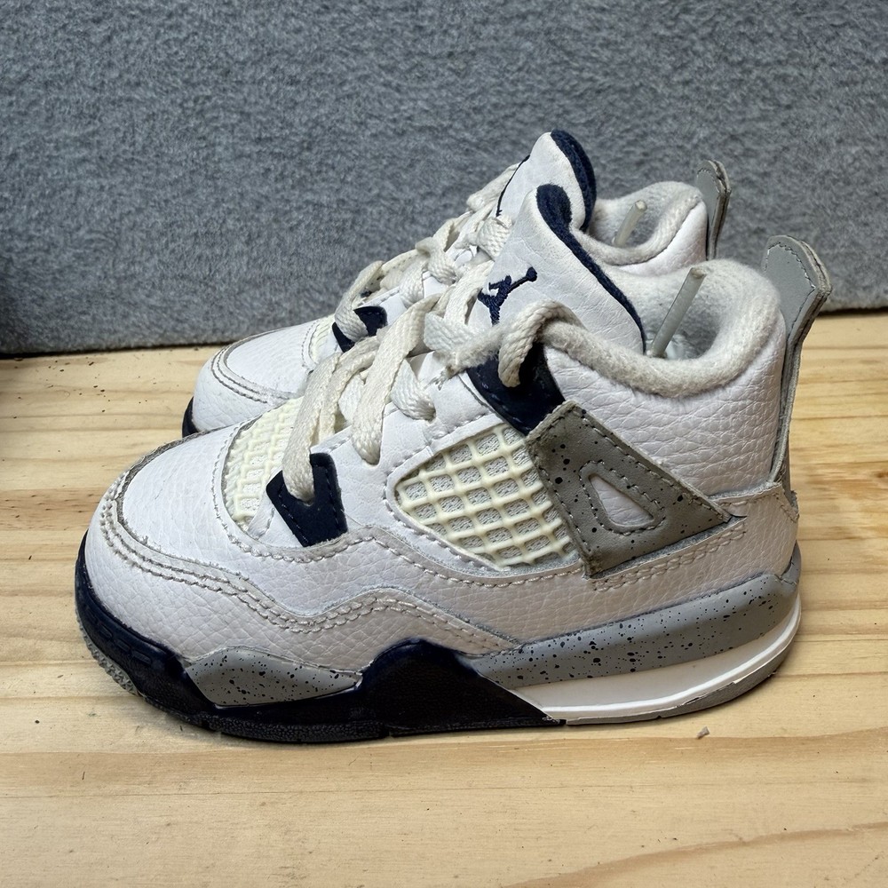 The product is a pair of Air Jordan 4 Retro TD Midnight Navy White Cement shoes in size 6C. These athletic shoes feature a retro theme with a midnight navy blue color and white cement accents. Made with leather upper material, these shoes are part of the Nike Air product line and are designed for boys in a casual boot type. Perfect for little ones who want to rock the iconic Air Jordan style.