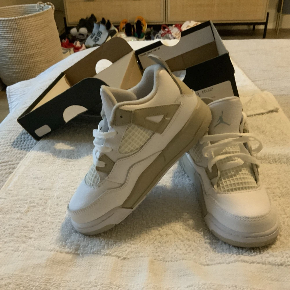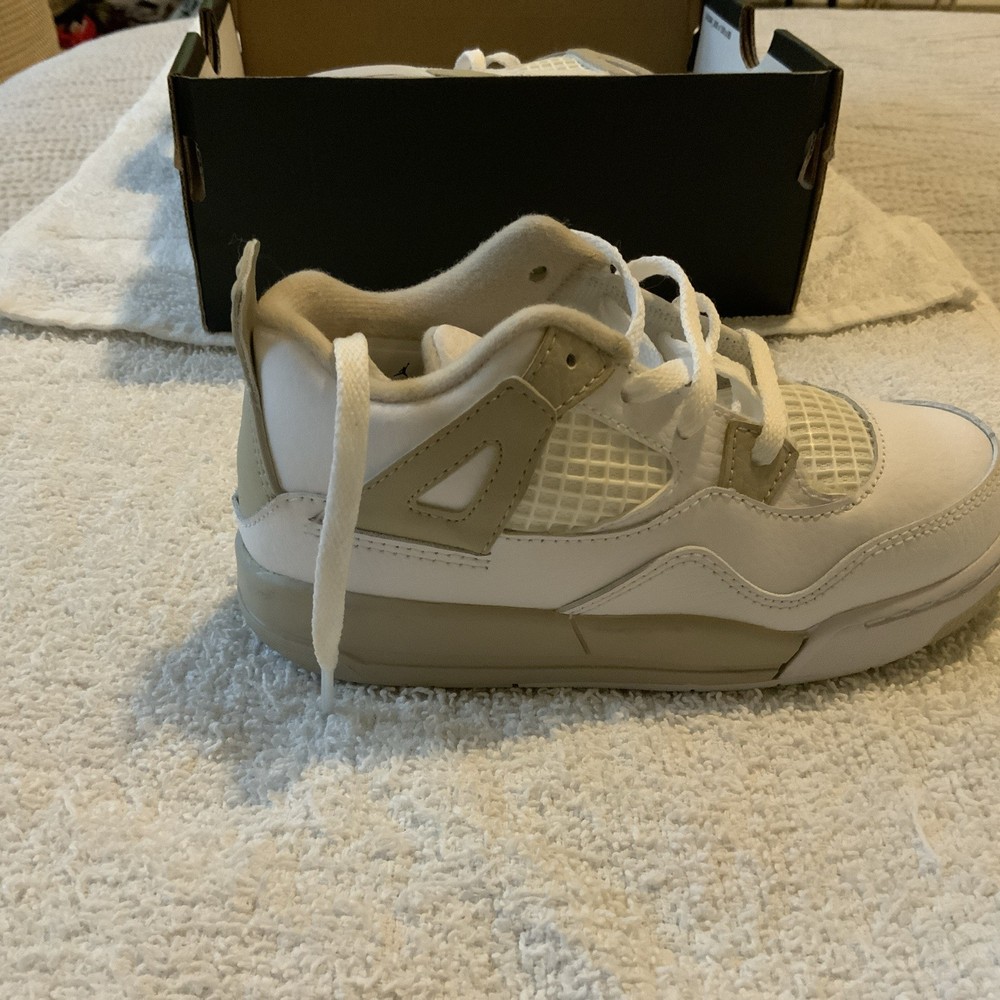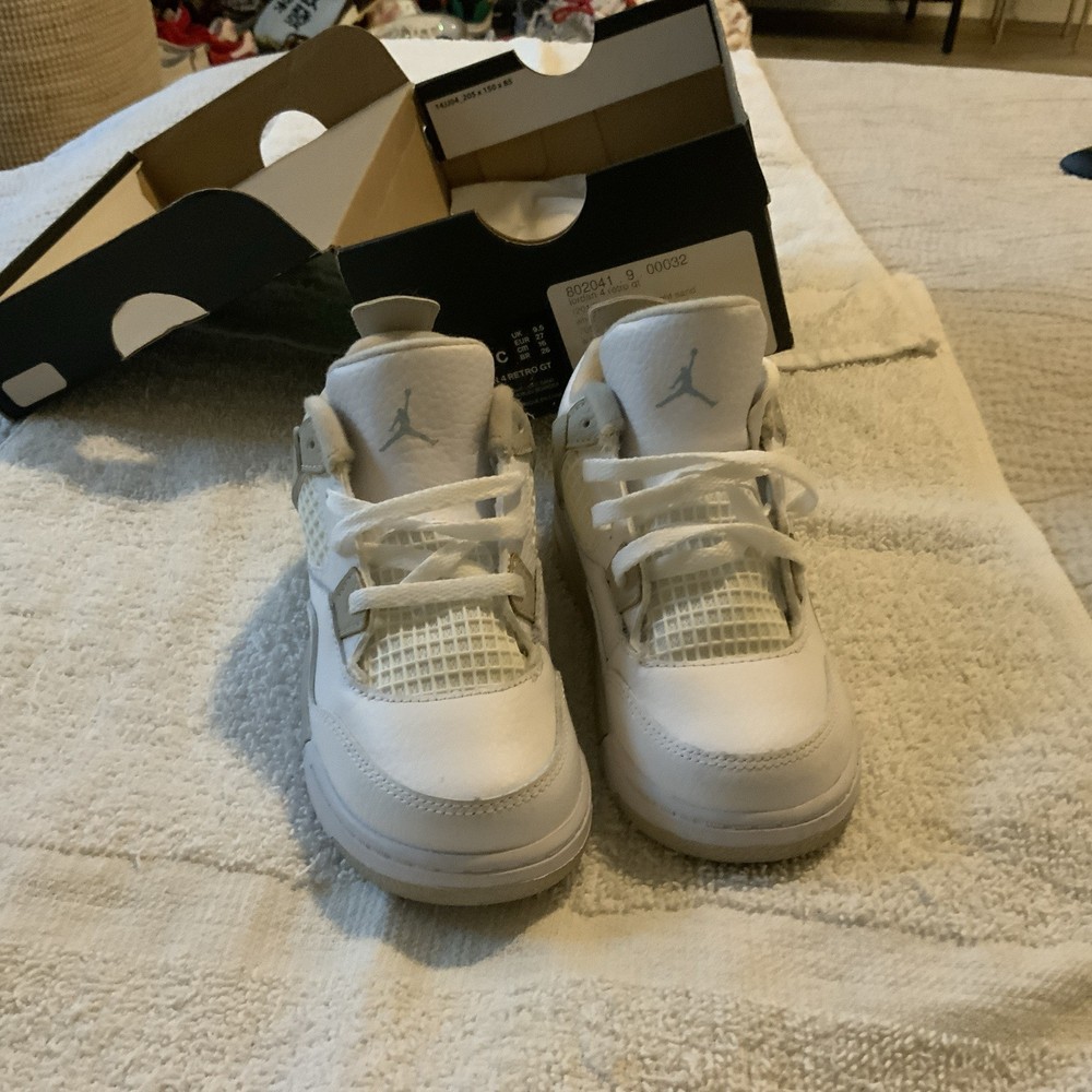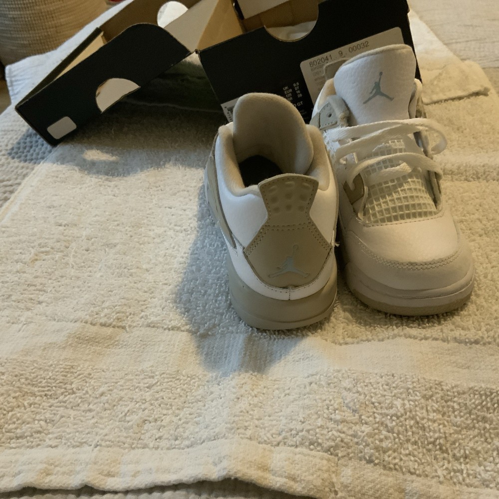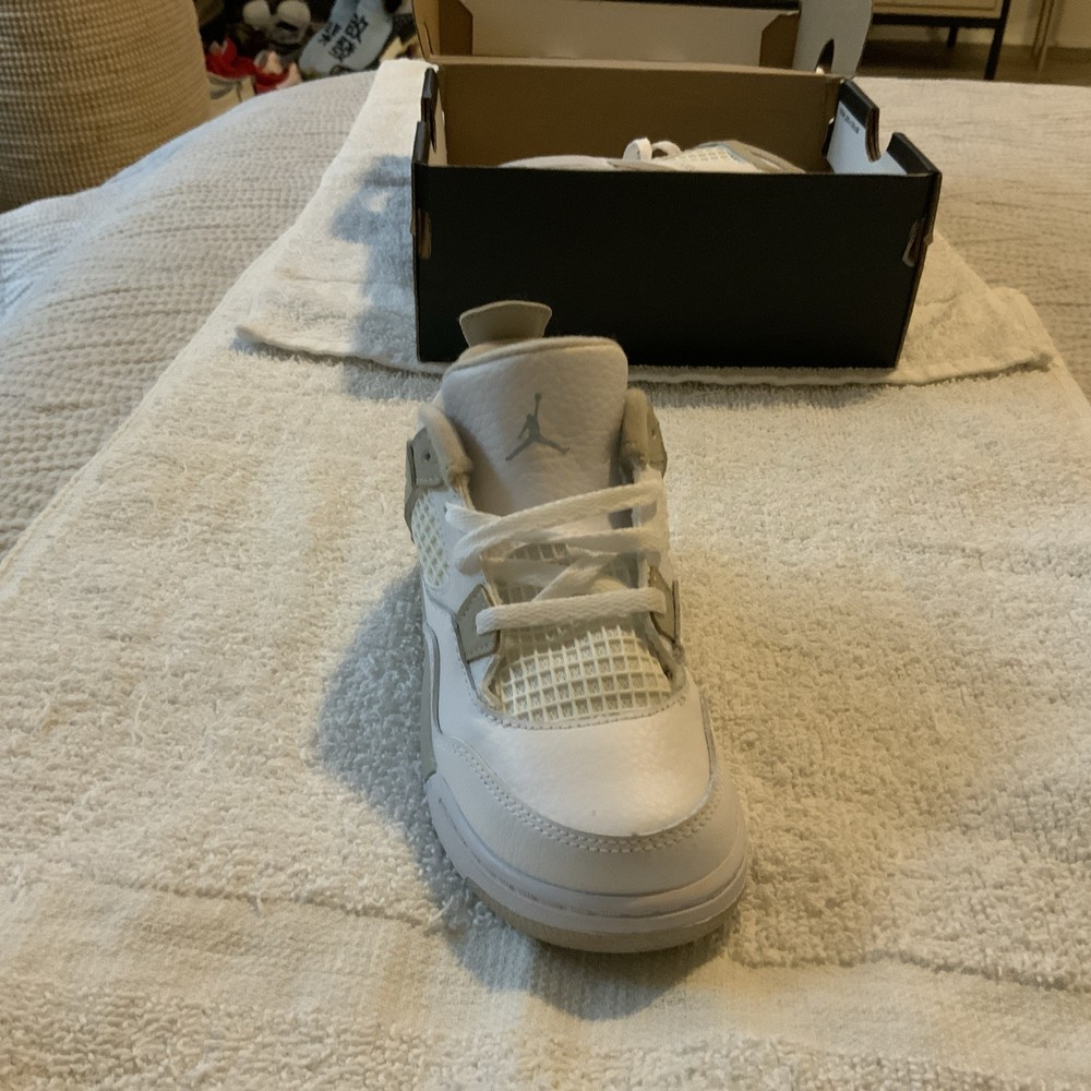 Toe Shape: Round Toe Style: Sneaker Upper Material: Leather Fabric Type: Blended Fabric Character: Boy Brand: Jordan Pattern: Solid Signed: No Color: White Department: Boys Vintage: No Occasion: Casual Closure: Lace Up Shoe Width: Standard Personalize: No Features: Comfort Insole Material: Foam Customized: No Pronation: Overpronation Performance/Activity: Basketball Handmade: No EU Shoe Size: 27 US Shoe Size: 10c Cleat Type: Rubber Cushioning Level: Moderate Outsole Material: Rubber Theme: Retro Season: Fall, Spring, Summer Type: Athletic Accents: Logo Model: Air Jordan 4