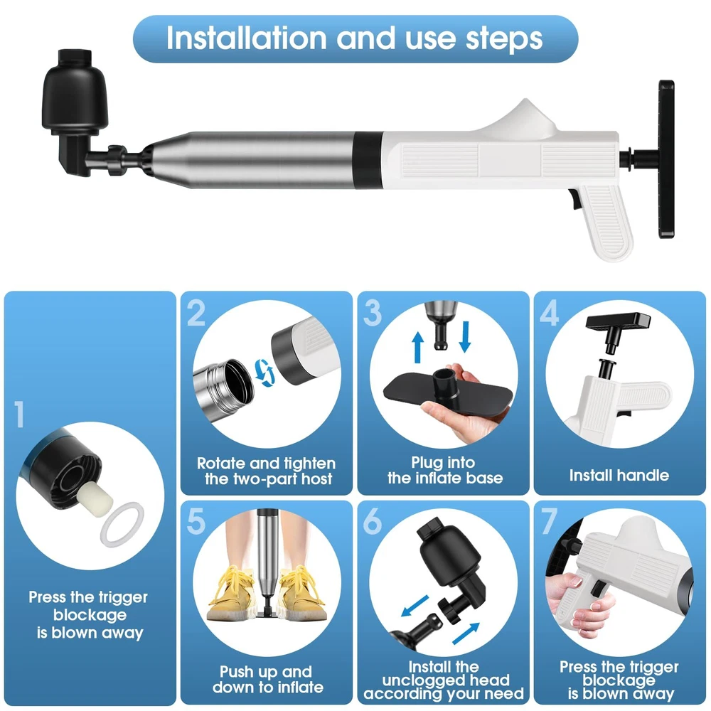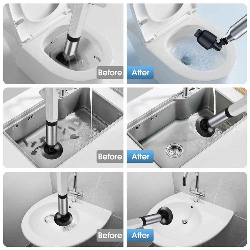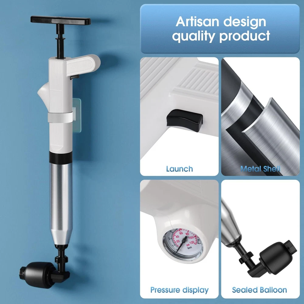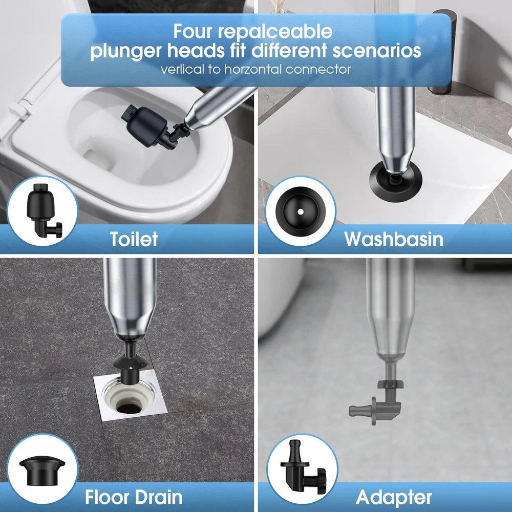High Pressure Air: Easily inflates up to 8 PSI, providing powerful performance to quickly unclog floor drains, showers, sinks, bathtubs, and other blocked pipes; effective for all bathroom needs Wide Applications: Includes five interchangeable plunger heads and an air pressure indicator; versatile for tackling various pipe clogs in toilets, kitchen drains, and more; ideal for multiple plumbing issues Easy to Use: Simple to assemble and operate; suitable for all users, including children and those with less strength; save time and money by avoiding plumber visits Thoughtful Design: Sealed balloon design minimizes splashing and mess; effectively cleans tough clogs without dirtying your home, making it perfect for both bathroom and kitchen clogs Stainless Steel Durability: Durable stainless steel tube ensures long-lasting use; includes a convenient storage hook for easy accessibility and readiness; ideal for use as a heavy-duty plunger for all types of clogs